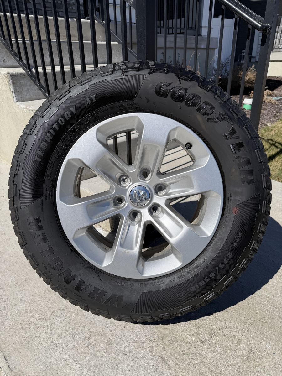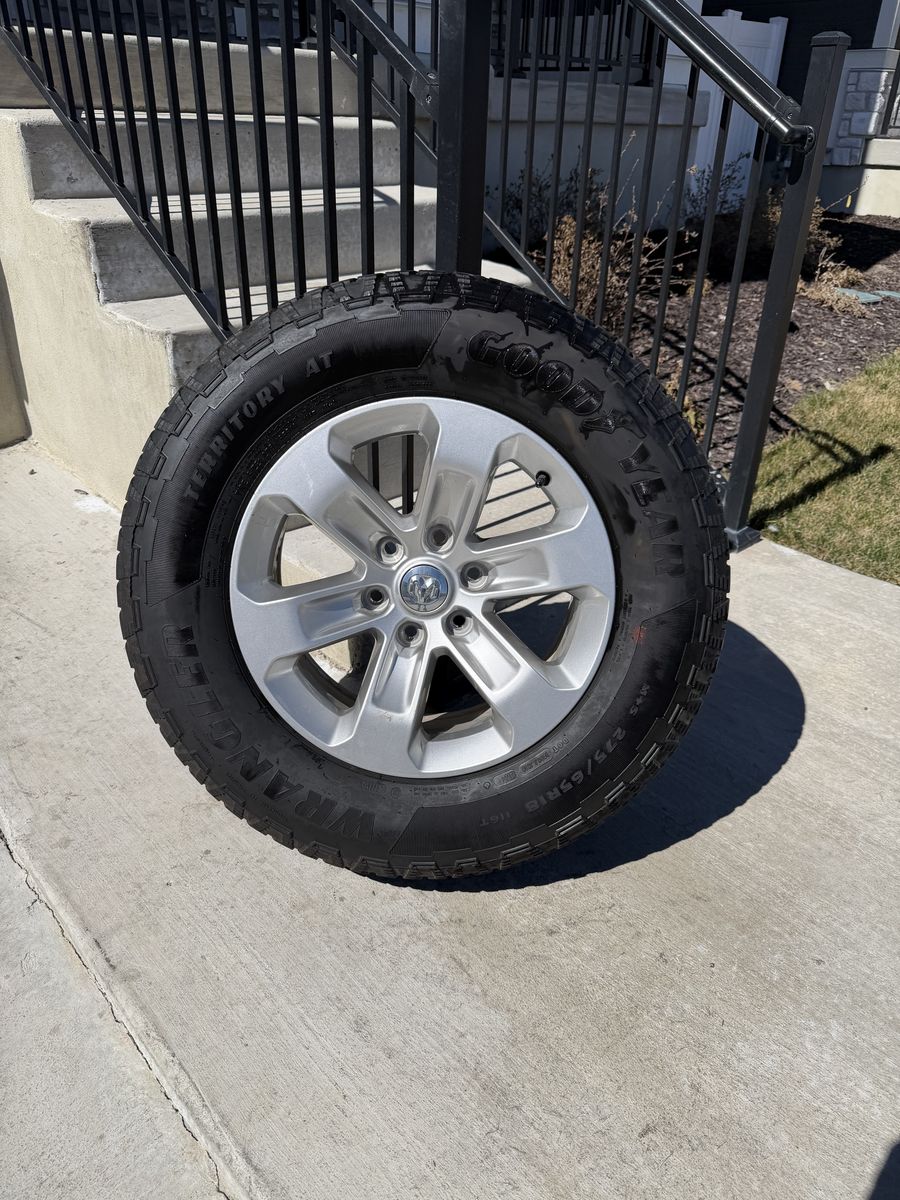 ApplePaySet of 4-Dodge Ram 1500 Rims and Tires 275/65R18 Goodyear Wrangler AT Almost new less then 1000 miles in excellent condition asking $1200 obo I can sell the rims or tires separately Bolt pattern 6-139.7 or 6-5.5 Text anytime 385-402-2292