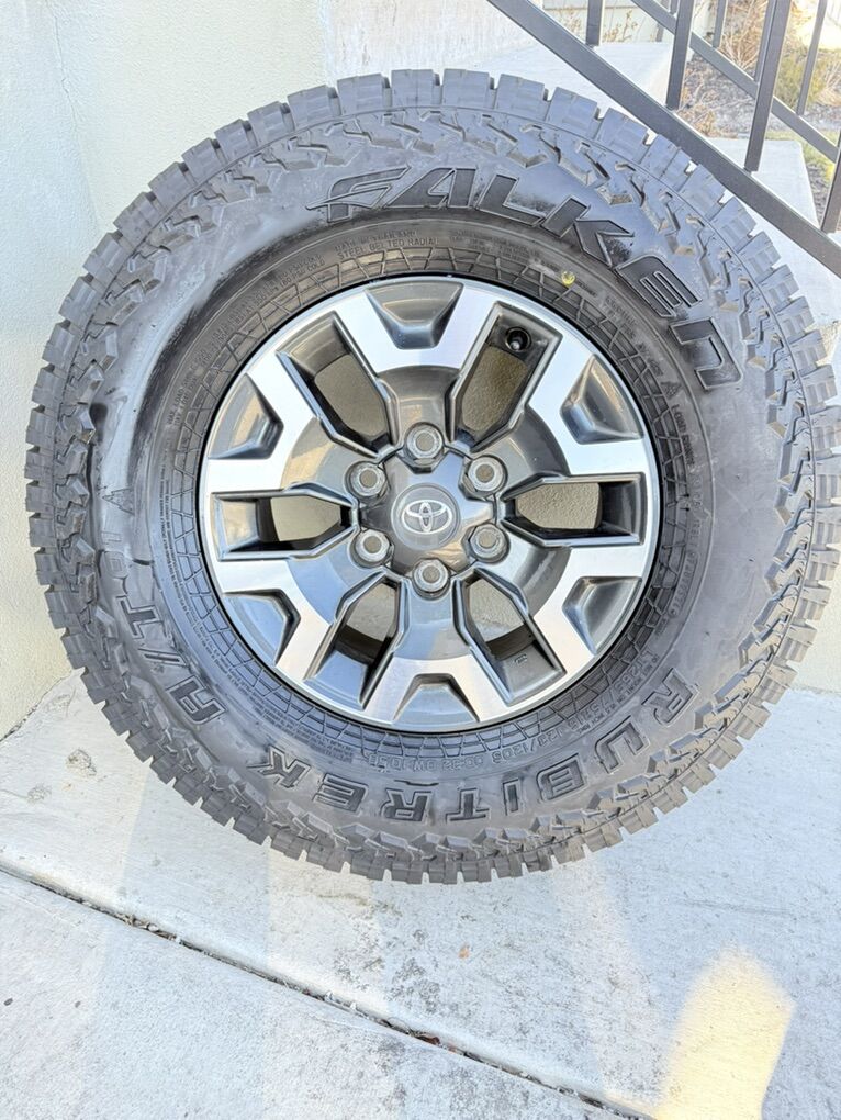 ApplePaySet of 4-Toyota Tacoma Rims and Tires 265/75R16 Falken Rubitrek load E New,in excellent condition,asking $1500 obo I can sell the rims or tires separately Tires are brand new Rims are in excellent condition no curb rash or scratches Bolt pattern 6-5.5 or 6-139.7 Text anytime 385-402-2292