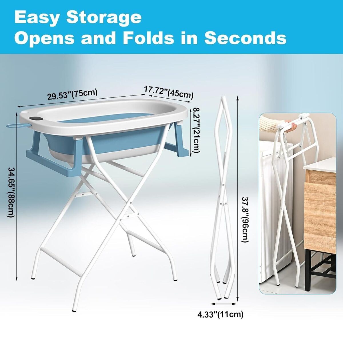 SpaceSaver Fold DesignBoth the frame and tub collapse in seconds to just 4.33″ wide, making storage and transport a breeze. Perfect for indoor showers, outdoor patios, or taking on the go.