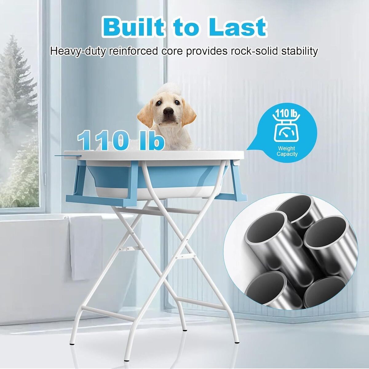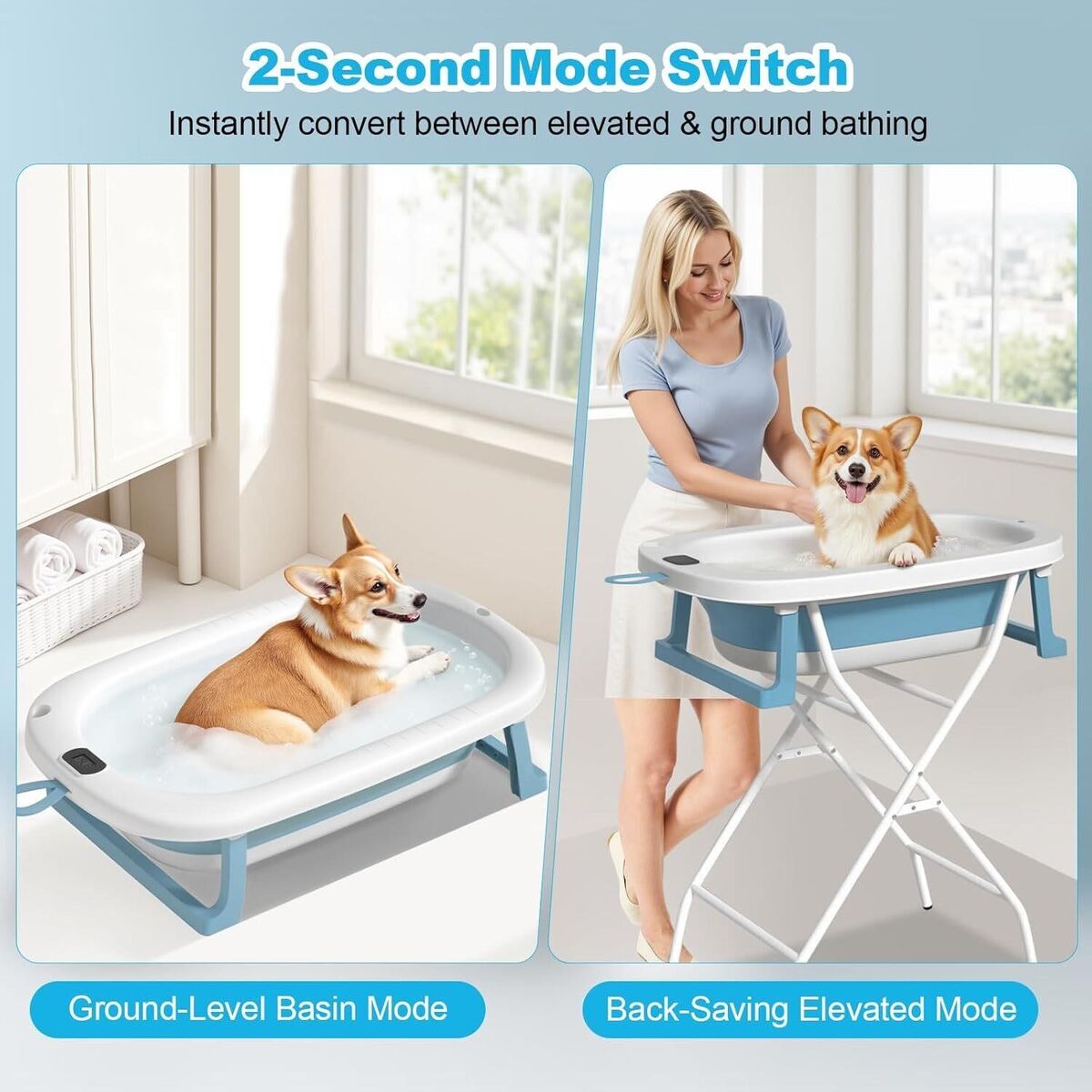 2-Height Flexibility: Stand or GroundWith a roomy 34.65″ × 29.53″ basin, it comfortably accommodates dogs and cats from 10 to 65 lbs—from Yorkies and Shih Tzus to Corgis, Bulldogs, and Poodles. Use the 34.65" stand to bathe standing up OR detach the tub for floor-level baths with anxious pets – holds 110lbs.