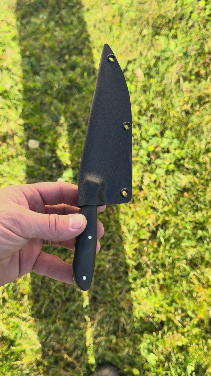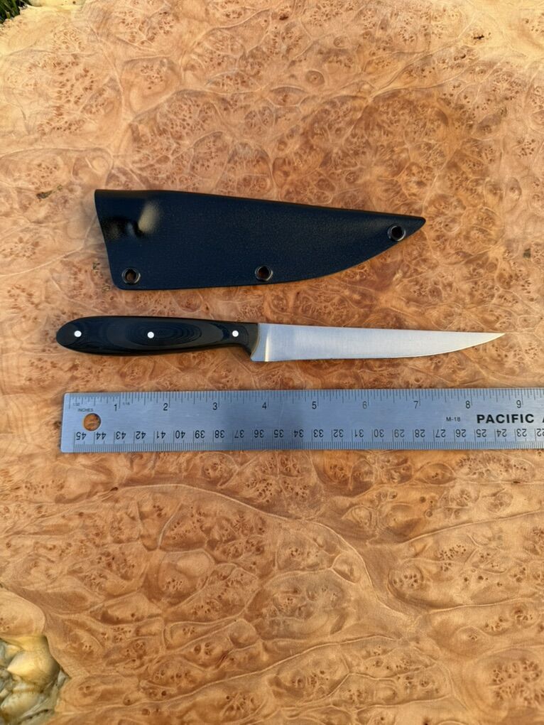 Panfish fillet knife in black grip fusion scales (G10 fused with rubber layers for extra grip even when wet!)Blade steel is satin stonewashed AEB-L stainless at 61 HRC. This is the perfect size knife for filleting perch, crappy or bluegill. They also make great small boning knives and kitchen pairing knives.