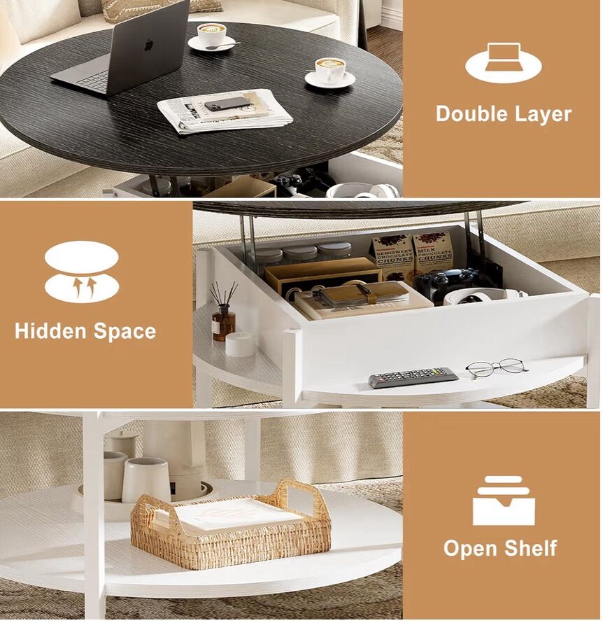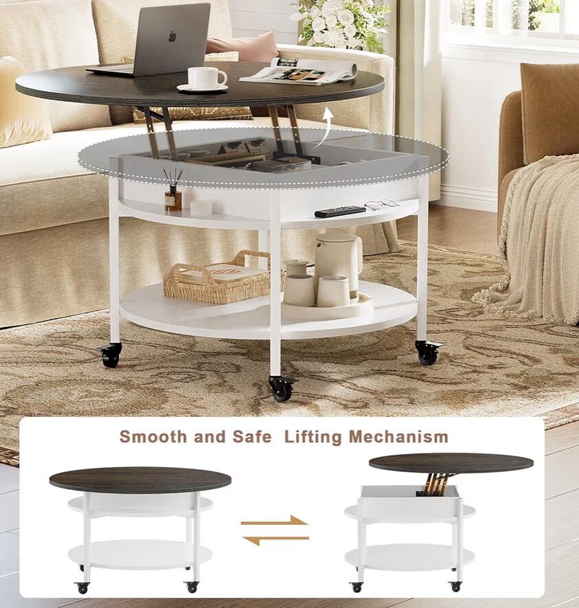 Wheel Design: Say goodbye to worries about moving or stability issues with this coffee table. This movable round coffee table offers the choice between smooth-rolling lockable wheels for easy mobility for height and stability. Adapt to any environment effortlessly, whether you need to move your table around or ensure it stays firmly in place Lifting Round Coffee Table: Elevating lift top coffee table can be easily lifted. Upgrade over the regular round coffee table, the FABATO coffee pop out table is equipped with a lift-up top for flexible use. The round wood table creates a sense of intimacy in your home and adds warmth and emotion when your family sits around it to watch TV or work 2 Tier Coffee Table: The small circle coffee table comes with 2 tier tabletop and hidden storage space. The top is 26.77’’, which provides spacious space for living room supplies and keeps your daily essentials nearby. The bottom tabletop is 23.3’’, gives you extra space to store magazines, snacks, knick-knacks, and makes your room tidy Multifunctional: Well designed small table can be used as a coffee table, cocktail table, end table, sofa table, accent table, work table, etc. It can match any style of living room, reception room, or farmhouse room. It’s well with your taste and interior decor. The circular coffee table on wheels can also be placed on your balcony, allowing you to leisurely enjoy your time Easy Assembly: This adjustable height circular coffee table with casters is simple to set up. Tools and instructions needed are provided, allowing easy assembly