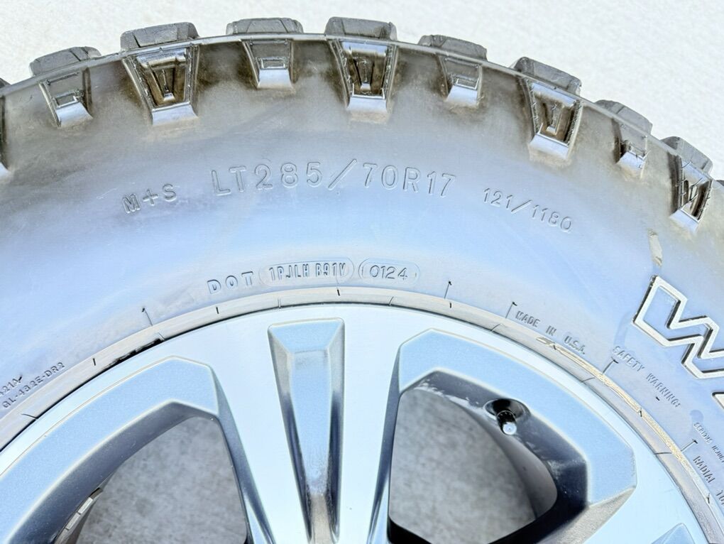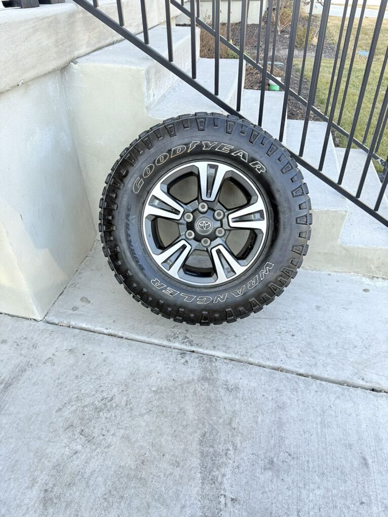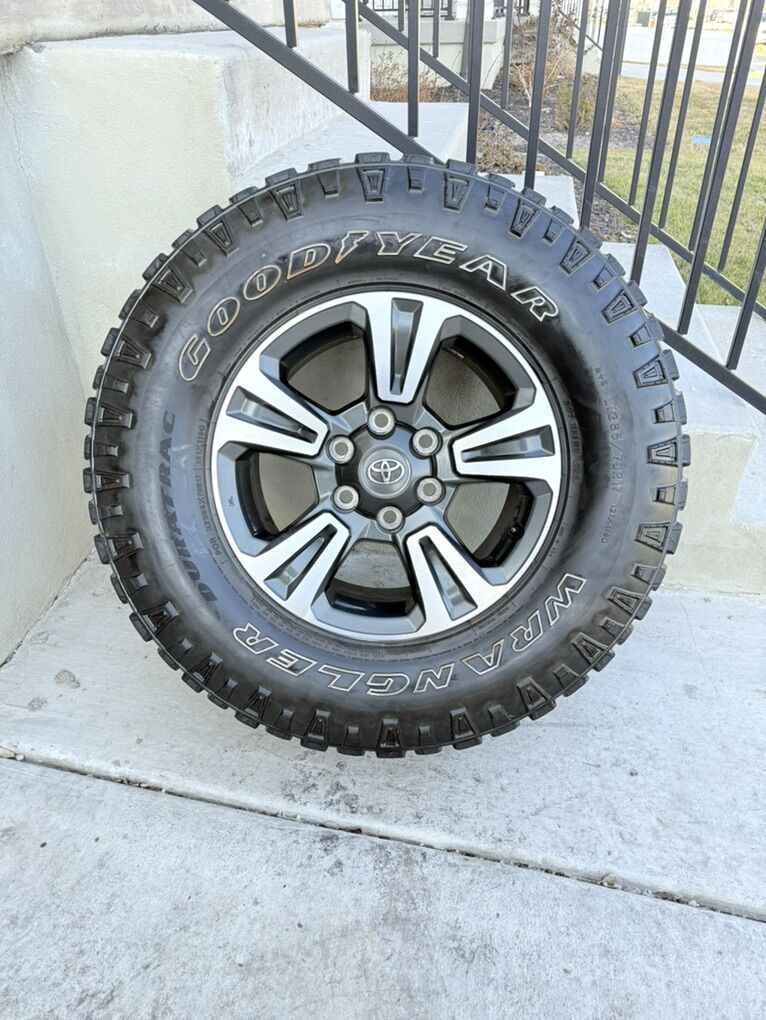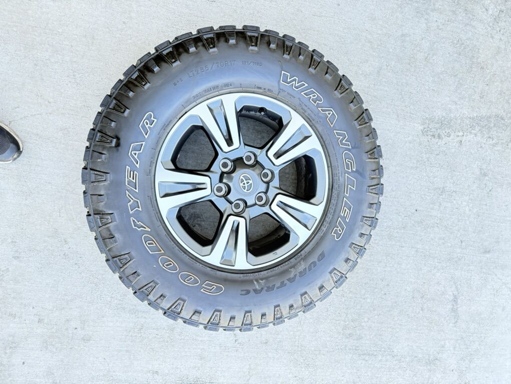 ApplePaySet of 4-Toyota Tacoma 4Runner Rims and Tires 285/70R17 Goodyear Wrangler Duratrac Load E in good condition,lots of tread on the rims,asking $1250 obo Rims are in great condition no curb rash Bolt pattern 6-5.5 or 6-139.7 They will fit Toyota Tacoma 4runner FJ Cruiser Tundra and Sequoia Text anytime 385-402-2292