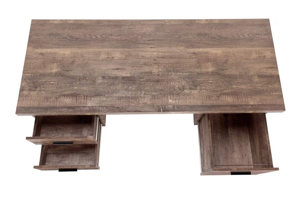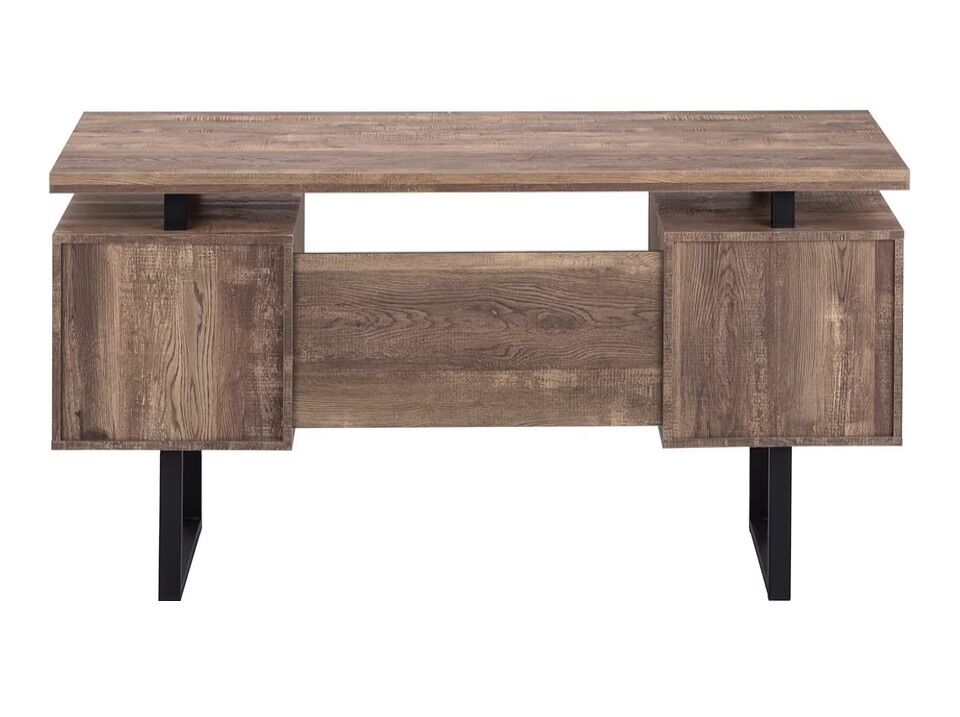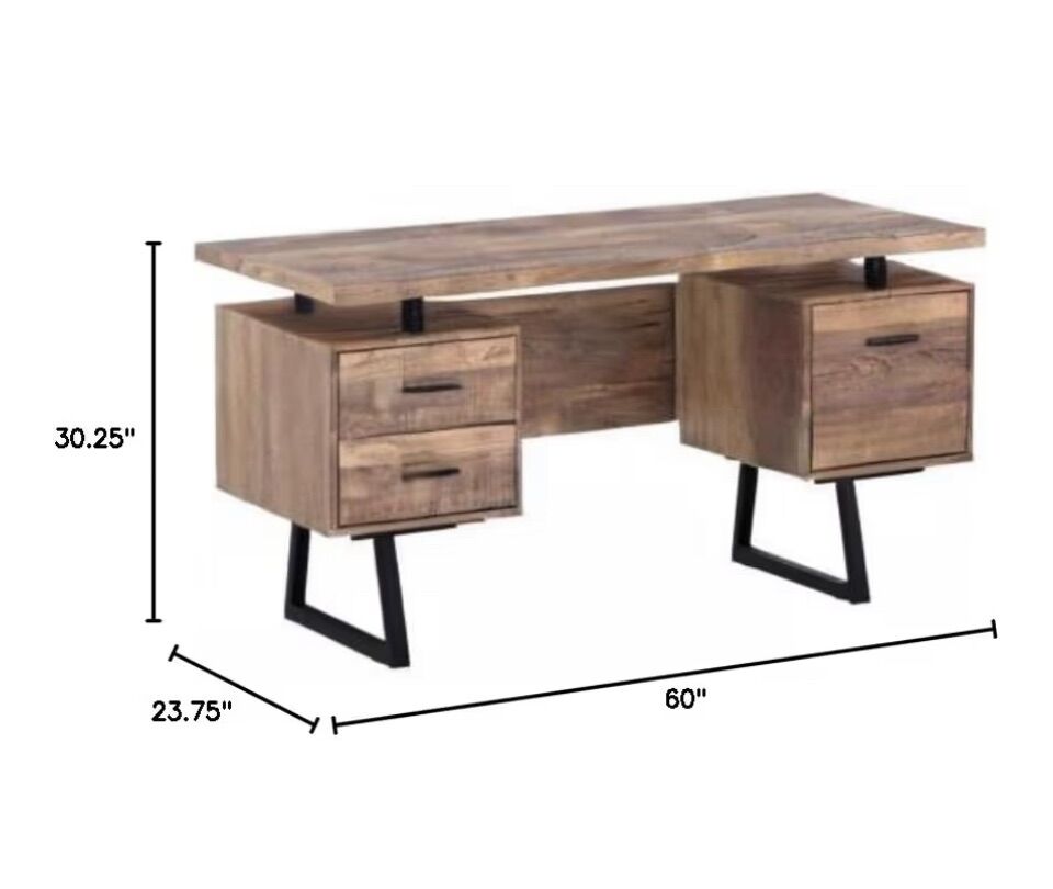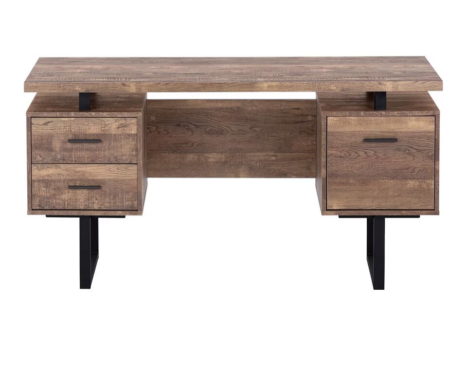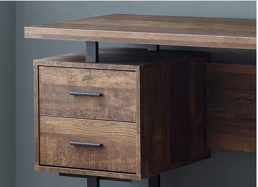 Brand Monarch Specialties Shape Rectangular Desk design Computer Desk Product Dimensions 23.75D x 60W x 30.25H Color Brown Reclaimed Wood Look Style Contemporary Polyester Blend Large floating top work surface with sleek black metal legs Two storage drawers with contemporary black colored accents 1 spacious filing drawer for standard/legal docs Sophisticated brown reclaimed wood-look finish on all sides to place anywhere in a room Desk Measures: 60 inches L x 23.75 inches W x 30.25 inches H