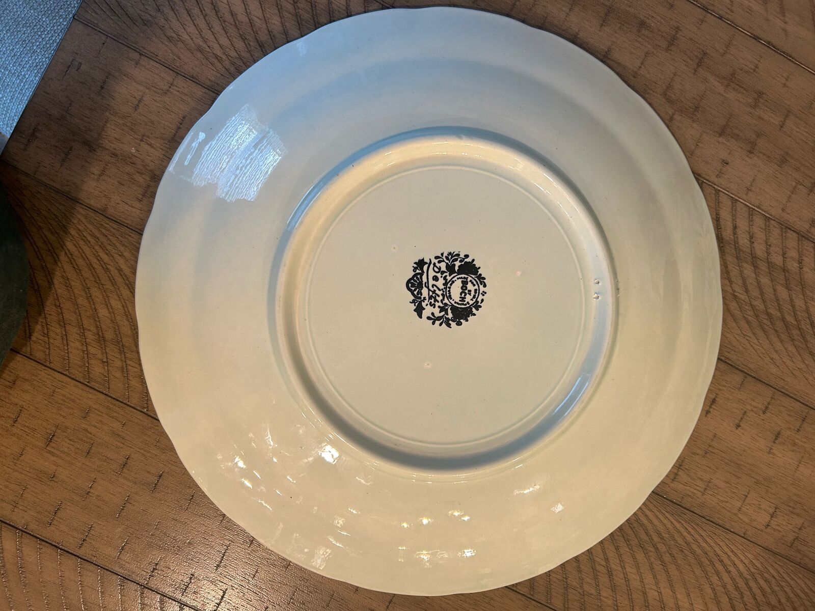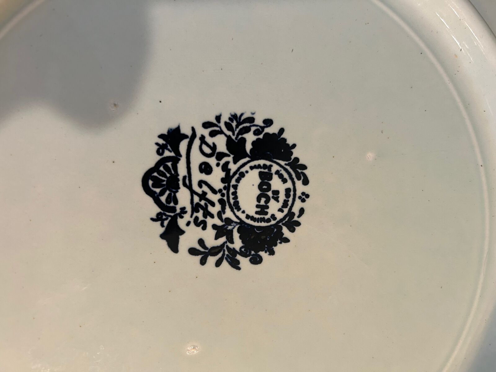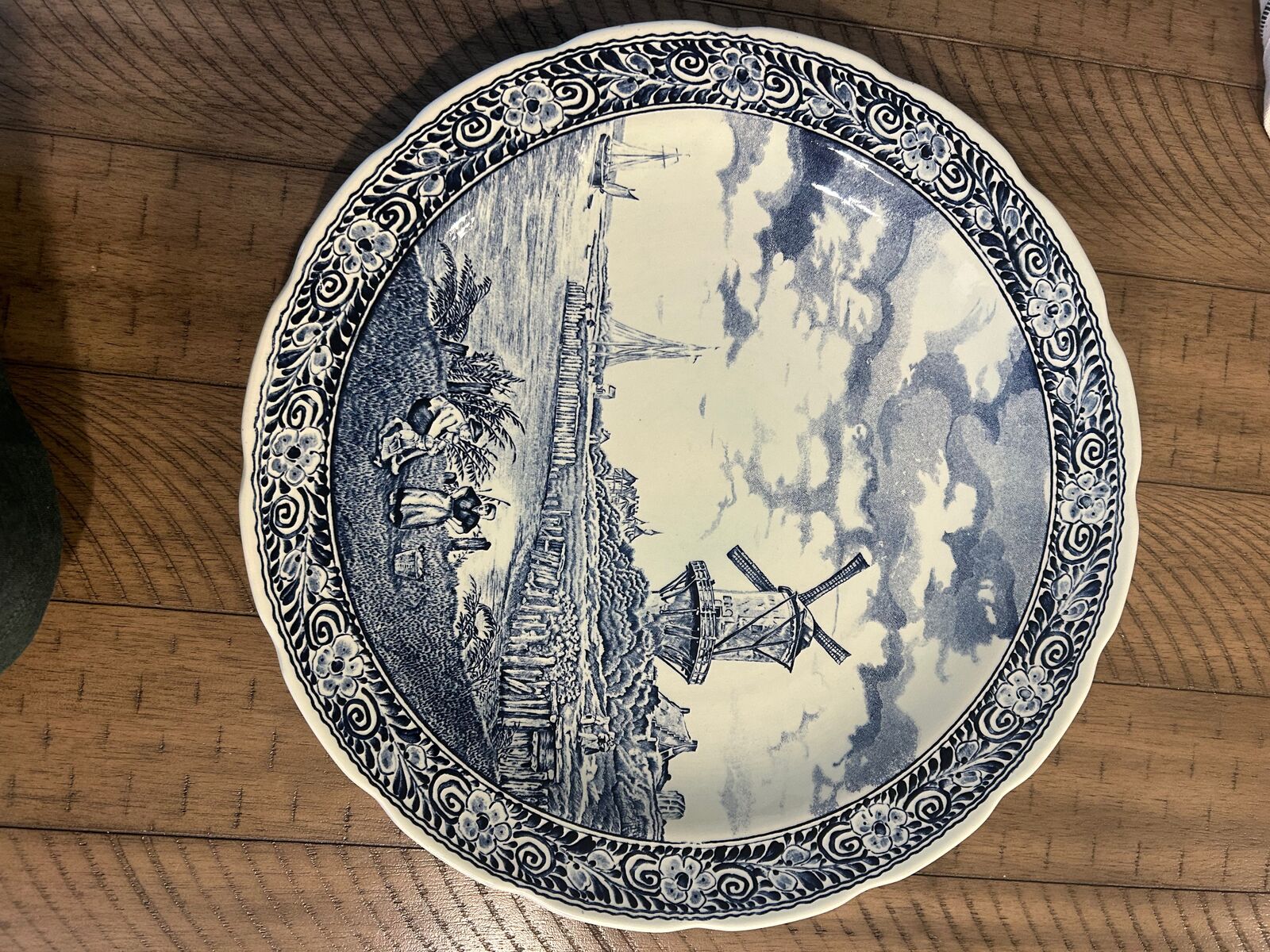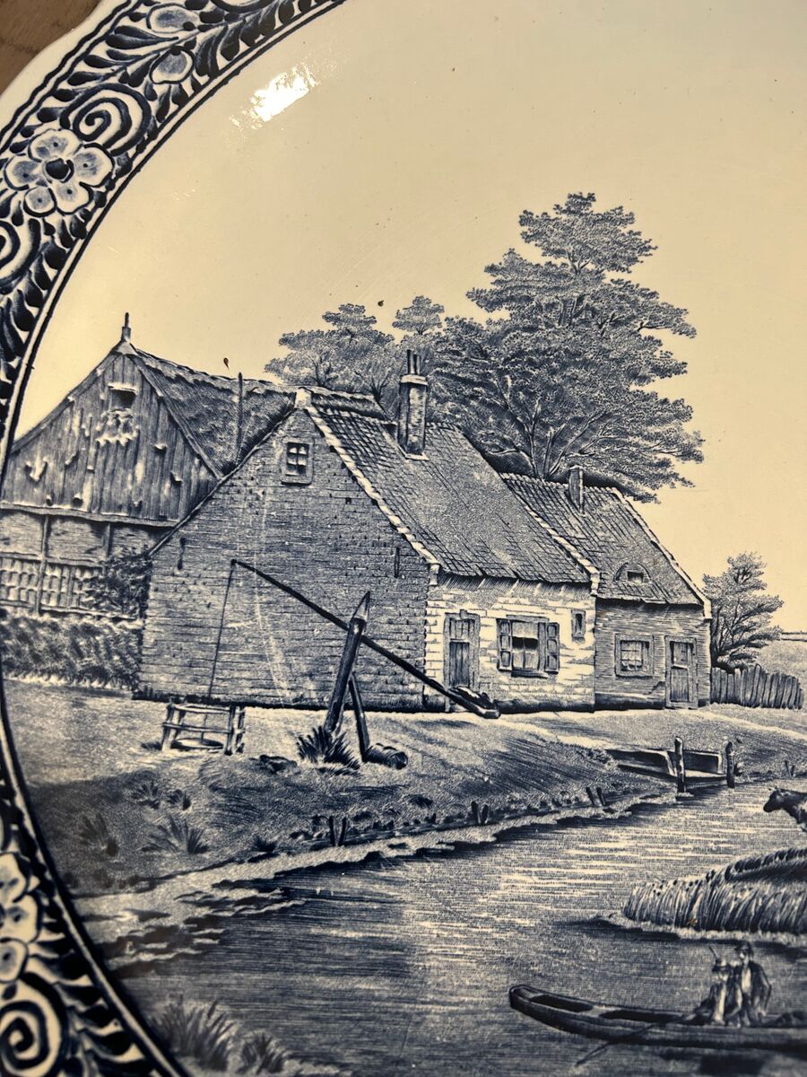 Two large Delft wall plates, Royal Sphinx by Boch from Holland. One features a Windmill and family. Another features a farm house and canal. It is signed by the artist Sonneville. Plates are 15 1/5"