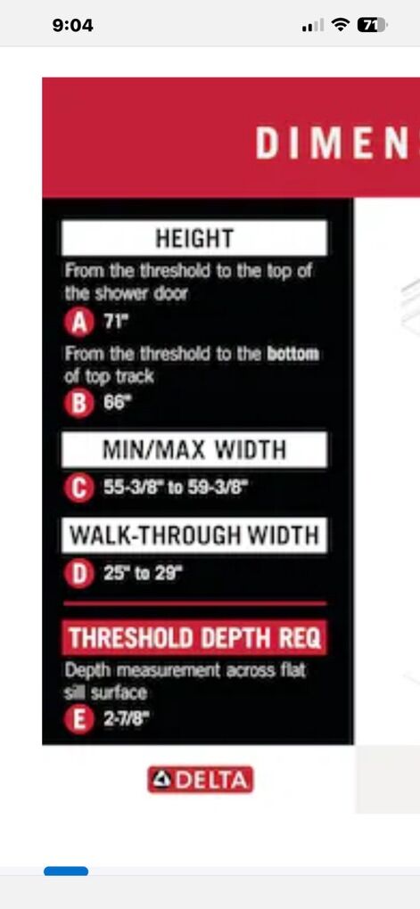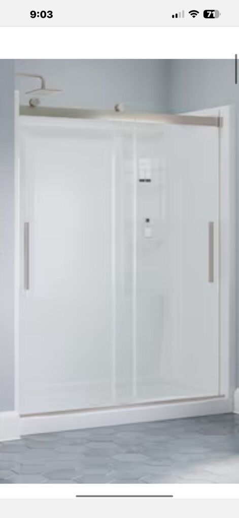 The EverEdge shower door draws on the precision and crisp forms of modern architecture. Clean lines, slim vertical handles, and plenty of transparency lend a bright airiness to your bathroom. Upgraded 8mm glass panels provide a substantial feel with a comfortable slide. Spot Guard technology keeps your glass sparkling. This proprietary coating resists water spots and other unsightly build-up to make cleaning effortless. UPGRADED GLASS: 5/16-in (8 mm) certified tempered glass shower door feels sturdy but moves smoothly KEEP THE SHINE: Water-repelling Spot Guard coating resists hard water stains, soap scum, and lime scale for a quicker clean and lasting shine SMOOTH GLIDE: Center track guide comes standard on all doors for smoother, quieter slide FIT: Requires opening width of 55-3/8-in minimum to 59-3/8-in maximum (140.7-150.8 cm) and 71-in (180.3 cm) threshold to top of door; Offers walk-in width of 25 to 29 in (64-74 cm), 66-in height threshold to the bottom of the top track ATTENTION: Studs required 2-1/2-in from front surface of the sill for support, minimum threshold (sill) depth: 2-7/8-in (7.2 cm), minimum height clearance (sill to ceiling): 73-in (185 cm); design allows for out-of-plumb conditions up to 3/8-in CLEAR GLASS: Crystal-clear glass gives the most open and spacious feel STYLISH HANDLE: Vertical handles provide a streamlined look WHAT’S INCLUDED: All hardware and install instructions included.