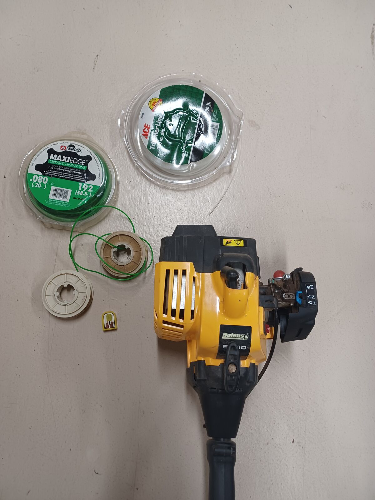 Bolens 2-cycle gas trimmer, 16” curved shaft, Model BL110. Operator’s Manual, lots of extra trimmer line and 2 extra spools included. Purchased in 2018 and in very good condition. Asking $30.