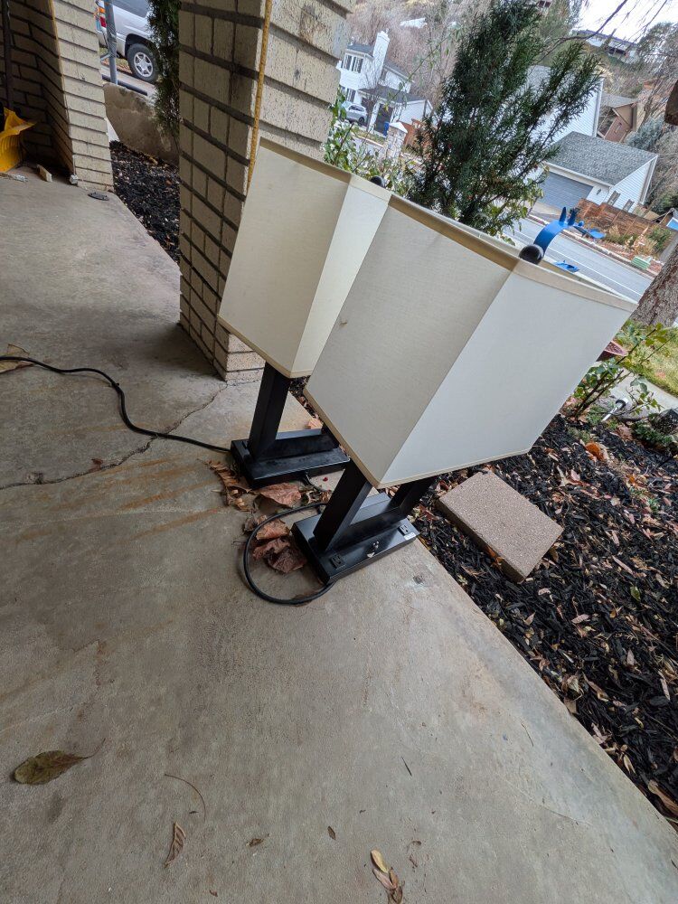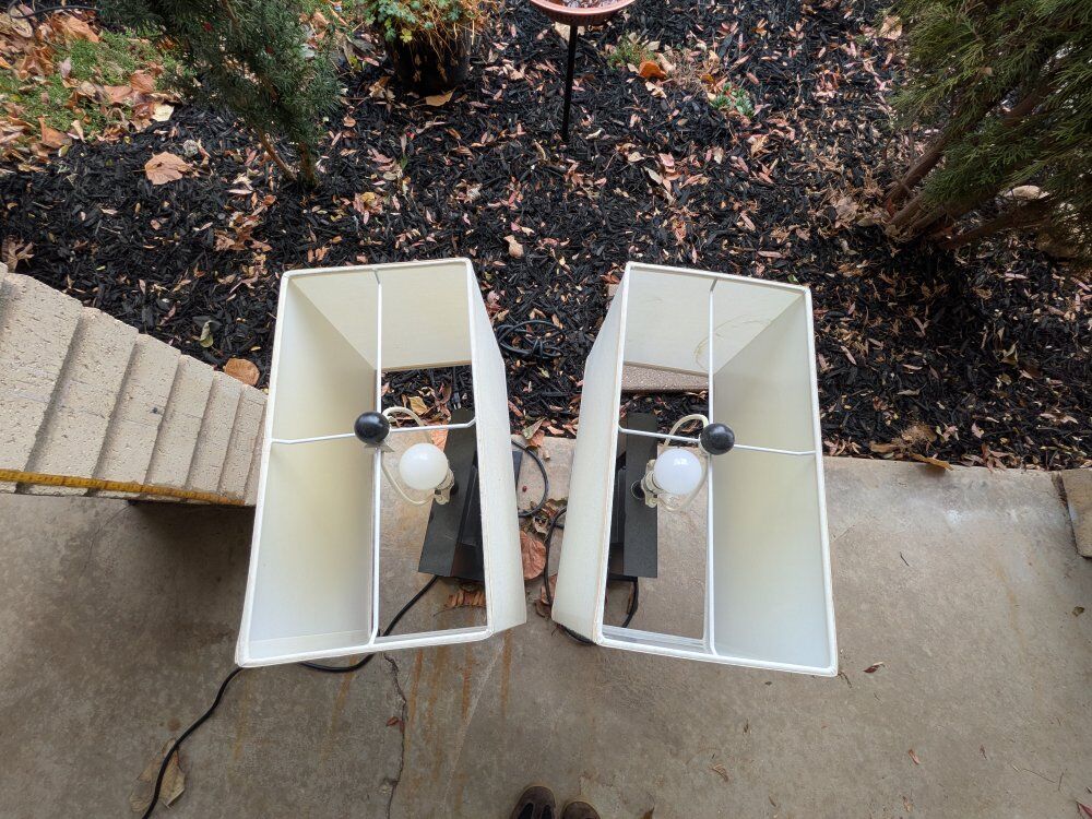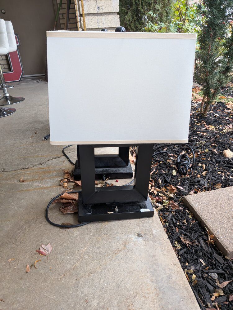 PayPal2 lamps, black base with two plugs and light switch, (ivory) white lamp shade, good bulbs, and great condition.
