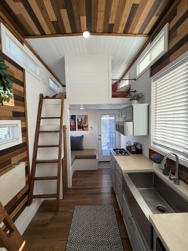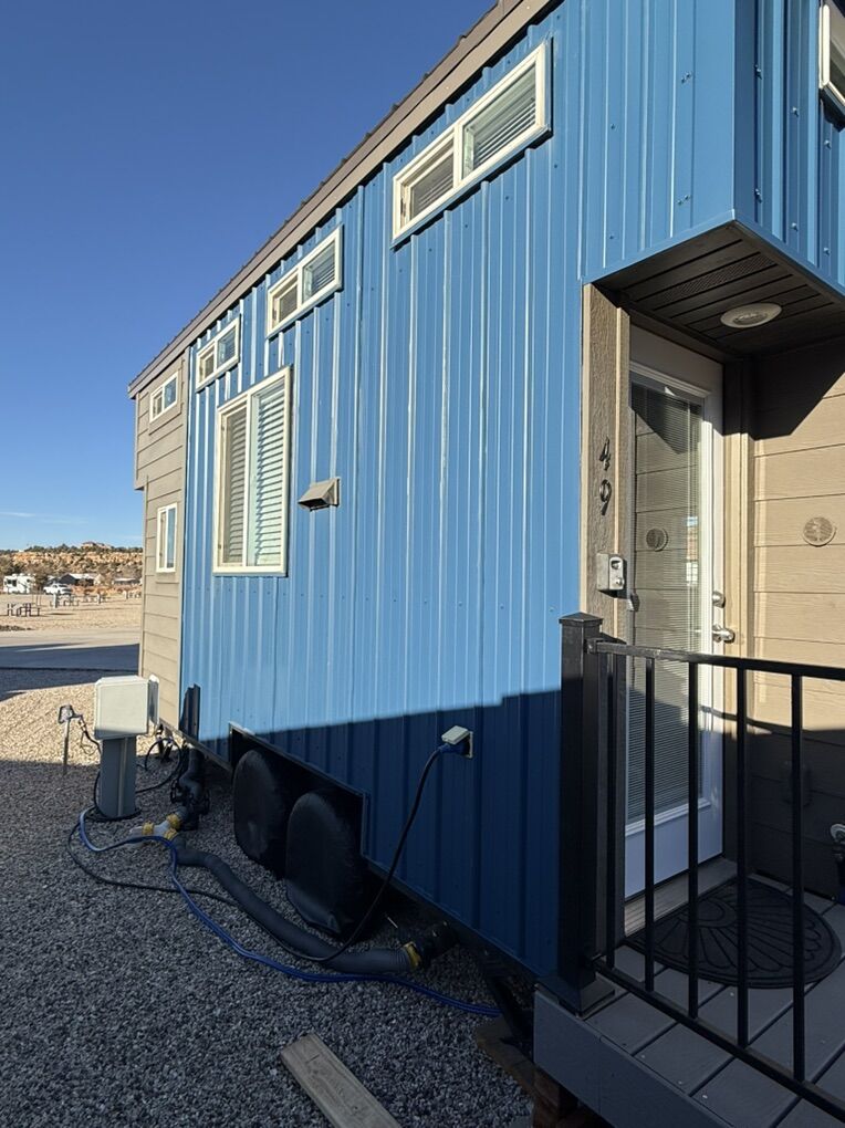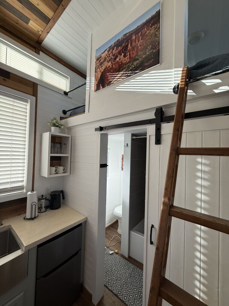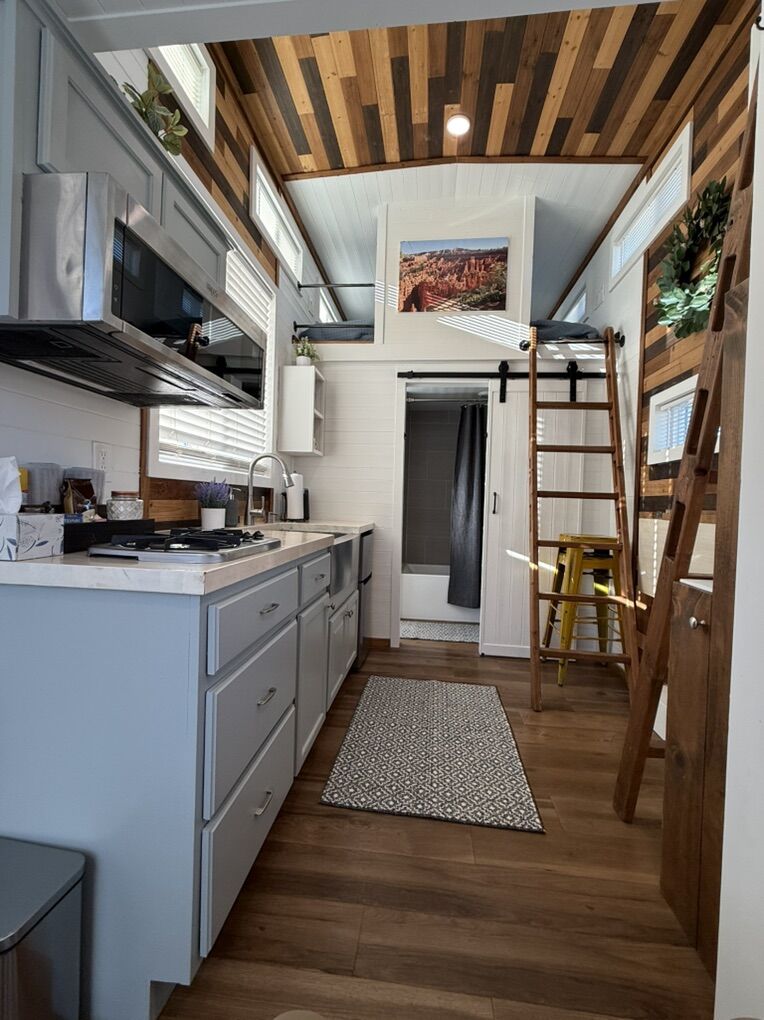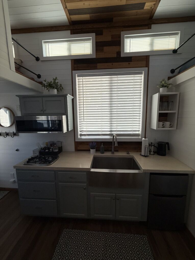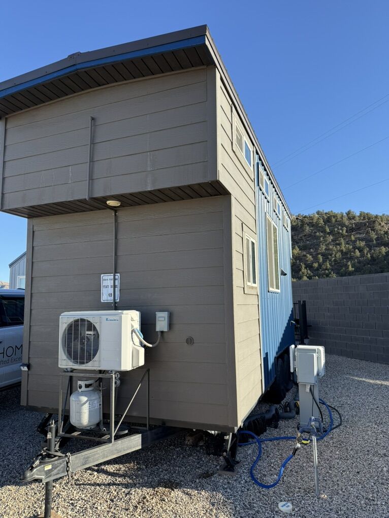 This is a 2019 tiny house on 21’ travel trailer chassis. The Anne tiny house RV is a luxury off grid or on grid model designed for ultra comfort. You will feel at home whether your off the beaten path, in the comforts of a cozy RV park or parked behind your house for an ADU (additional dwelling unit) for use as a rental or Airbnb. The Anne weighs just under 11,000 pounds and can be towed comfortably behind a 3/4 ton pick up truck. It is made to sleep 4 adults comfortably. It comes with built in solar panels that can power up a solar generator of your choice or be plugged in shore power on a 30 amp RV outlet for easy hookup. It is also electric generator ready so that you can run it off grid if needed. When you want heating or cooling simply turn on the 110 volt mini split with in shire power or a generator. It comes with a 45 gallon fresh water tank and an on demand hot water heater. It has a maintenance free metal panel and cement board exterior. It comes with a full sized bathtub shower combo and regular toilet. It has 2 TV’s with dvd player in each of the sleeping quarters.