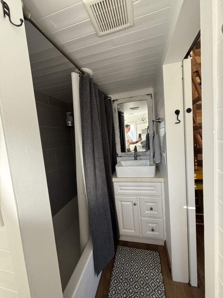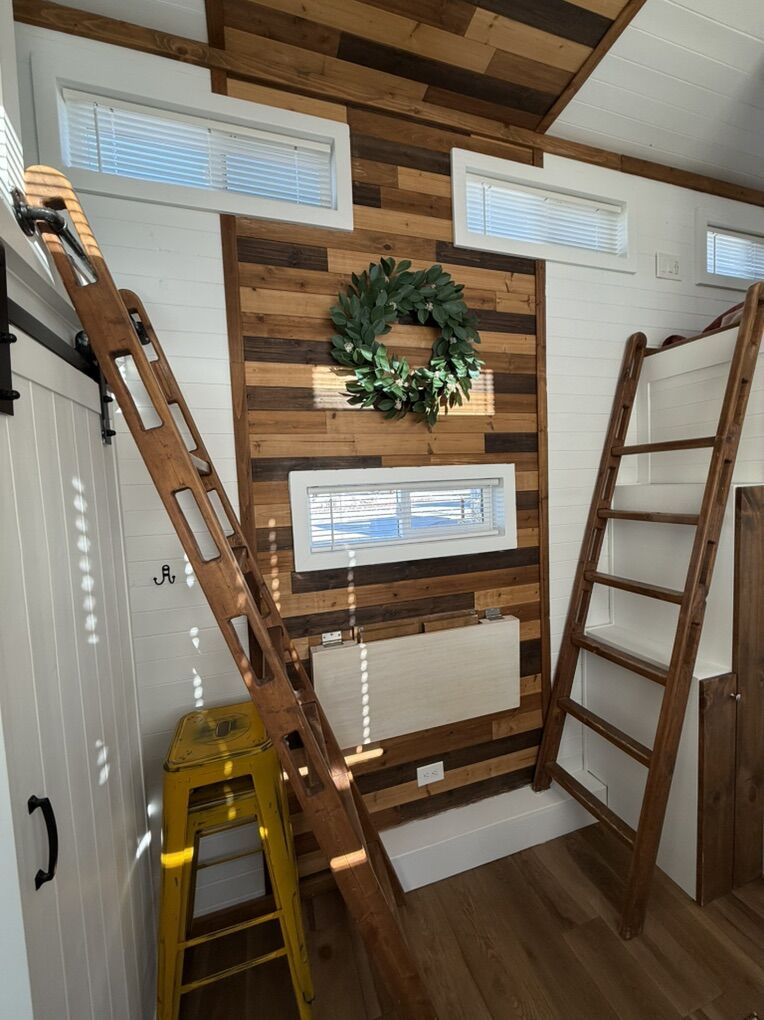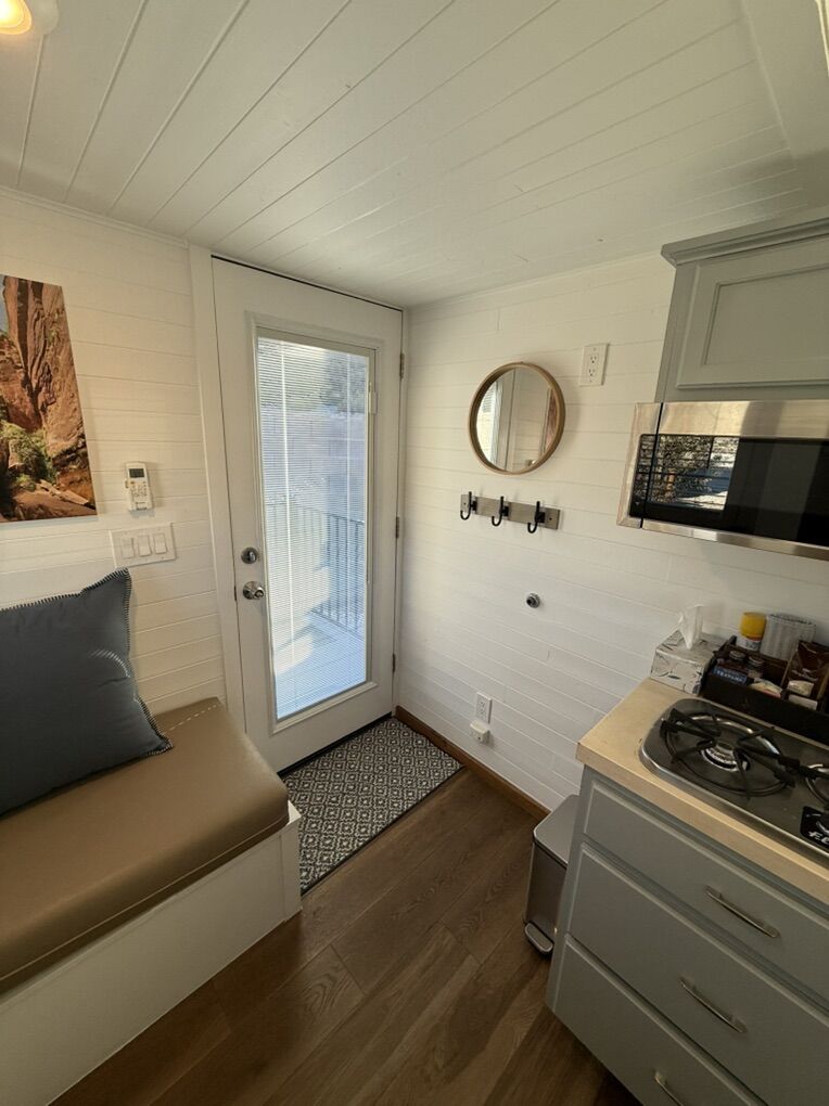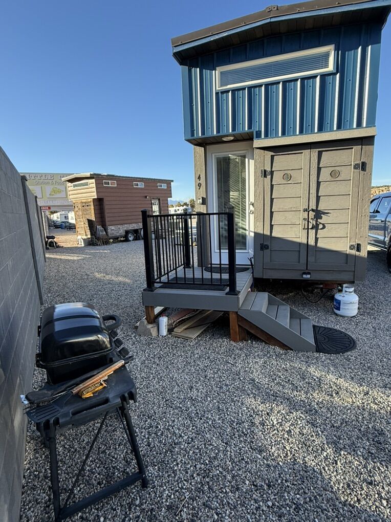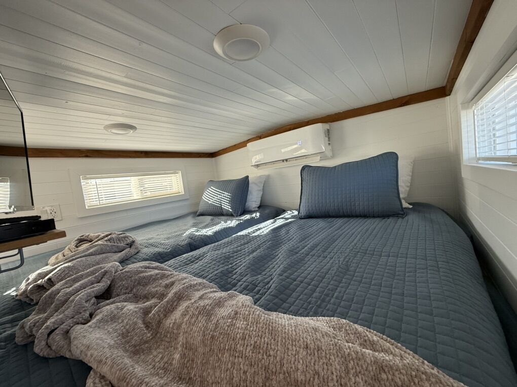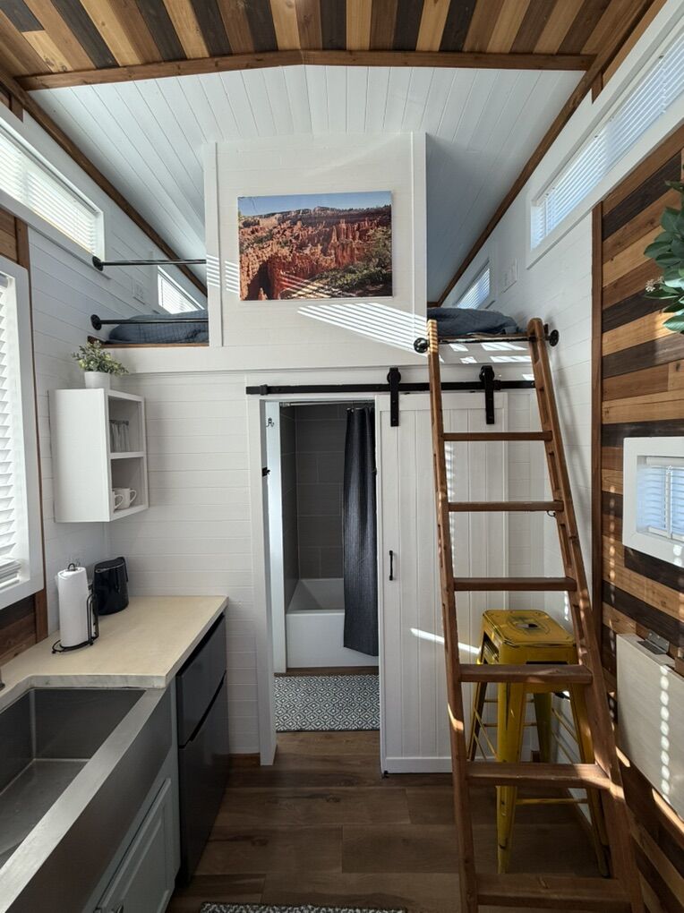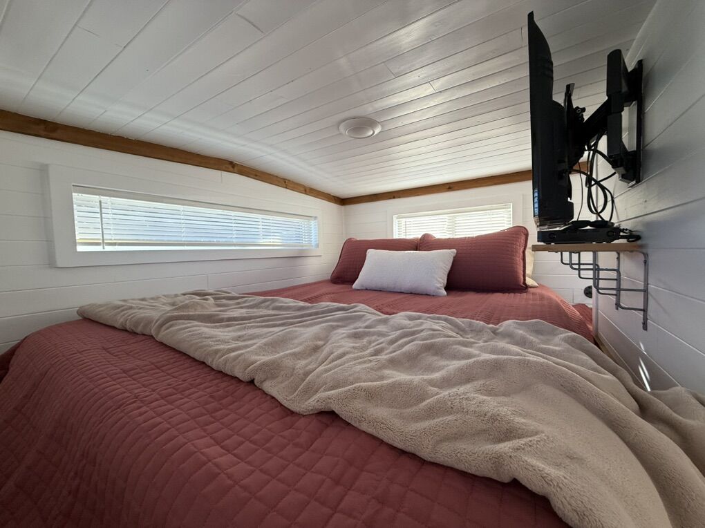 This is a 2019 tiny house on 21’ travel trailer chassis. The Anne tiny house RV is a luxury off grid or on grid model designed for ultra comfort. You will feel at home whether your off the beaten path, in the comforts of a cozy RV park or parked behind your house for an ADU (additional dwelling unit) for use as a rental or Airbnb. The Anne weighs just under 11,000 pounds and can be towed comfortably behind a 3/4 ton pick up truck. It is made to sleep 4 adults comfortably. It comes with built in solar panels that can power up a solar generator of your choice or be plugged in shore power on a 30 amp RV outlet for easy hookup. It is also electric generator ready so that you can run it off grid if needed. When you want heating or cooling simply turn on the 110 volt mini split with in shire power or a generator. It comes with a 45 gallon fresh water tank and an on demand hot water heater. It has a maintenance free metal panel and cement board exterior. It comes with a full sized bathtub shower combo and regular toilet. It has 2 TV’s with dvd player in each of the sleeping quarters.