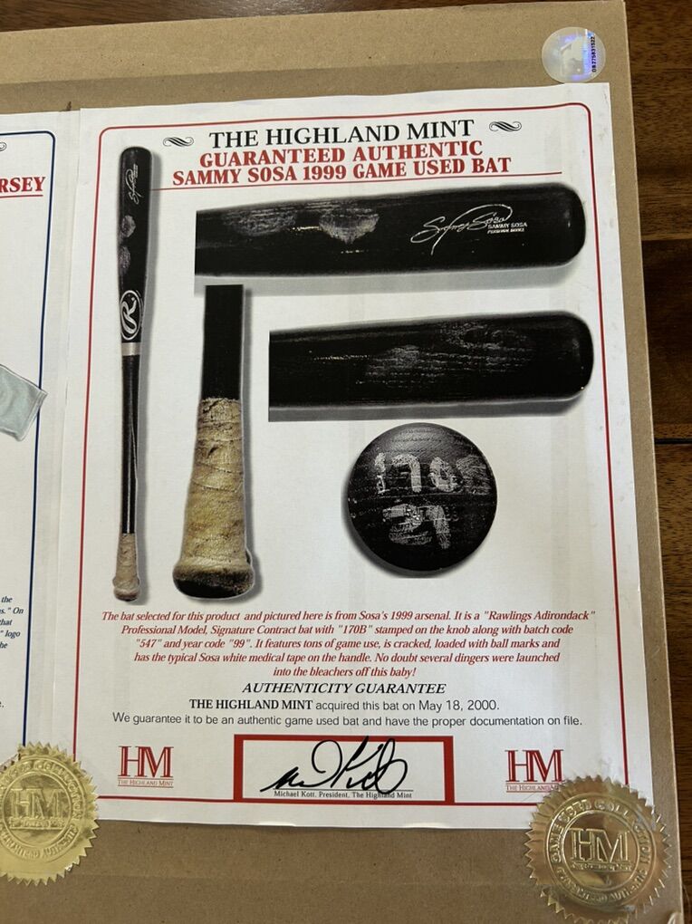 ApplePaySammy Sosa Autograph 8x10 Photo & Game Used Baseball MLB Bat and MLB Baseball Jersey and Gold Coin and Certificate of Authenticity #06/21 Made.