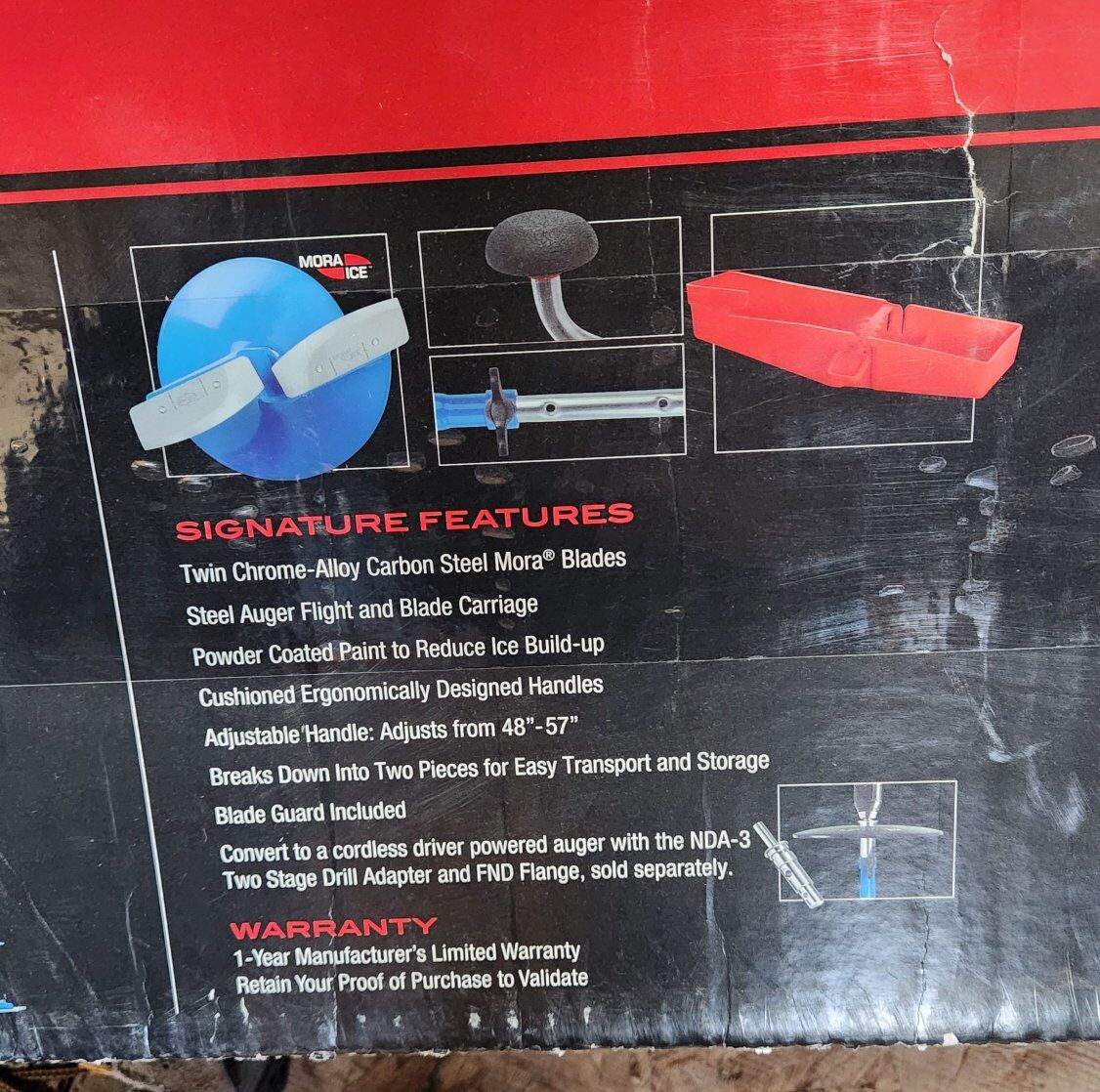 Lightweight Powder Blue Ice Auger with High-Performance Steel Blades and Adjustable Handle. The StrikeMaster Mora hand auger is 6 inches. It features high alloy carbon steel blades. It has powder coated paint to reduce ice build-up. It has soft rubber grips. There is an ergonomic designed handle system. The handle adjusts from 48 inches TP 57 inches and it weighs 6 pounds.