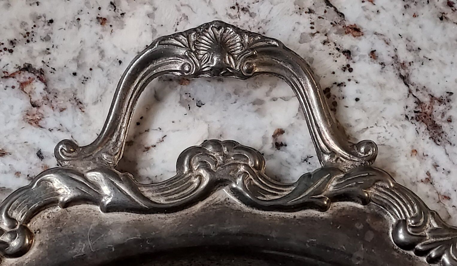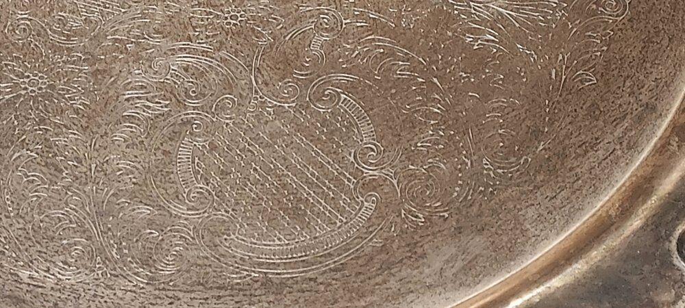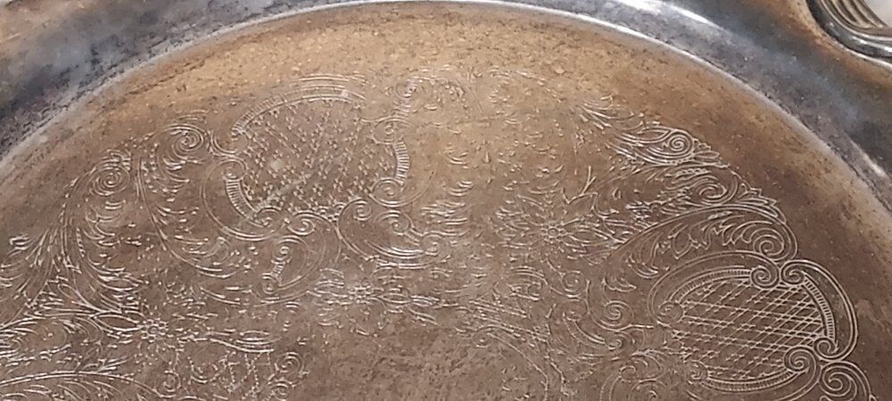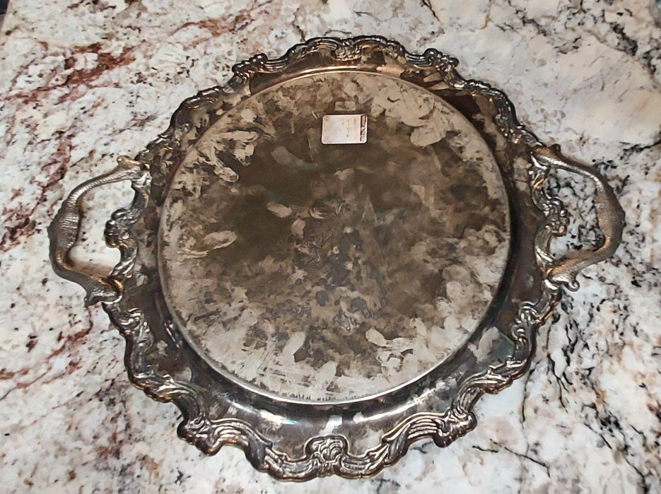 International Silver Co 16" ornate serving platter with handles.This is a plated silver piece.