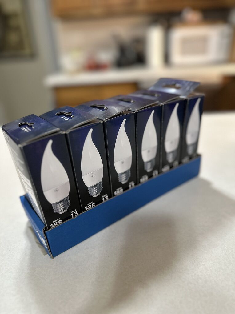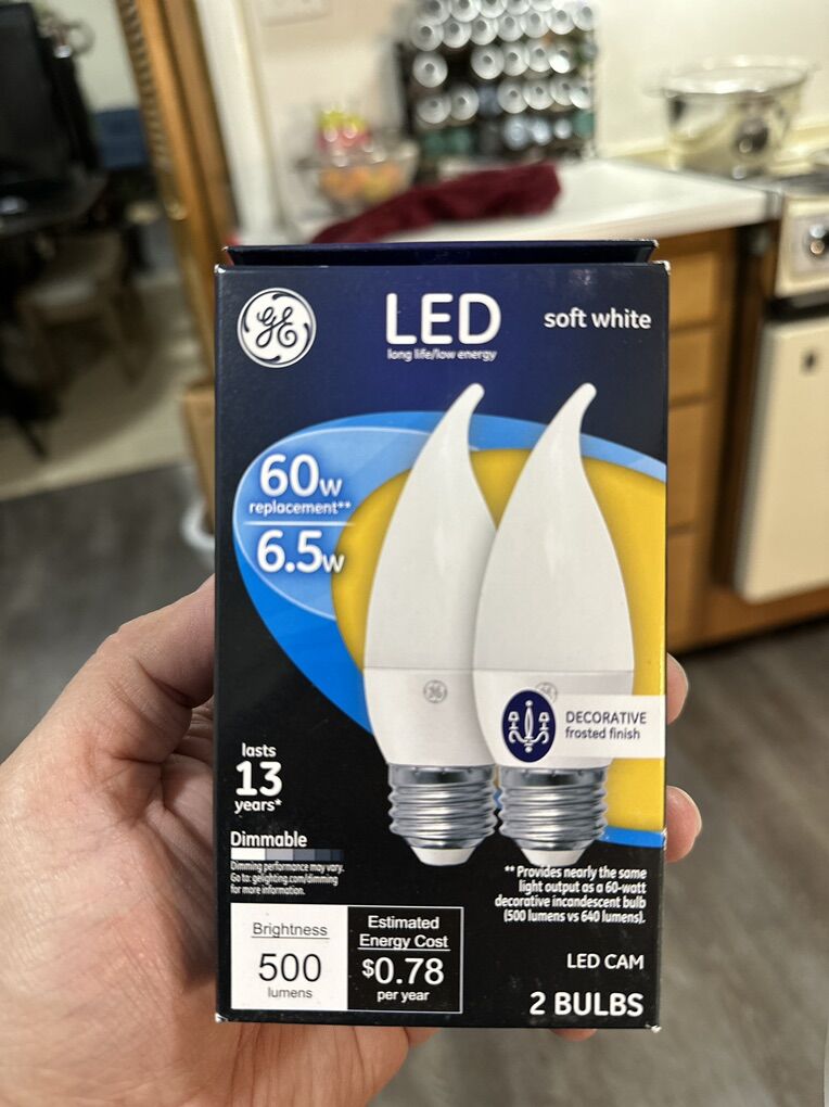 ApplePayNew unused LED long life, low energy, soft white; GE 6.5W decorative frosted finish bulbs. Lasts 13.7 years. Dimmable. Brightness is 500 lumens.