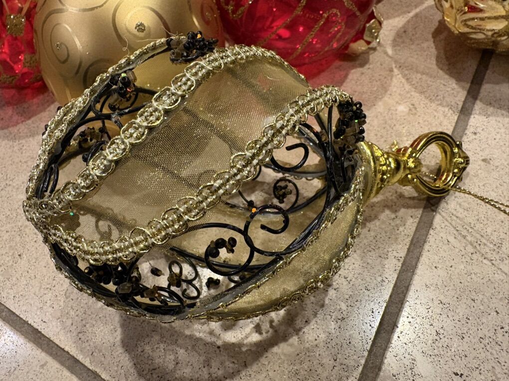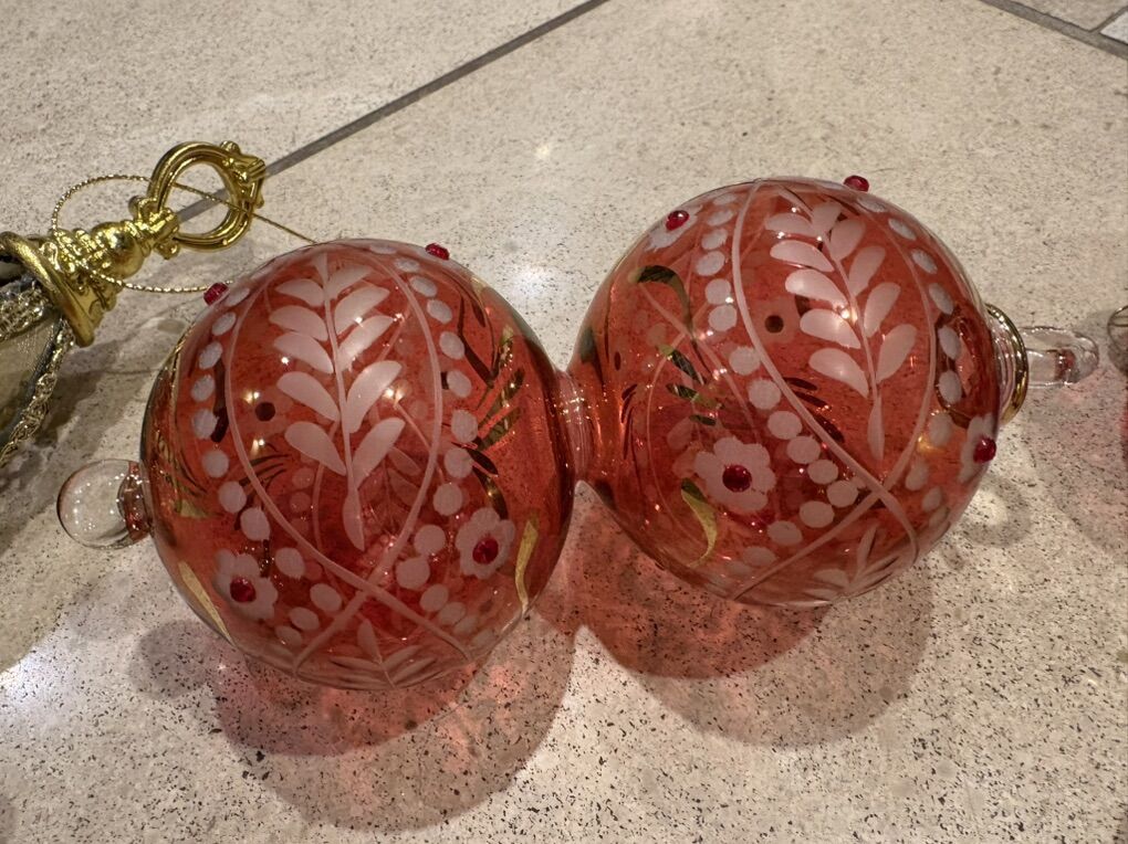 I have 13 red and gold ornaments. They are all glass except the largest gold ball, which is metal. They range from 3 1/4 inches to 7 1/2 inches tall. The last picture is the double ball Egyptian blown glass ornament for sale for about $20 each. I’m asking $25 for all of them together. One of the gold swirl ones has a couple of small spots where the gold has scratched off (see the closeup picture). See my other ads for jewelry, artwork, home decor and more.