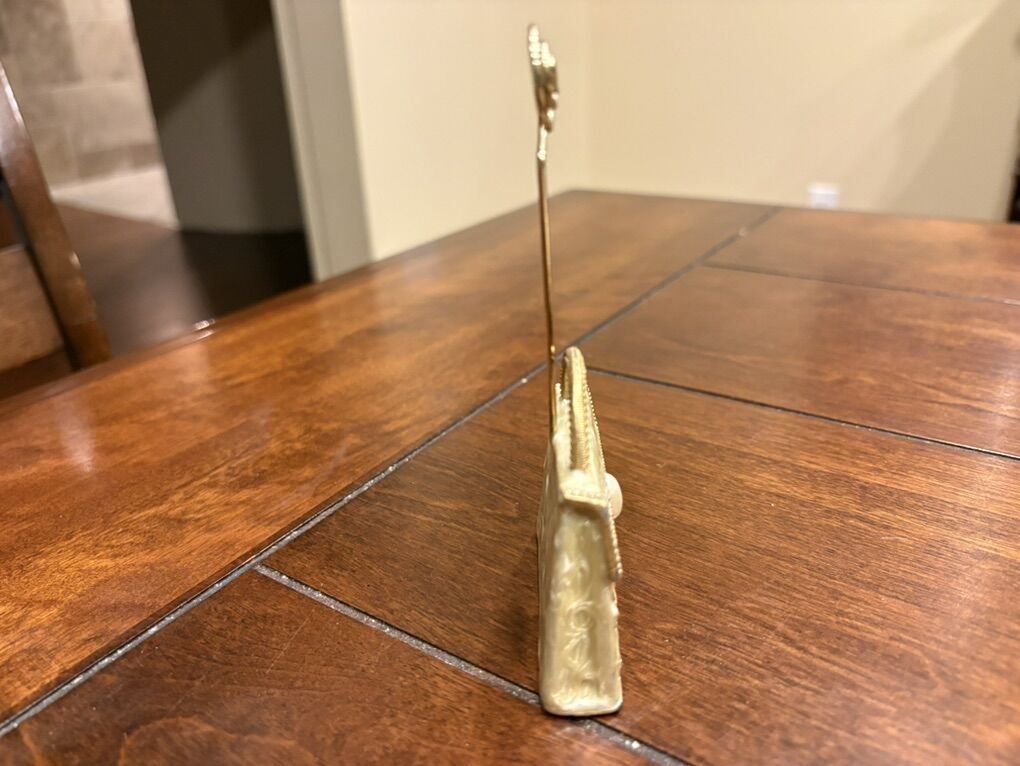 I have an enameled metal purse with a spiral for holding pictures or cards. It has some little gems on it. It’s heavy for its size and has black velvet on the bottom so it won’t scratch surfaces. It is just under 5 inches tall and 2 5/8 inches wide. See my other ads for jewelry, artwork, home decor and more.