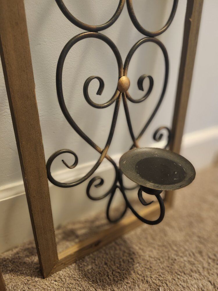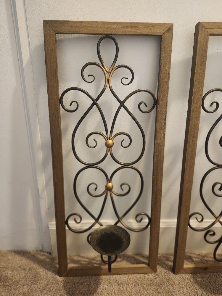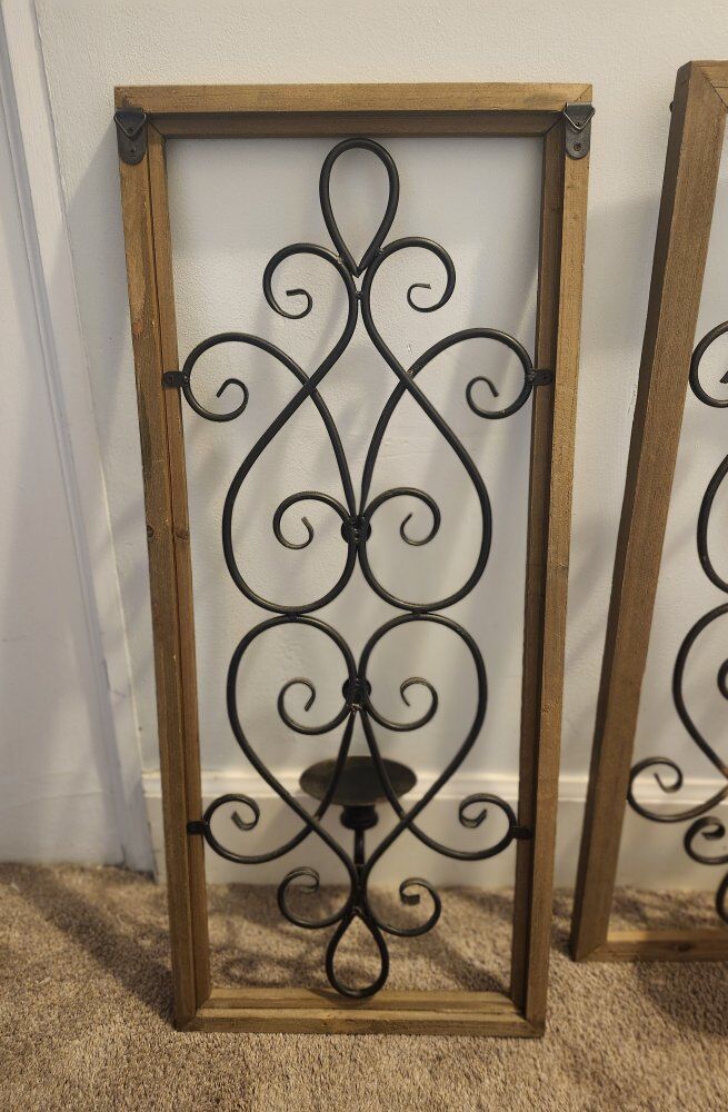 CashAppThese are Stratton Home Natural Wood Scroll Panel Wall Decor with wrought iron in a black finish, set within a natural wood frame. The design is often described as traditional, rustic or farmhouse style and typically functions as a wall sconce that can hold a pillar or votive candle at the base of the metal scrollwork. Can also be use as wall trellis' for viney plants.