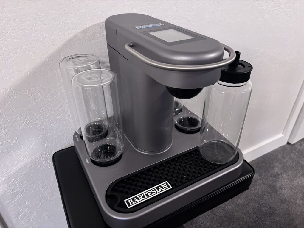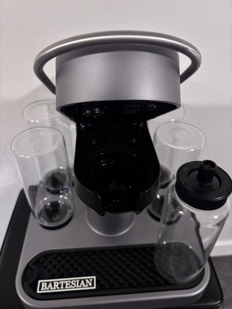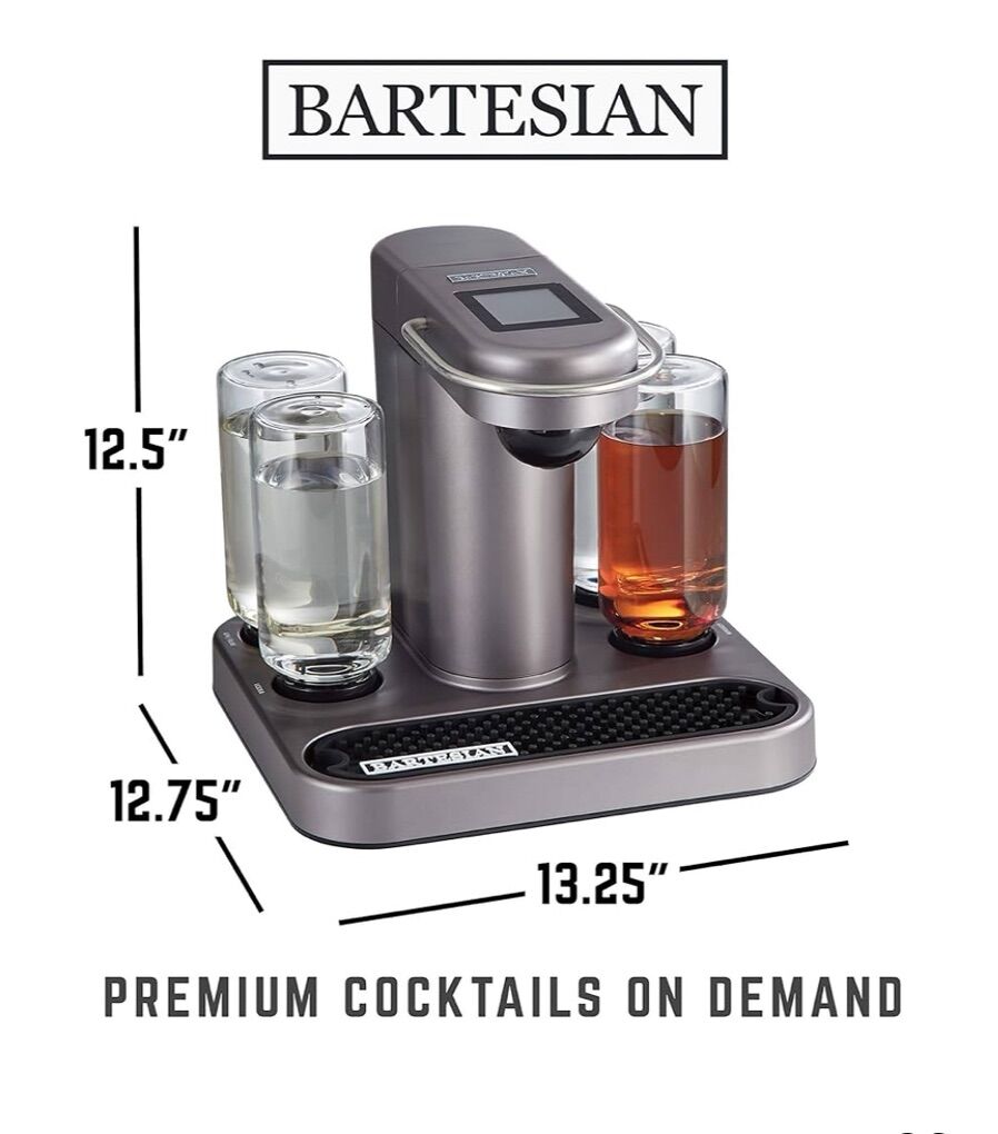 INTELLIGENT COCKTAIL CREATION: Create endless craft cocktails in the comfort of home — no need to measure or pour. Just insert a cocktail capsule into your Bartesian drink mixer machine, select your preferred strength and press mix. The system draws the spirit from the appropriate reservoir and mixes your cocktail in seconds. MIXOLOGIST-APPROVED DRINKS: Bartesian cocktail machine capsules were created by master mixologists and include the ingredients for favorites like margaritas, whiskey sours, old fashioneds and more. VARIETY WITHOUT COMPLEXITY: Bartesian offers all the benefits of a fully-equipped bar, without the time and expense of stocking various juices, bitters, simple syrups and other ingredients. All you need to worry about is having your preferred whiskey, vodka, rum, gin or tequila on hand. EASY-CLEAN DESIGN: An automatic cleaning cycle that runs after each cocktail is created, a manual cleaning cycle, and dishwasher safe parts make caring for the cocktail maker easy and ensures every drink tastes its best. If you encounter any issues with excessive spillage during operation, please ensure that all components are securely assembled and that the machine is placed on a stable surface. Additionally, regularly check and clean the dispensing nozzles to prevent any blockages that may affect the machine's performance. Please also ensure that you have a glass ready to go before dispensing.