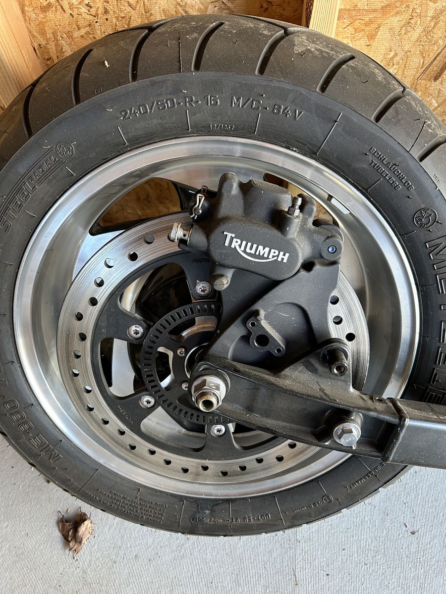 2018 Triumph Rocket III Roadster wheel and tire in Excellent condition with only 1800 miles on combo. Fits Rocket III roadsters thru 2018. Removed to make a trike of motorcyle. Rotor included with wheel, tire, swing arm, and disc brake, will sell together or sell seperate. This price is cheaper than just buying a tire alone at almost $300.00. Call for more info. $200.00 for all. Leave message if no answer, thanks. 801-879-7769