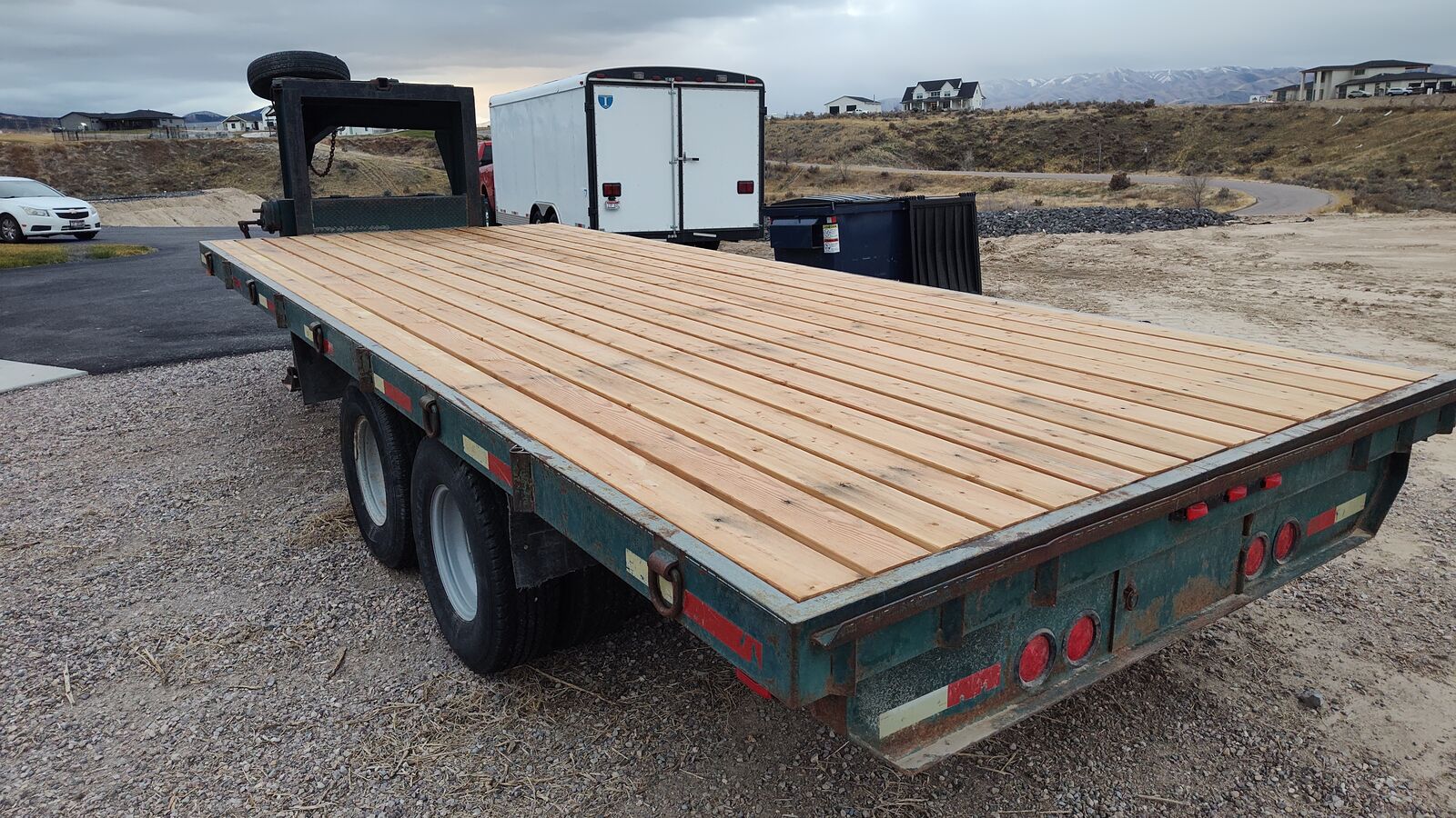 20 foot deck length 20k GVWR 10 k tandem axles new pine decking 4 new tires on the front axle New lights and electrical Front tool box with locking lid 2 speed jack Has 2 stowed loading ramps, work just fine.