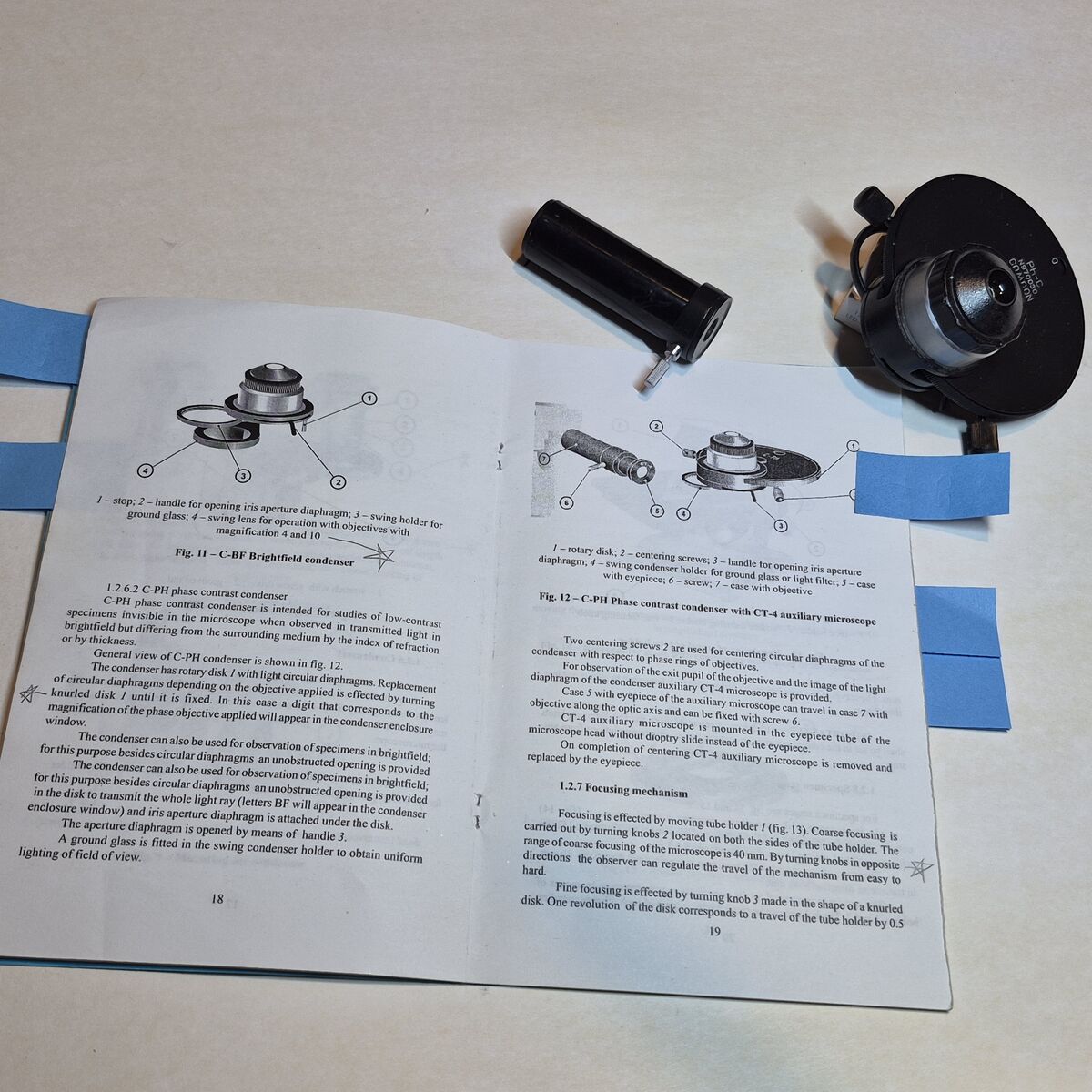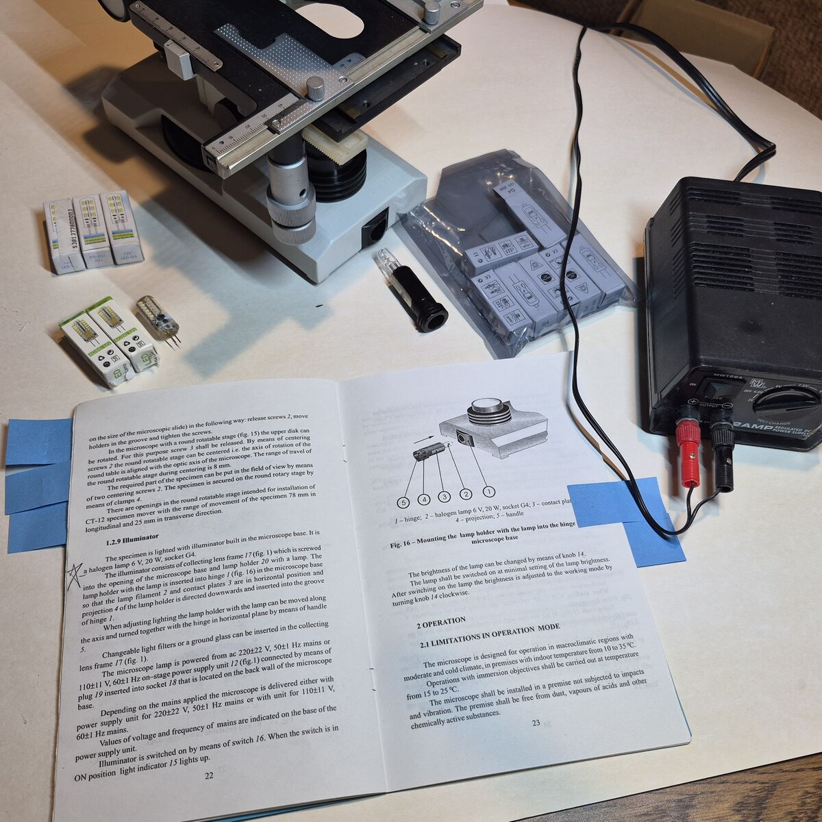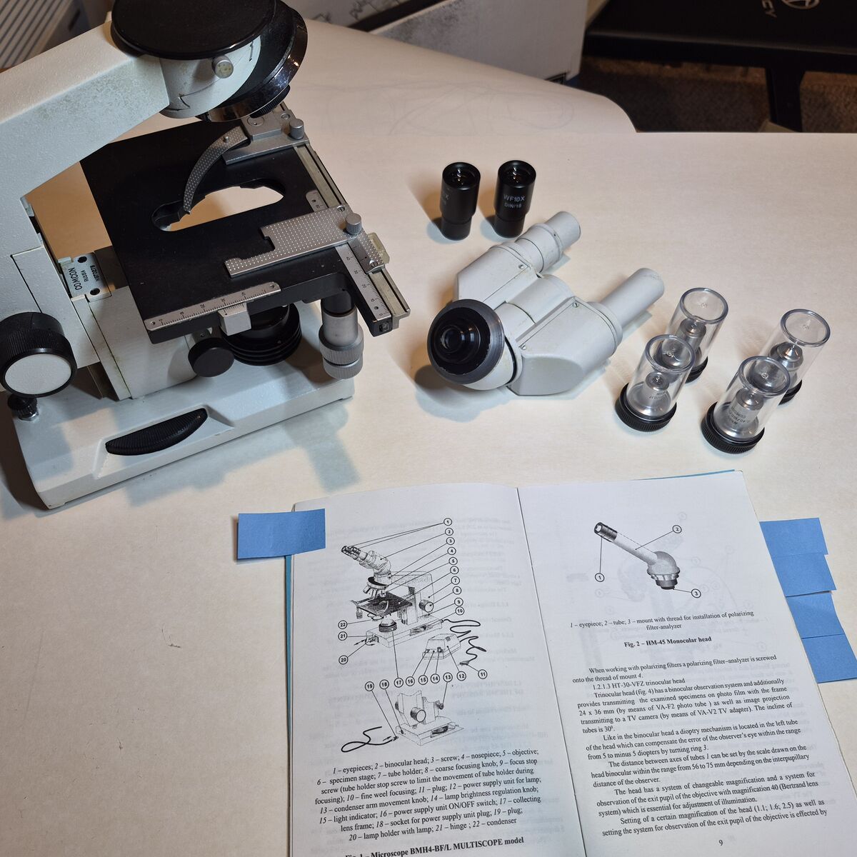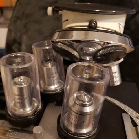 Zellesale pending (2/6) LOMO stereo microscope for phase contrast examination of wet mount biological samples. Used pre-owned with signs of cosmetic wear, but is fully operational and functions as intended. Heavy duty construction weighing twelve pounds with transformer. The scope does not have a proper case. $250, no shipping, located in Cottonwood Heights, Utah. Phase contrast lens 10x, 20x, 40x, and 100x are included. The phase contrast feature uniquely focuses on transparent cells or microbes without needing a stain. Phase contrast is the preferred method for live wet-mount slides. The 'phase contrast' lenses are capable of 'bright field' examination for stained slides when the lower condenser is opened fully. The scope has a condenser underneath the slide stage used in conjunction with phase contrast lenses. The phase condenser is in a circular turret with adjustable height aligned with a set of adjustment screws. The turret also has an Abbe condenser with an aperature diaphragm. The scope was originally illuminated with a halogen bulbs, provided, but I have also provided LED bulbs that work well. A couple of warm and cool light LED bulbs both are provided. With this post, pictures from the manual are given along side equipment pieces. While a camera is not included, I've shared a 'bright field' photo of stained bacteria. LOMO stands for 'Leningrad Optical and Mechanical Enterprise' and is a Russian microscope manufacturer since 1934. I'm guessing it's from the 1970's and with the attached table of images I believe the model is a BMH4-BF or possibly P15. I purchased the scope ten years ago from an industrial paper mill. BMH4-BF https://www.opticsplanet.com/mulbm.html Here is the official Russian LOMO site: https://www.lomo-microsystems.ru/ This German site has many references to the LOMO product history: http://www.mikroskopfreunde-nordhessen.de/lomo.php Only items pictured are included, other accessories unless they are pictured are probably not included. Some odds and ends are given such as glass slides and wipes as a courtesy, also a piece of plastic screen used to help focus when needed. Please ask if you have any questions and I would be happy to help.