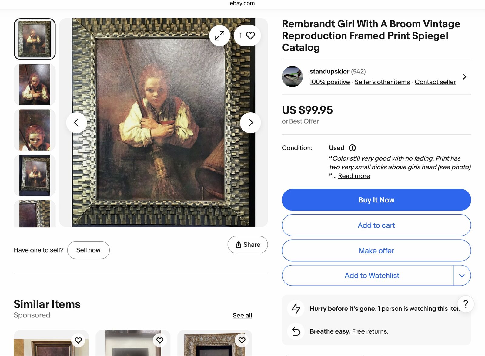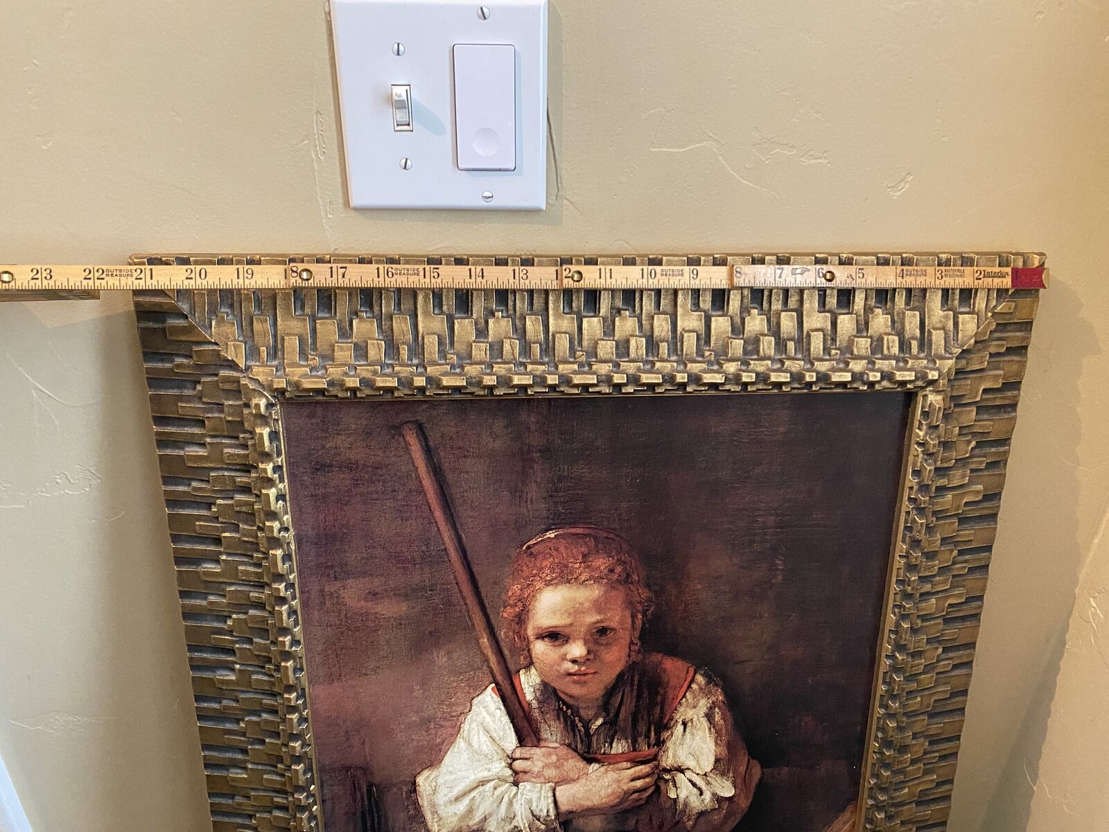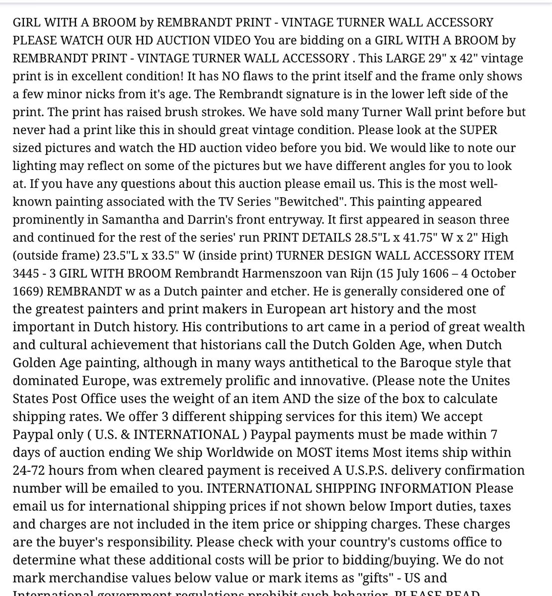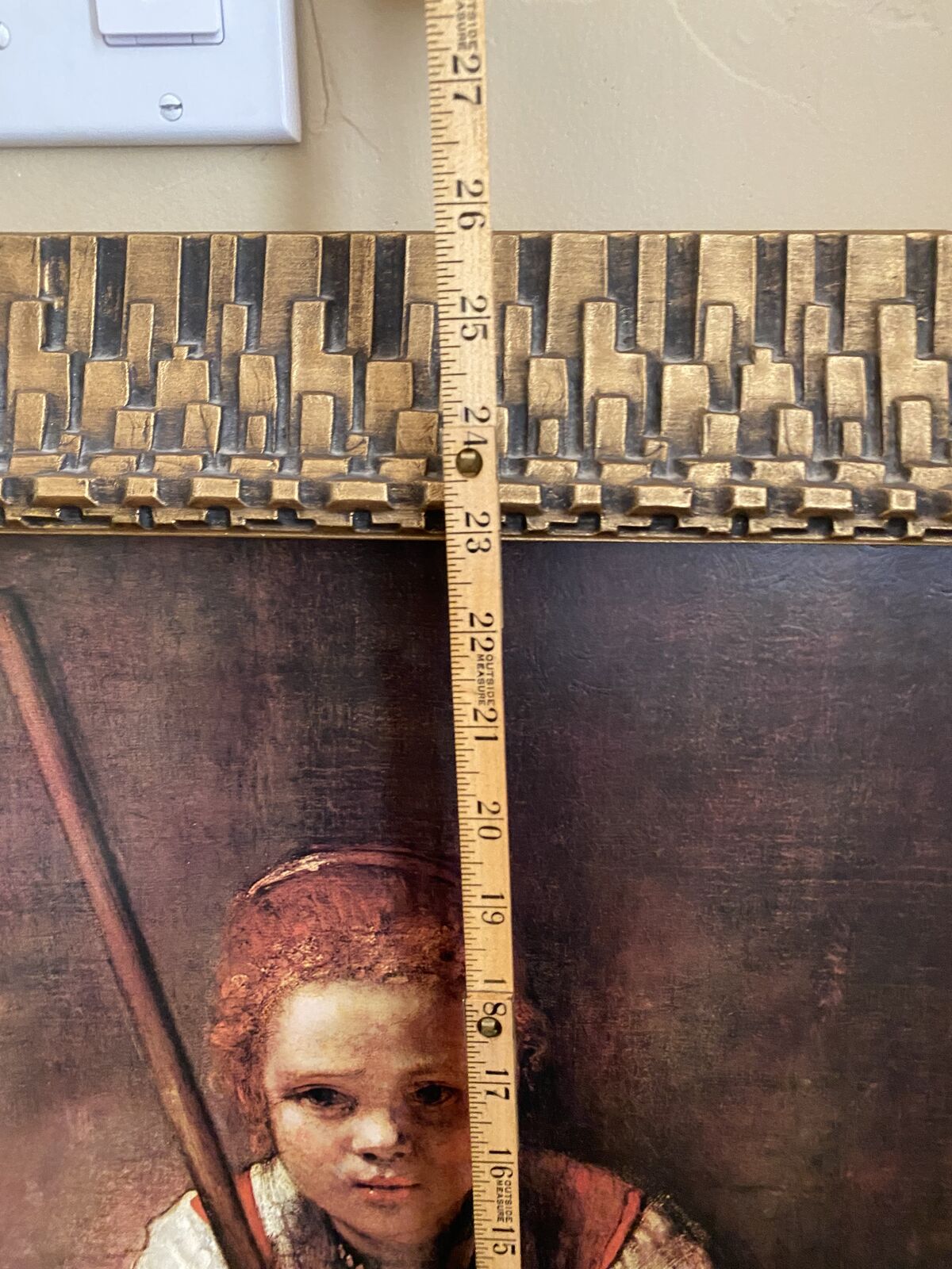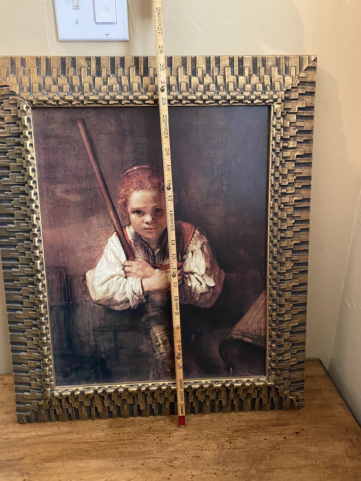 VenmoVintage Rembrandt -Girl With Broom- Vintage Reproduction Framed Print - C PIX. This stunning art has been seen on the TV Series Bewitched. Measures 22X26. The intricate frame is perfect for this print, a great compliment. I see no damage to the print and the rest of it looks brand new. The brown paper on the back has a tiny bit of damage (shown in photos) but excellent for its age. One similar to this one is listed for $100, but that one has damage on the print.