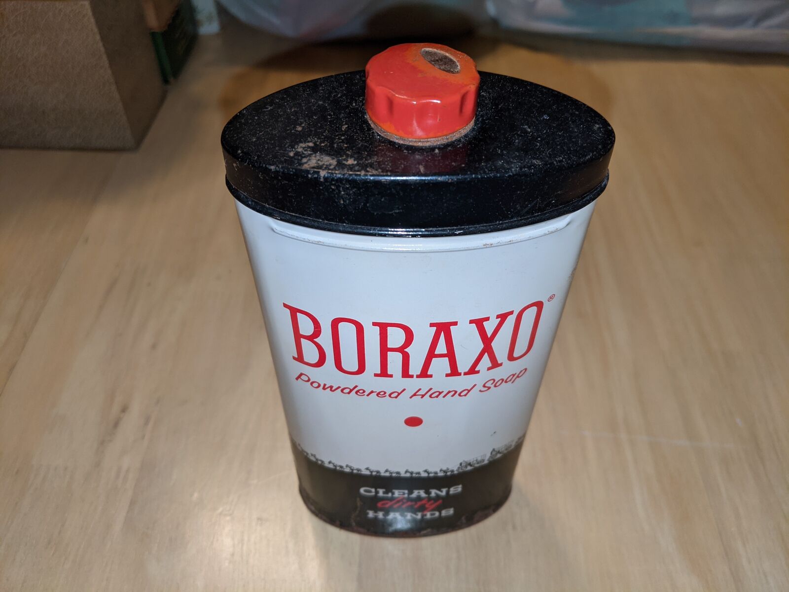 Vintage Tins Boraxo, AMC Kelvinator Wax, Baer Brothers Bronze Powder.