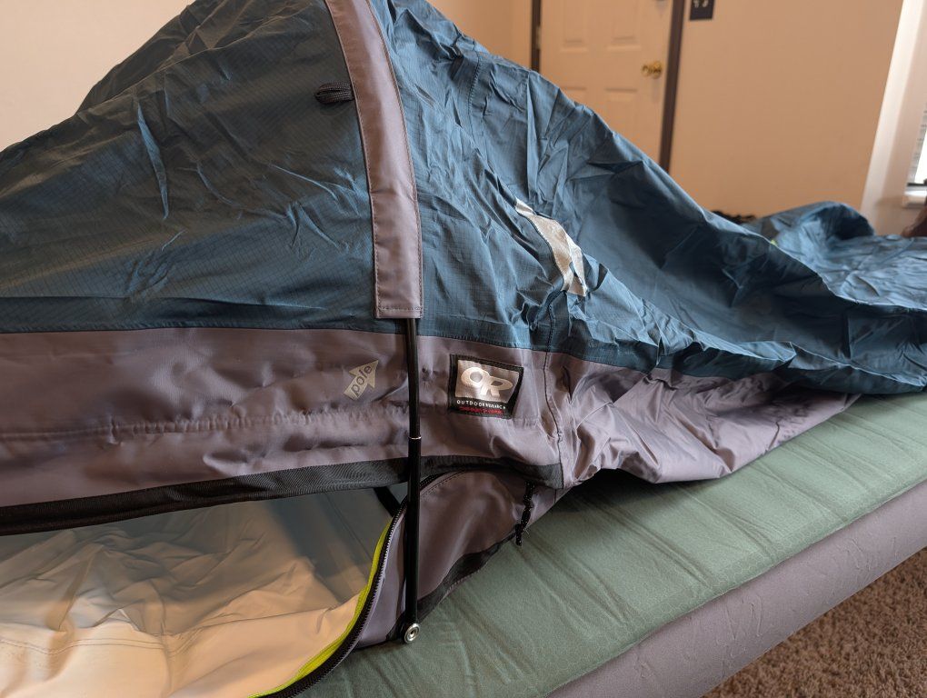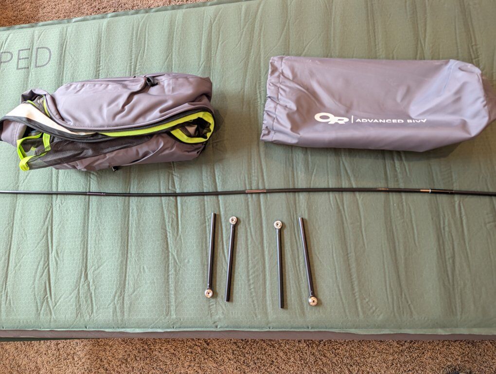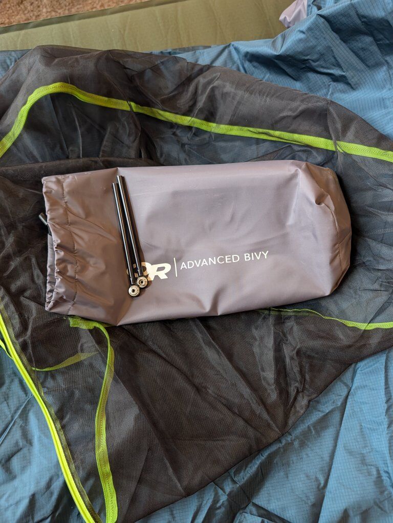 1 rivet missing, see last picture. The "Advanced Bivy" refers to the Outdoor Research Advanced Bivy, a popular, lightweight, single-person shelter for backpackers, known for its durable, waterproof-breathable Gore-Tex fabric, dual-pole system creating overhead space, and versatile venting for comfort in various conditions, acting as a minimal tent alternative for minimalist adventures. This video provides a detailed review of the Outdoor Research Advanced Bivy: Key Features & Benefits: Weather Protection: Made with Gore-Tex Respiration Positive fabric, offering waterproof, windproof, and breathable shelter. Headroom: A two-pole system creates an awning and dome shape, preventing claustrophobia and allowing space for gear or changing clothes. Ventilation: Features zippered vents and a removable no-see-um mesh panel for airflow and bug protection. Lightweight & Compact: Ideal for ultralight backpackers seeking a minimal shelter. Pad Straps: Internal straps secure your sleeping pad to prevent it from sliding. This video demonstrates how to set up the Outdoor Research Advanced Bivy: Who it's for: Solo backpackers, peak baggers, and thru-hikers. Those wanting more protection than a simple bag but less bulk than a tent. Considerations: It's still a bivy, so it's snug; claustrophobic individuals might prefer a one-person tent. Requires practice to use effectively and manage condensation.
