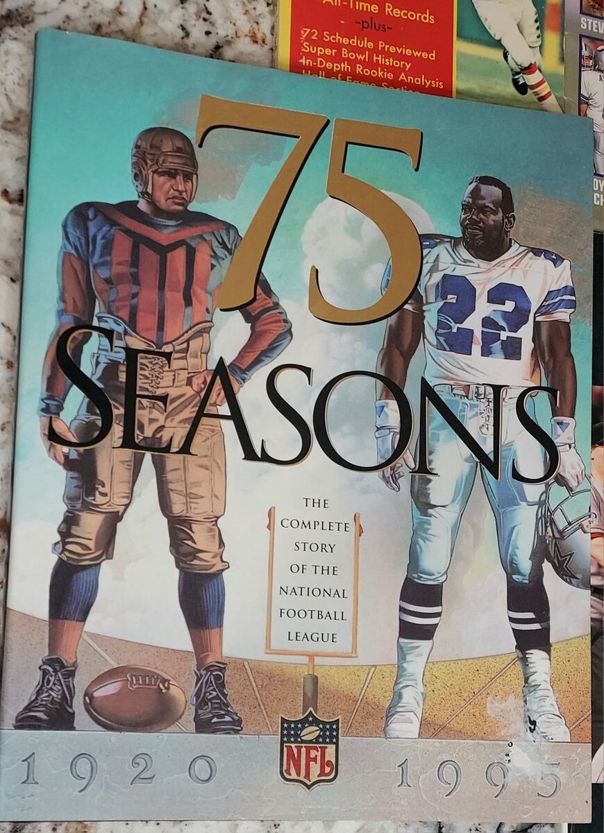 4 different NFL football books including large 75 seasons coffee table book, 1994, 1972 pro quarterback handbook, paperback and 2 magazines, 1999 football superstars album with 16 full page posters, sports illustrated kids book.