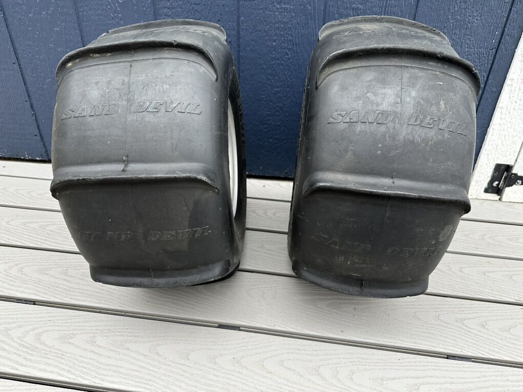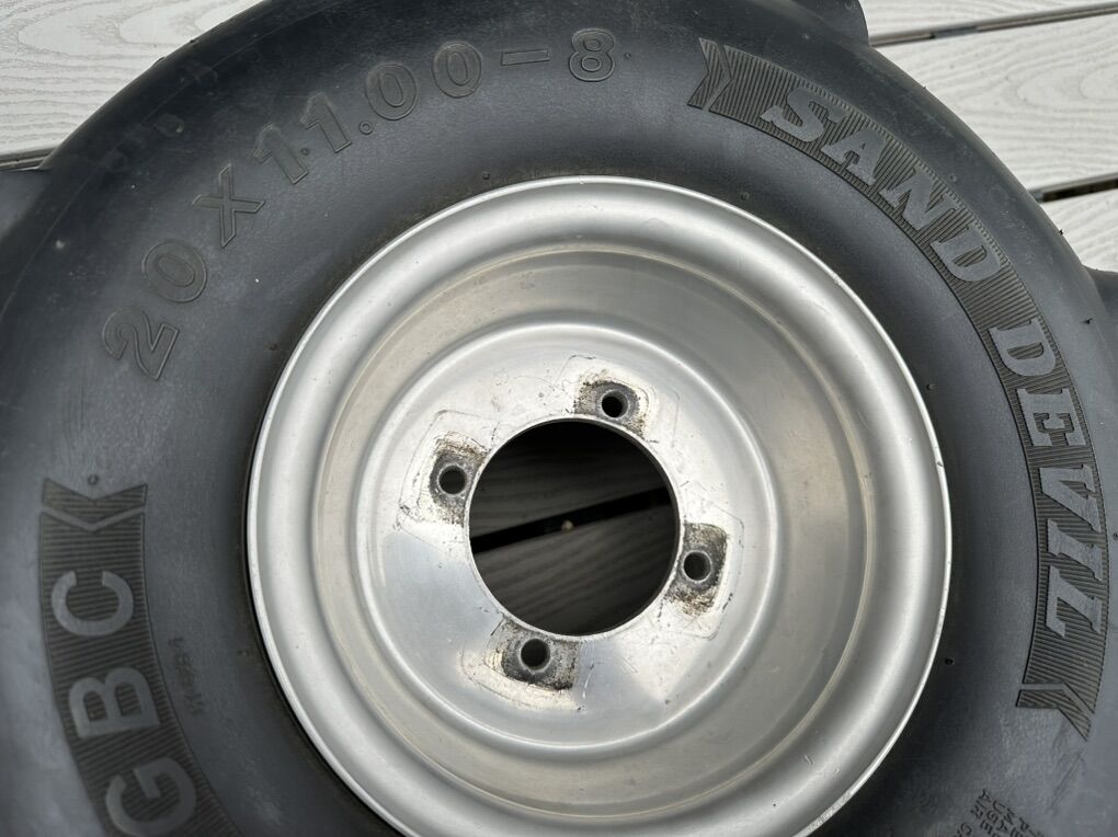 PayPalSand tires, paddle tires set with Douglas wheels Size 20x11R8. These were used on Suzuki LTZ 400. I believe they should fit Honda ATV wheel lug patterns to. Still in really good shape they both hold air