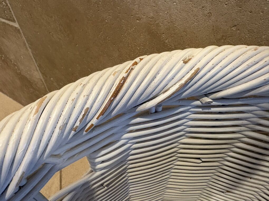 I have a vintage round white wicker laundry hamper with handle holes. It is 21 inches tall and 16 1/2 inches across. It’s in good condition but has a a few spots where the white has worn off (see the last picture). See my other ads for jewelry, artwork, home decor and more.