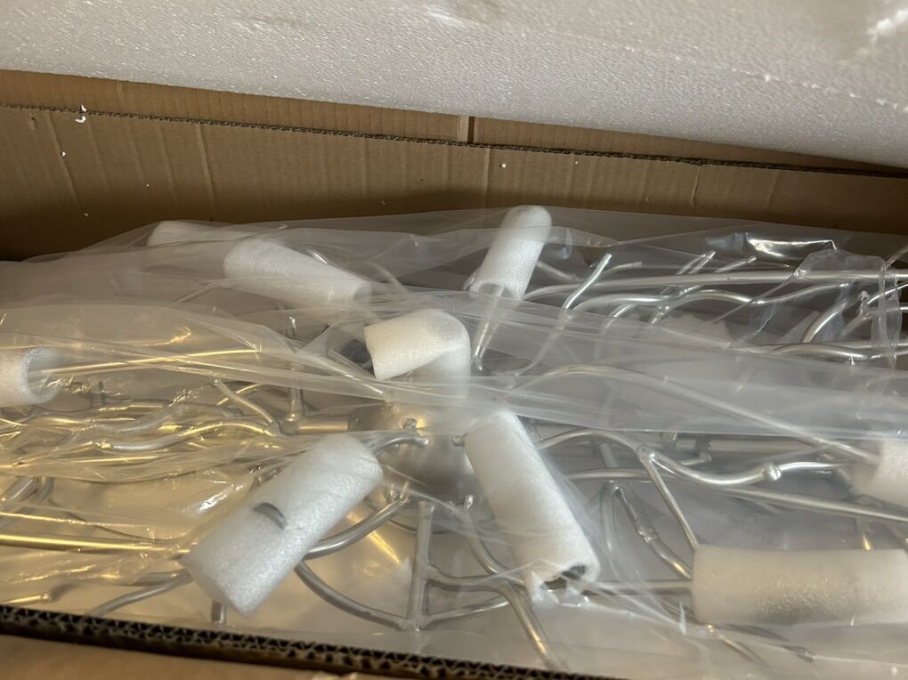 The chrome finish modern chandelier frame is made of alloy aluminium, which is pre-assembled and every branch could be gentle adjust. Only 1 size crystal sting, easy to hanging.