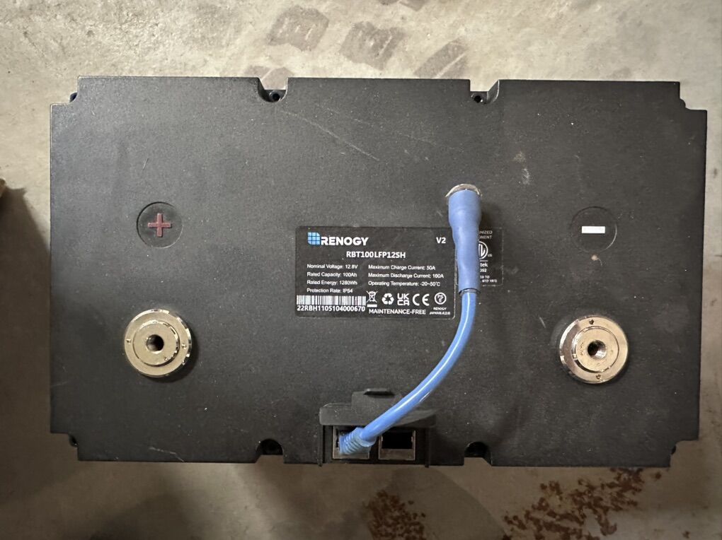 Renogy 12V 100Ah Lithium Iron Phosphate (LiFePO₄) battery with self-heating and built-in BMS. Lightly used, stored indoors, not heavily cycled.