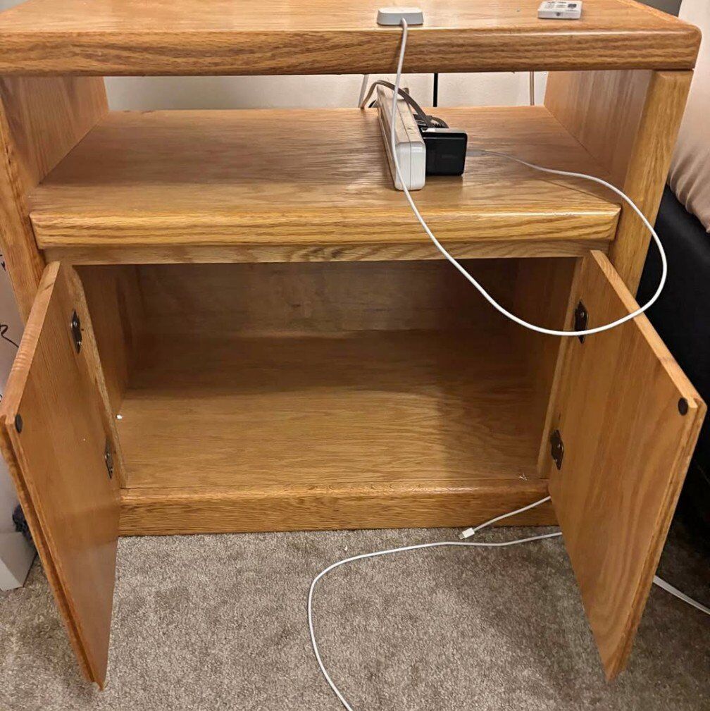 VenmoSolid wood TV stand with an open shelf and double-door cabinet underneath. Compact and sturdy with a warm oak finish and rounded edges. Works great for a smaller TV, gaming setup, or as a roomy nightstand/ bedside cabinet with tons of storage.