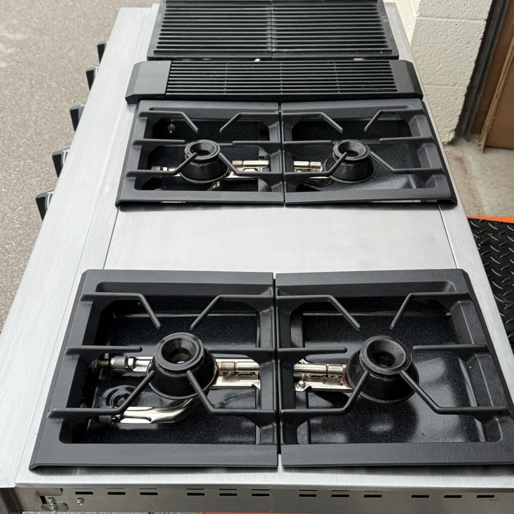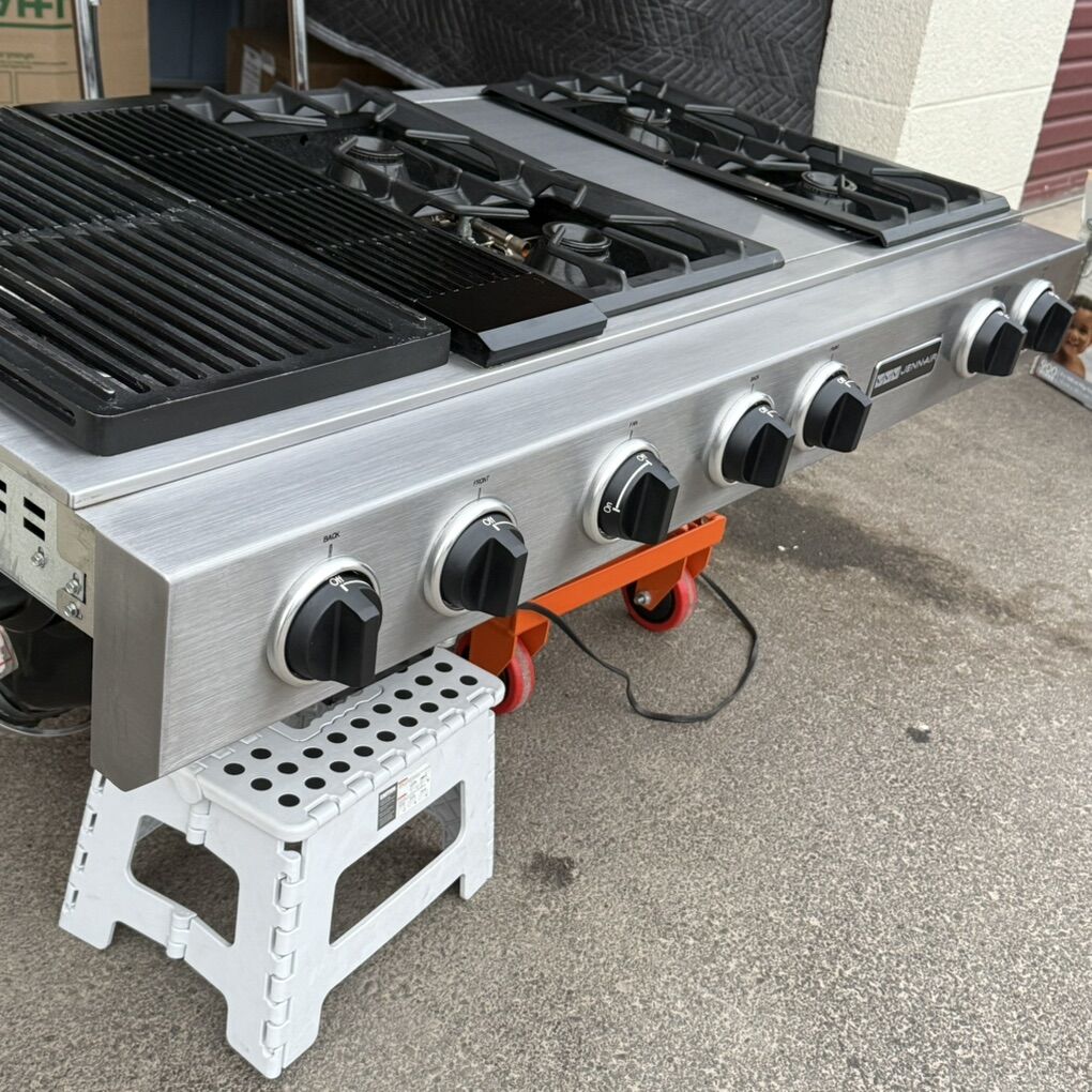 Used Jenn Air 48 Gas Cooktop with Downdraft vent system. Model: CVG4380P , S/N: 18939675YH.