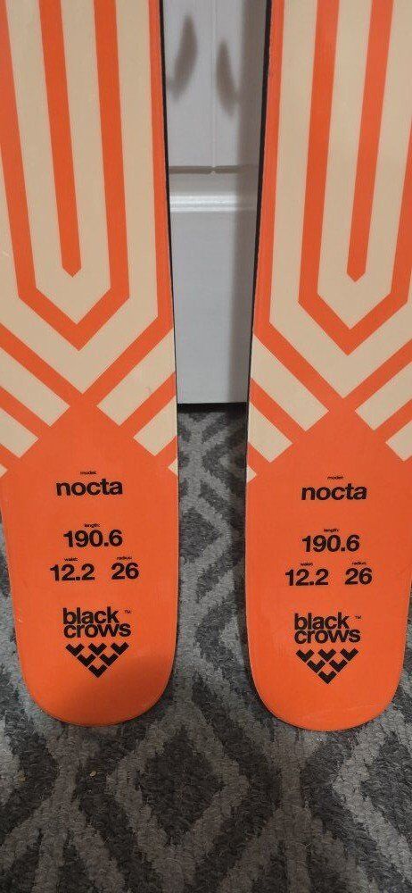 Black Crows Nocta Skis 190 cm length mounted with Salomon Warden bindings. They were mounted on the recommend line for a 325 bsl.