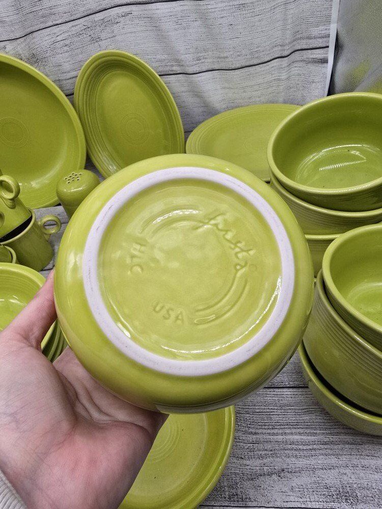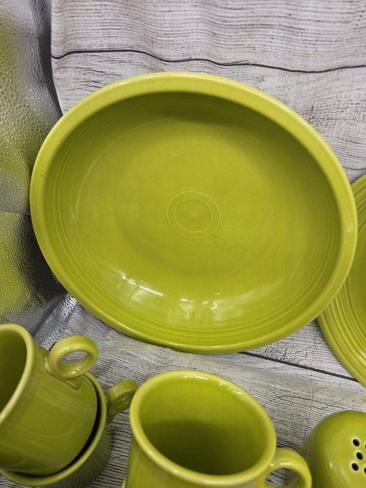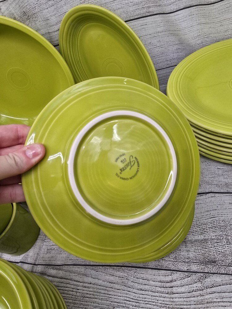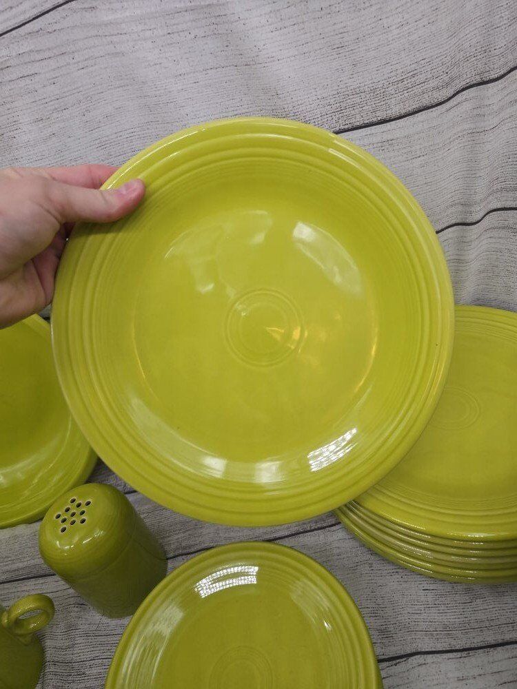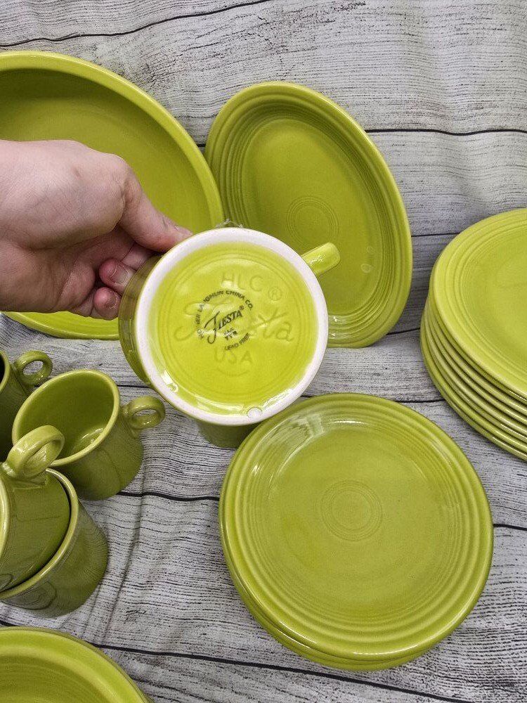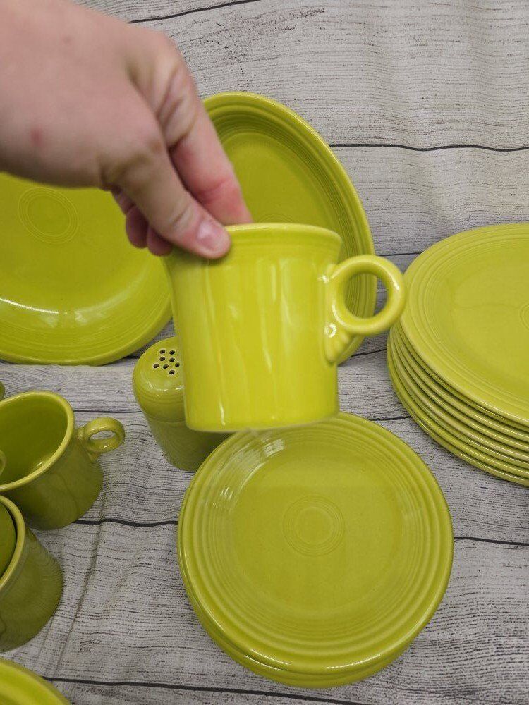no chips or cracks. comes from a smoke free environment. I am moving and cannot take these pieces with with. comes with: a large round serving bowl oblong/oval serving plate 8 dinner plates 8 mugs 8 deep cereal bowls 7 bread plates 8 shallow bowls 1 Shaker? 1 medium bowl