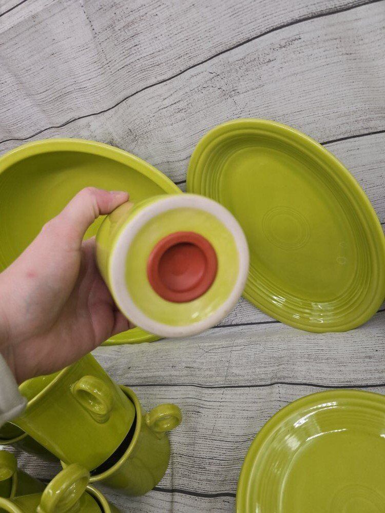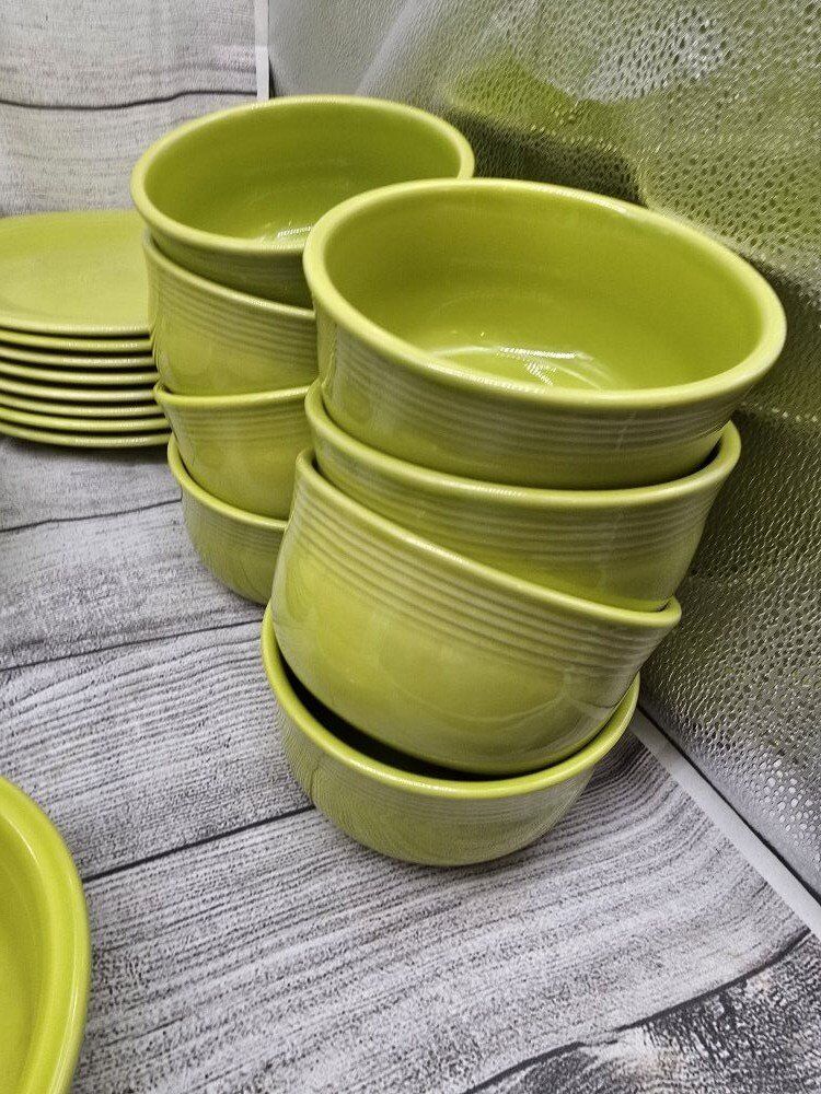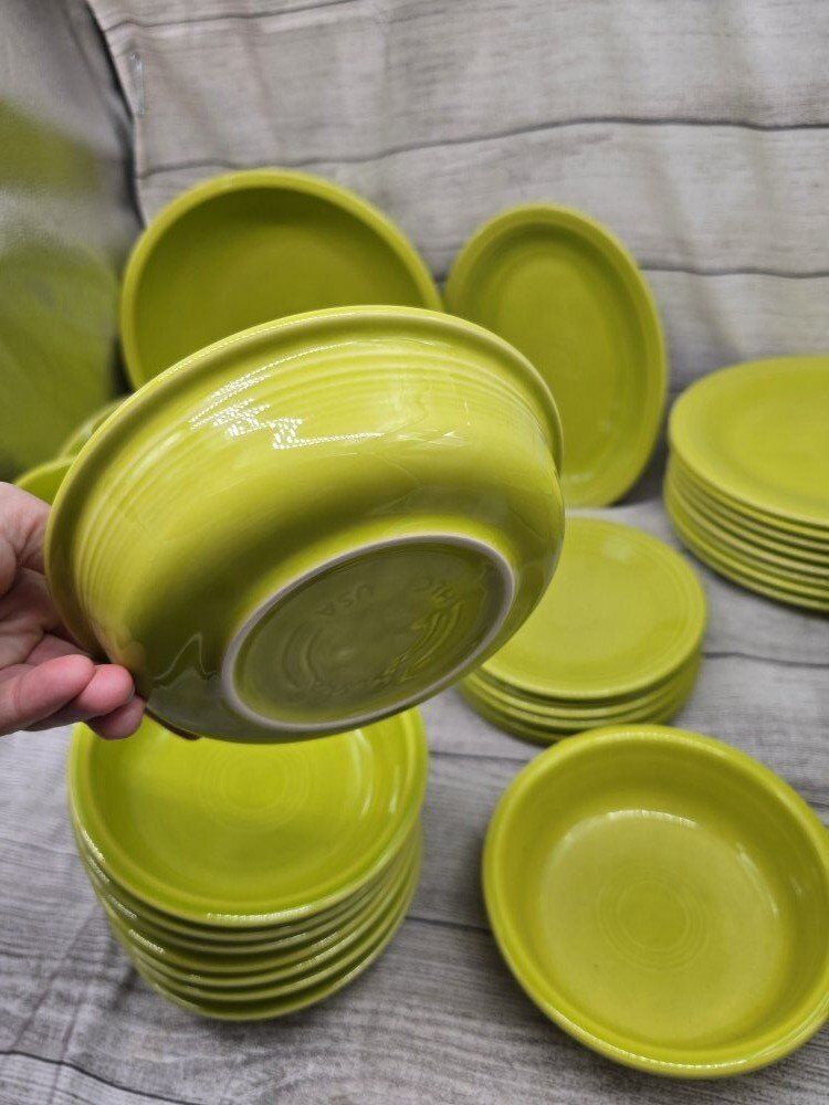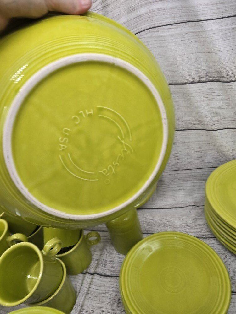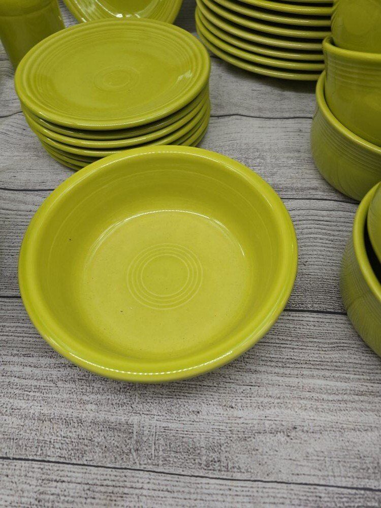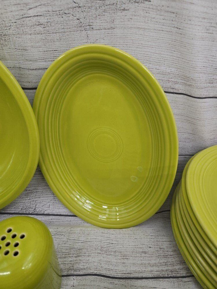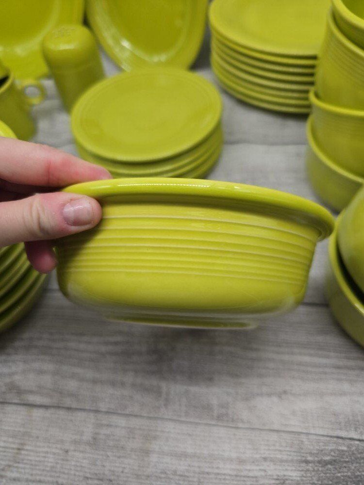 no chips or cracks. comes from a smoke free environment. I am moving and cannot take these pieces with with. comes with: a large round serving bowl oblong/oval serving plate 8 dinner plates 8 mugs 8 deep cereal bowls 7 bread plates 8 shallow bowls 1 Shaker? 1 medium bowl