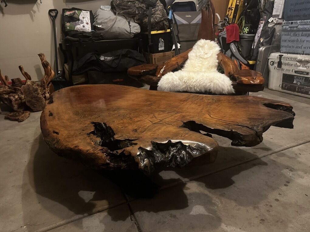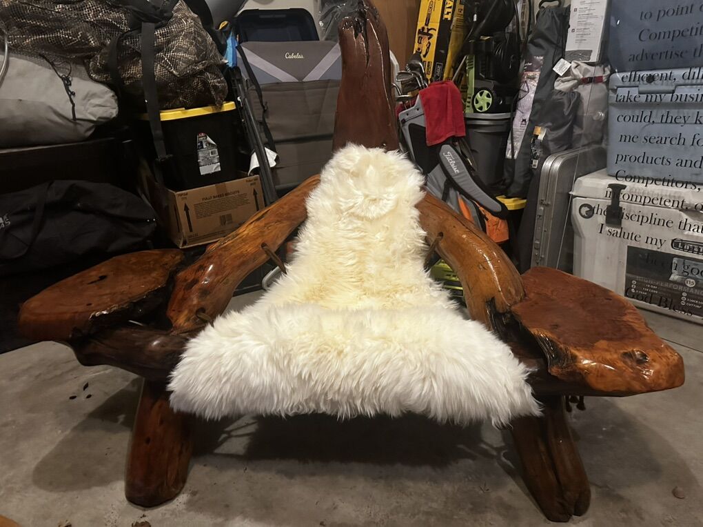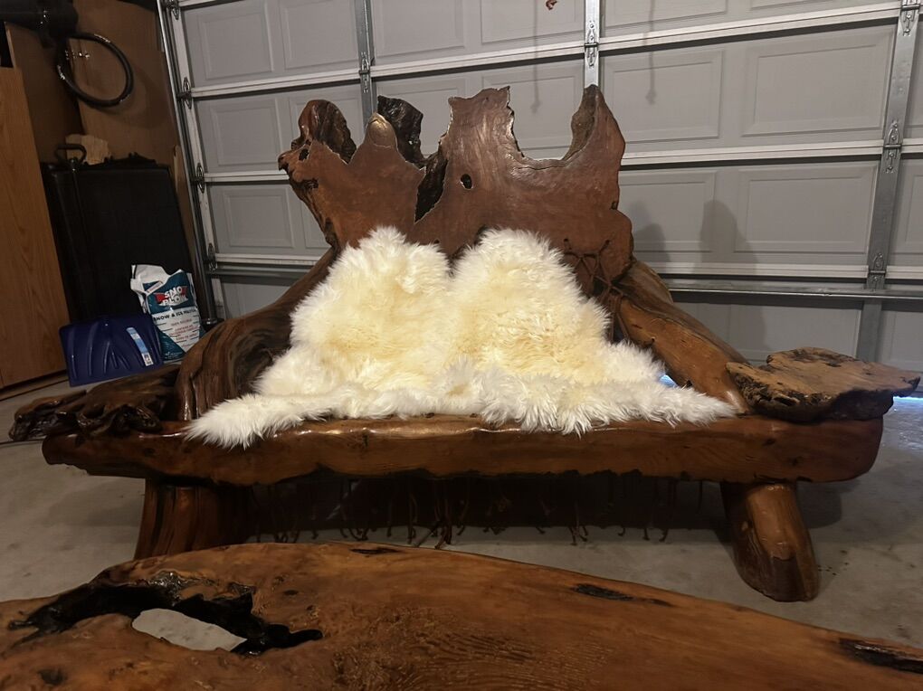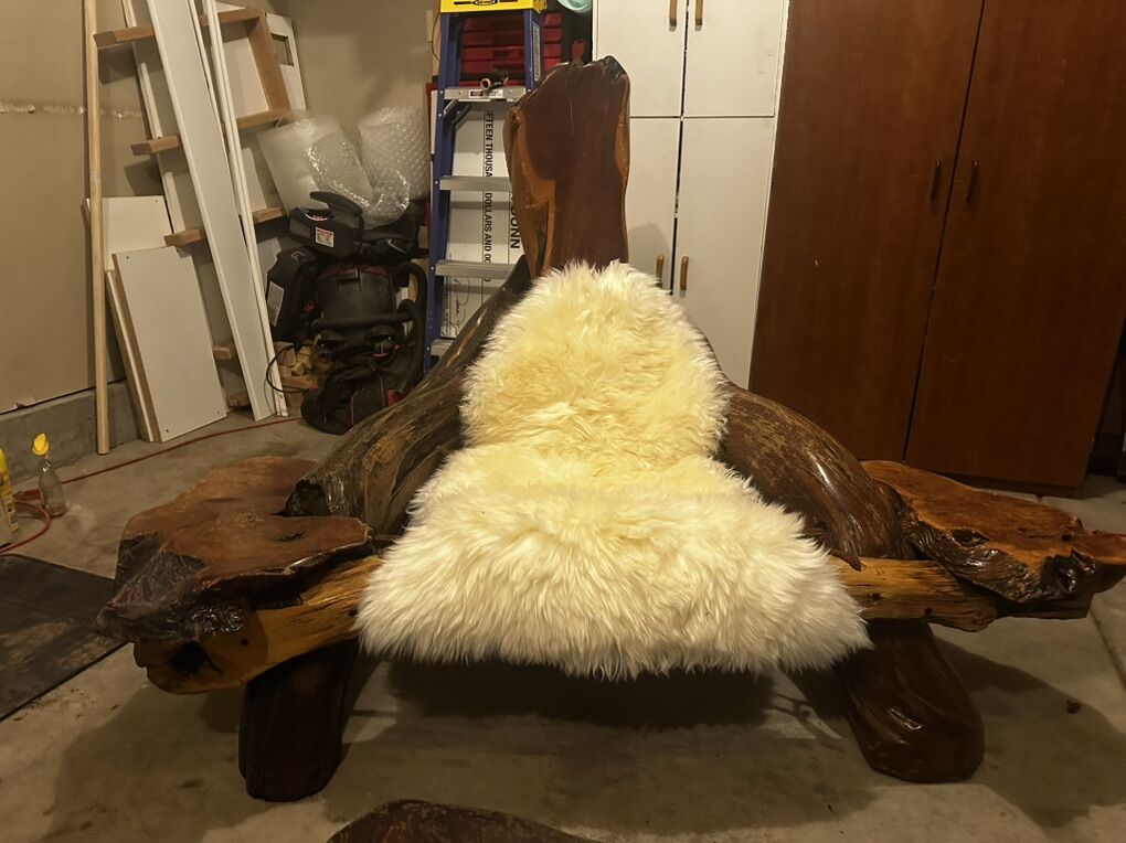 My dad bought these pieces at a design shop near the old wharf in San Francisco. It was delivered to us in 1978 to go in our new home he had just custom built in Lindon. My wife and I have owned it now since 2001 when I bought it from them. From being in Storage for almost a year, it gathered some dust and the hammock in the loveseat had all but given out, so my wife and I re braided the hammock In the same fashion it was originally, with the same rope material, and we have extra. The sheepskins are brand new and come with their own sack and brush. We have never tried to refinish it because the redwood is still beautiful. I was told that it is made from the redwood Roots that were mined after a big fire in the redwood forest, the Roots stayed on fire for years and carved out a really unique design property to the wood. This set was appraised 10 years ago for my home insurance at 55,000. I am needing 19,500.00 (bargain) It is in my garage, and we have decided to take the Rv route into retirement so I don’t want to store it. Family heirloom almost 50 years old. 1 loveseat, 2 sheepskins, single slab back.
