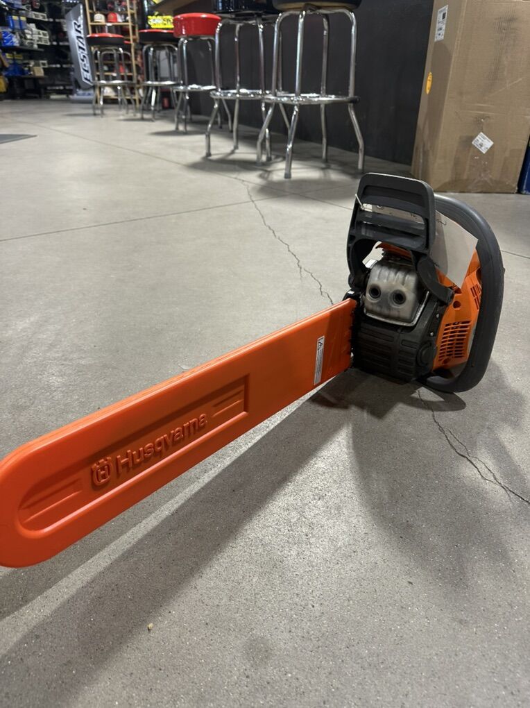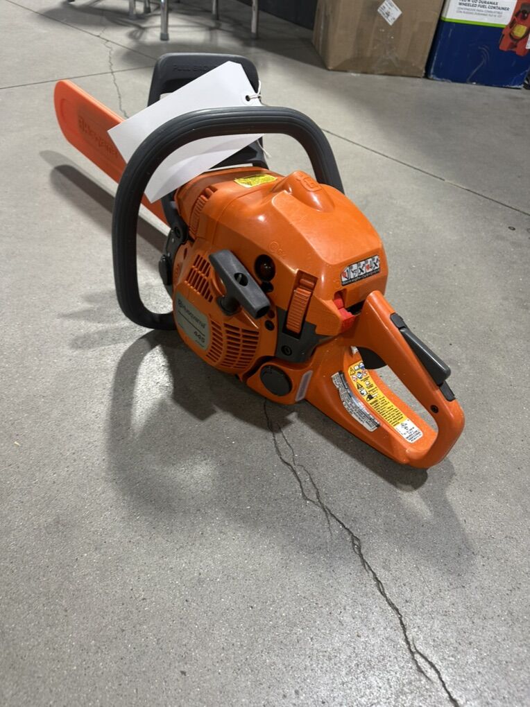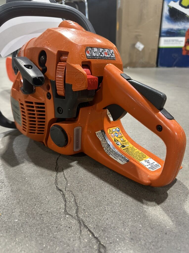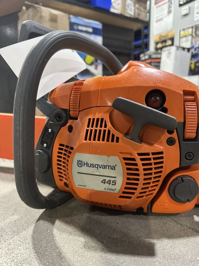 This is a used Husqvarna chainsaw for sale at Cutler's! It is the Husqvarna 445 and has a new 18" bar and chain installed. It has been completely gone over by a professional power equipment mechanic. It has also had a full service done on it, which includes a new air filter, spark plug, fuel filter, and an overall inspection on the condition of the machine. This chainsaw is powered by a 50.2cc 2 stroke engine.