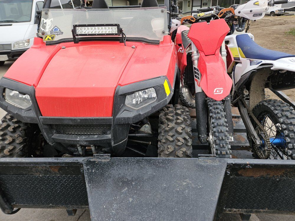 Holds 2 quads or 1 50" utv and 2 bikes. Very good tires. lights work. steel deck that mud will falls through when cleaning. front box.