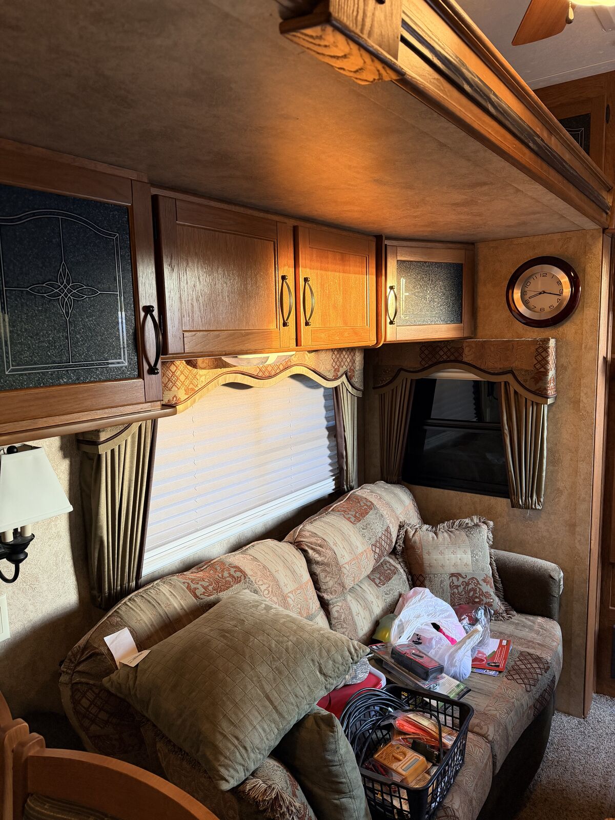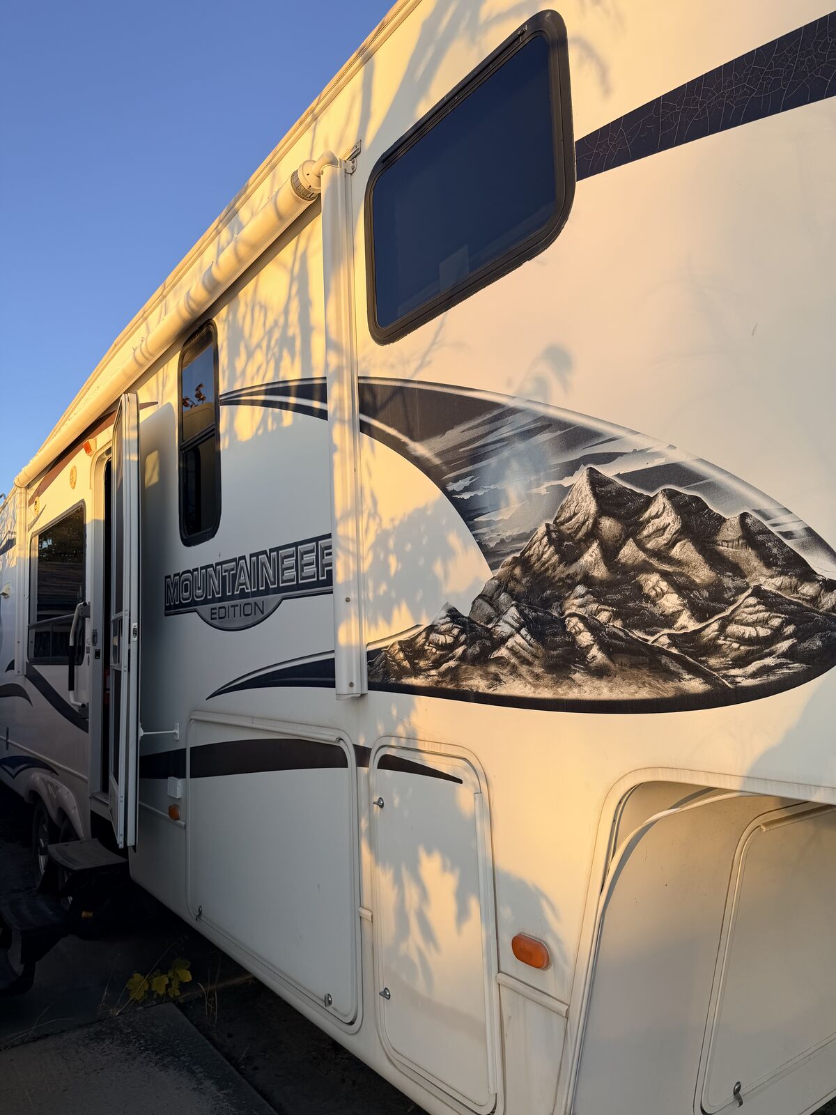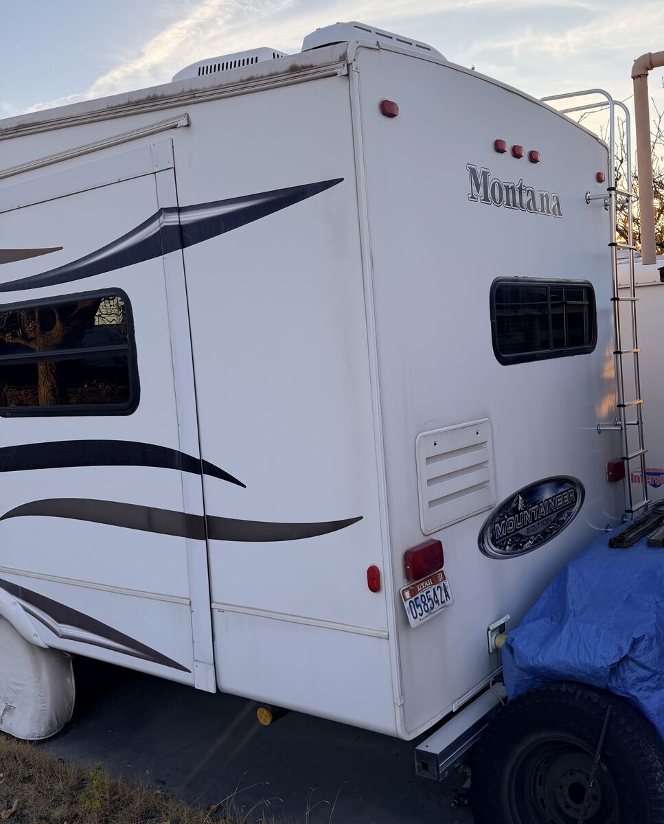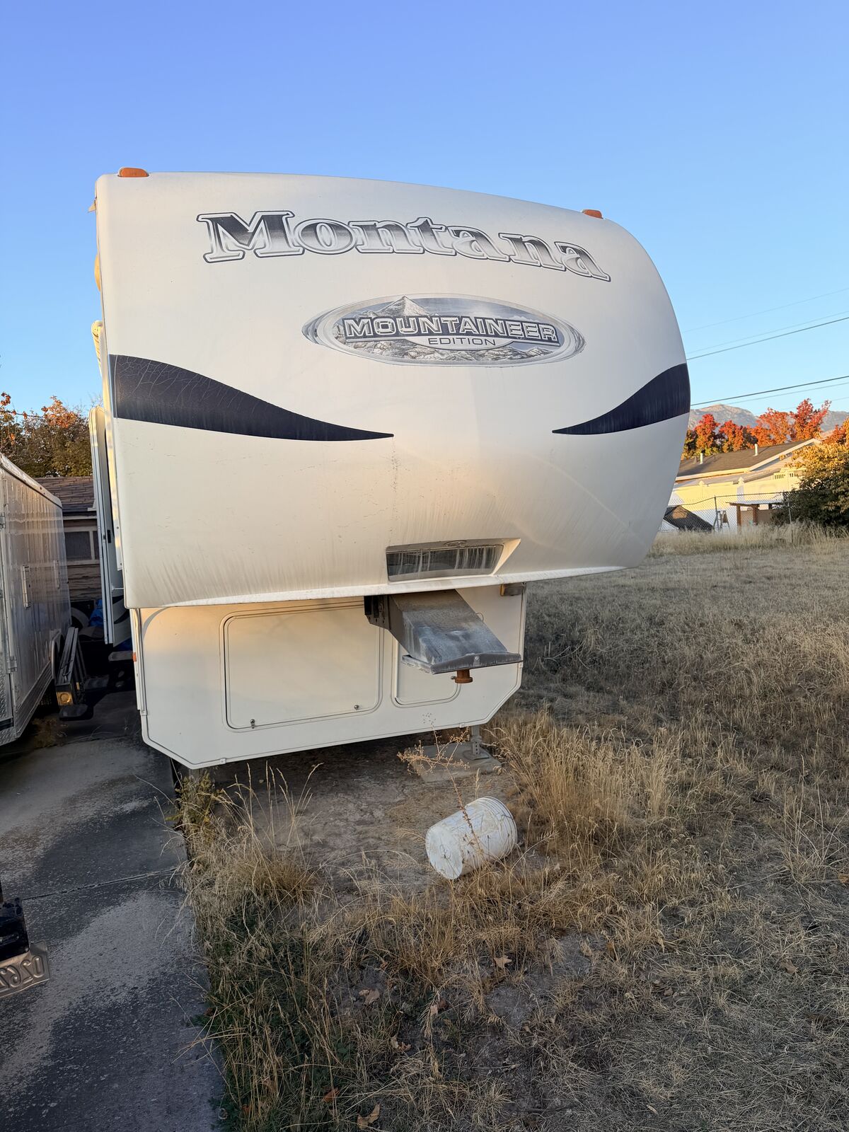 This 2010 Keystone Montana Mountaineer Edition fifth wheel trailer has a dry weight of around 10,000 lbs and a length of approximately 33 feet. The construction is an aluminum frame with fiberglass sidewalls and a walk-on rubber roof. It features two slide-outs (a large slide in the living area and one in the bedroom), power front and rear jacks, a power awning, a 10-gallon gas/electric water heater, 30lb propane tanks, and large front pass-through storage. It has a 70-gallon freshwater tank, an 88-gallon graywater tank, and a 50-gallon blackwater tank. It has a 15,000 BTU auto A/C and a 35,000 BTU heater. The interior features a rear kitchen with an 8cu ft fridge, 3-burner stove w/ oven, microwave, Corian counters, and pull-out faucet. The living area has a freestanding dinette, airbed sofa, two recliners,ceiling fan, TV, and stereo. The Bedroom has a large closet, a washer/dryer prep, and a TV. The bathroom has a porcelain toilet, a nice sink area, a large corner shower, a skylight, and a fan. The trailer has only been on the road a few times. It has mostly just sat in the backyard unused. $17,000 OBO.