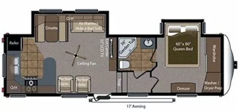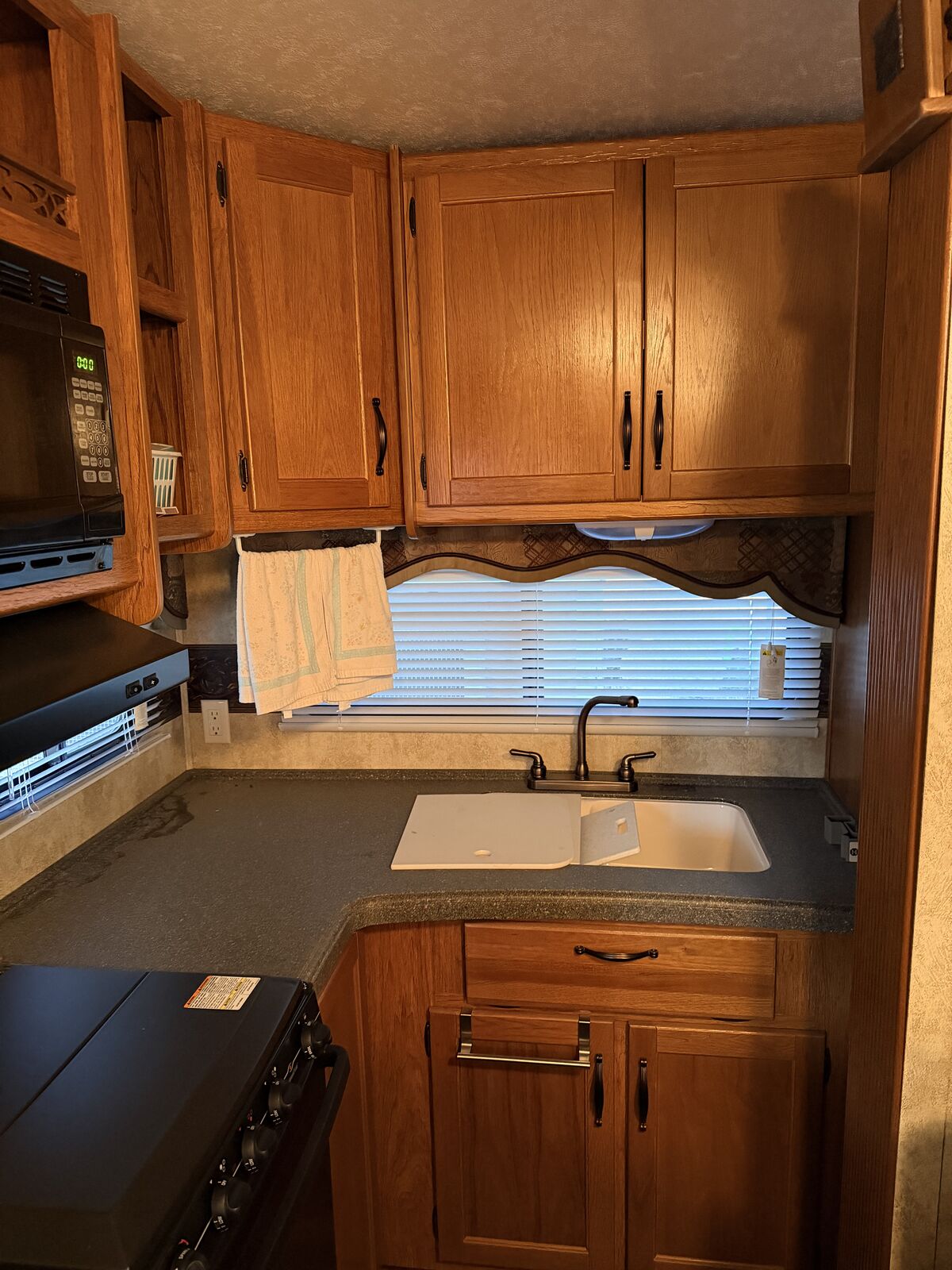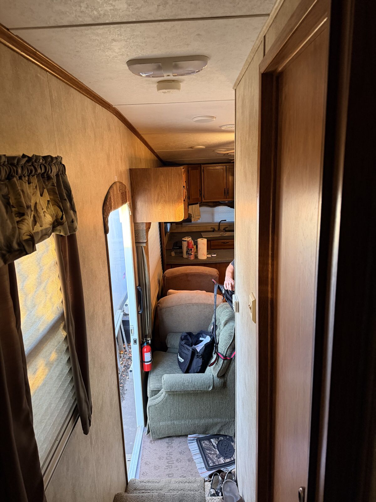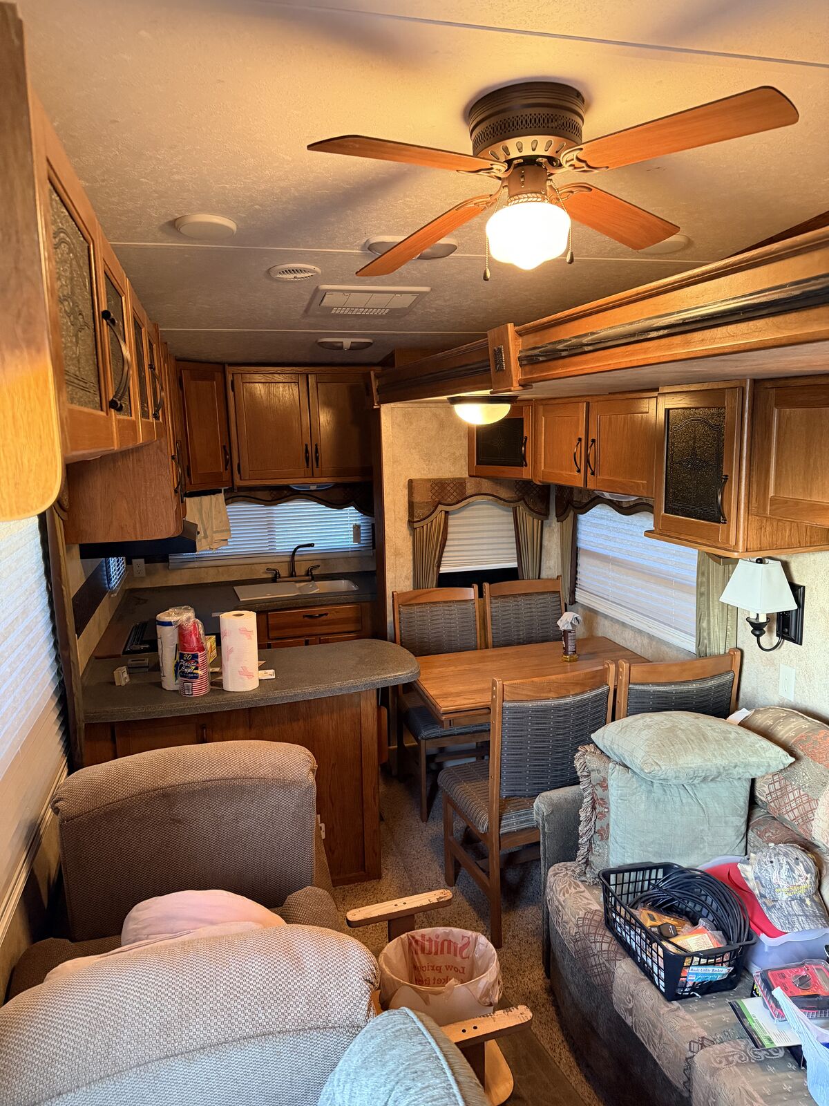 This 2010 Keystone Montana Mountaineer Edition fifth wheel trailer has a dry weight of around 10,000 lbs and a length of approximately 33 feet. The construction is an aluminum frame with fiberglass sidewalls and a walk-on rubber roof. It features two slide-outs (a large slide in the living area and one in the bedroom), power front and rear jacks, a power awning, a 10-gallon gas/electric water heater, 30lb propane tanks, and large front pass-through storage. It has a 70-gallon freshwater tank, an 88-gallon graywater tank, and a 50-gallon blackwater tank. It has a 15,000 BTU auto A/C and a 35,000 BTU heater. The interior features a rear kitchen with an 8cu ft fridge, 3-burner stove w/ oven, microwave, Corian counters, and pull-out faucet. The living area has a freestanding dinette, airbed sofa, two recliners,ceiling fan, TV, and stereo. The Bedroom has a large closet, a washer/dryer prep, and a TV. The bathroom has a porcelain toilet, a nice sink area, a large corner shower, a skylight, and a fan. The trailer has only been on the road a few times. It has mostly just sat in the backyard unused. $17,000 OBO.