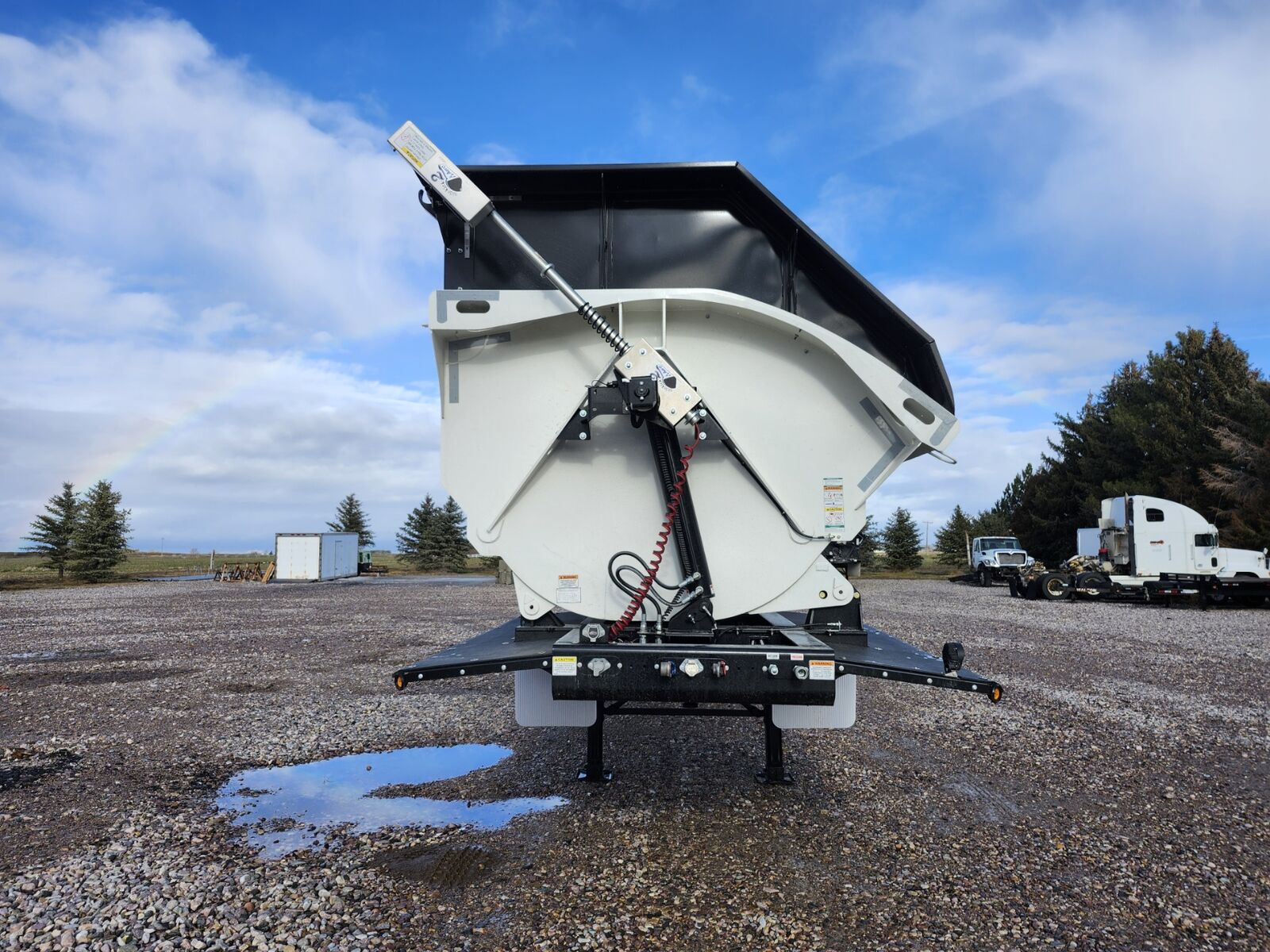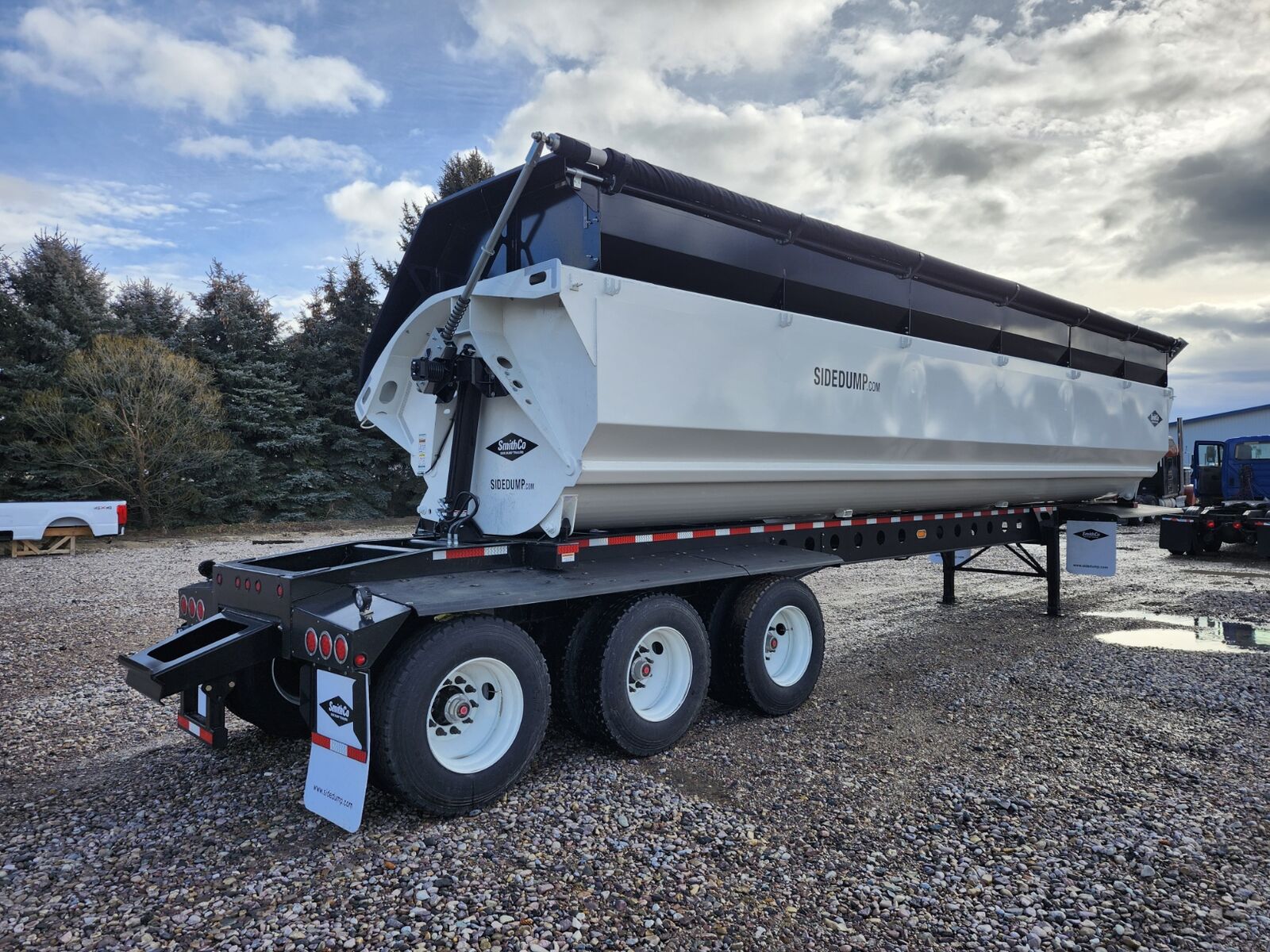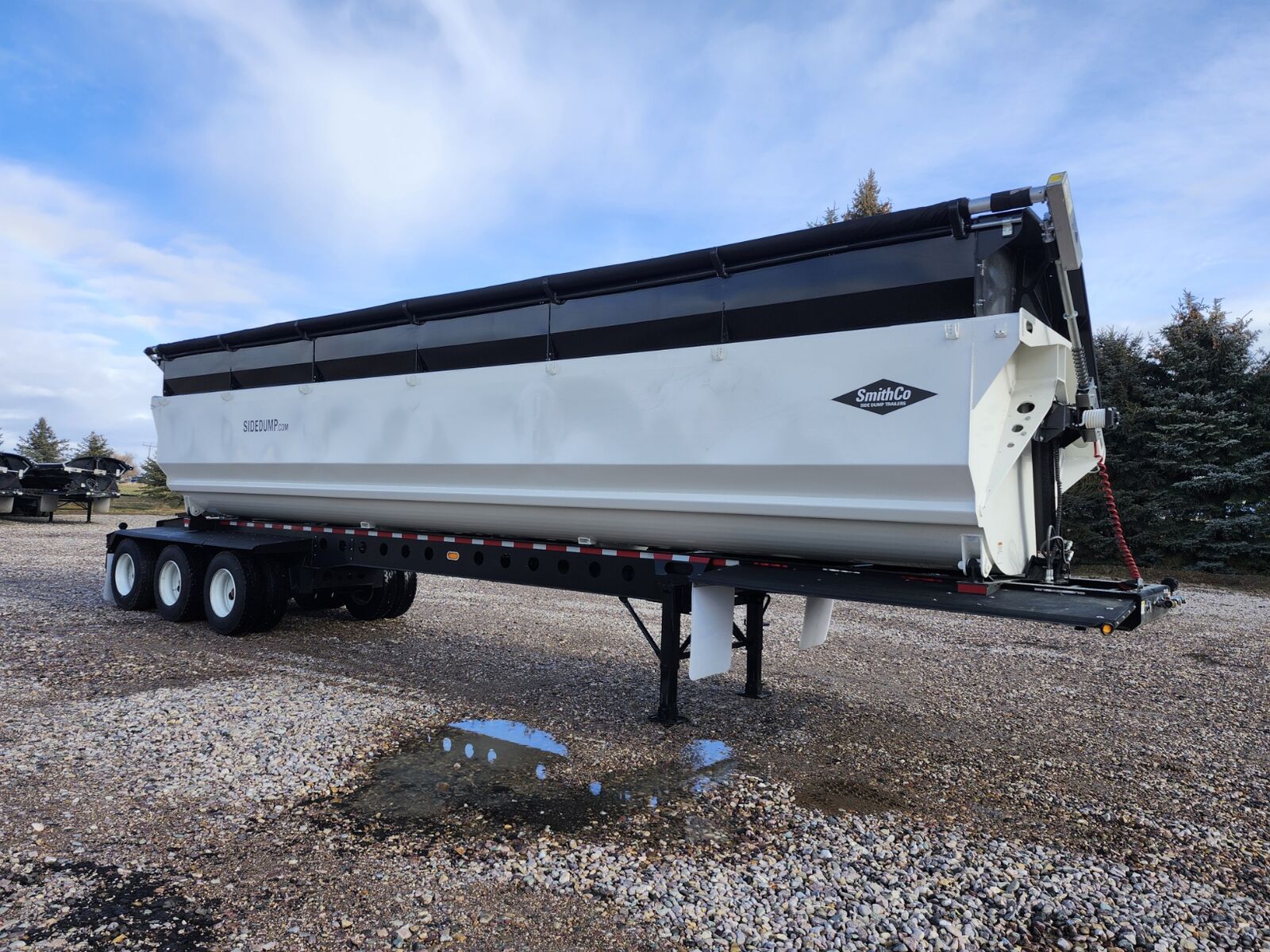 Made in the USA!! 44' trailer with 36' tub, 63.7 cubic yard capacity, 24" Side extensions, 2 speed landing gear, 18" Kingpin setting, Electric roll over tarp, 1/4" AR450 hardened steel tub, Tarp lock-out switch, Push block, Hydraulic valve on trailer, 11R22.5 tires, 54" axle spacing, 3rd lift axle, Requires truck wet kit with minimum 10 gal hydraulic reservoir and 25-30 GPM hydraulic pump, In stock, (Price + FET and sales tax) SMITHCO MHVSR3-44-36