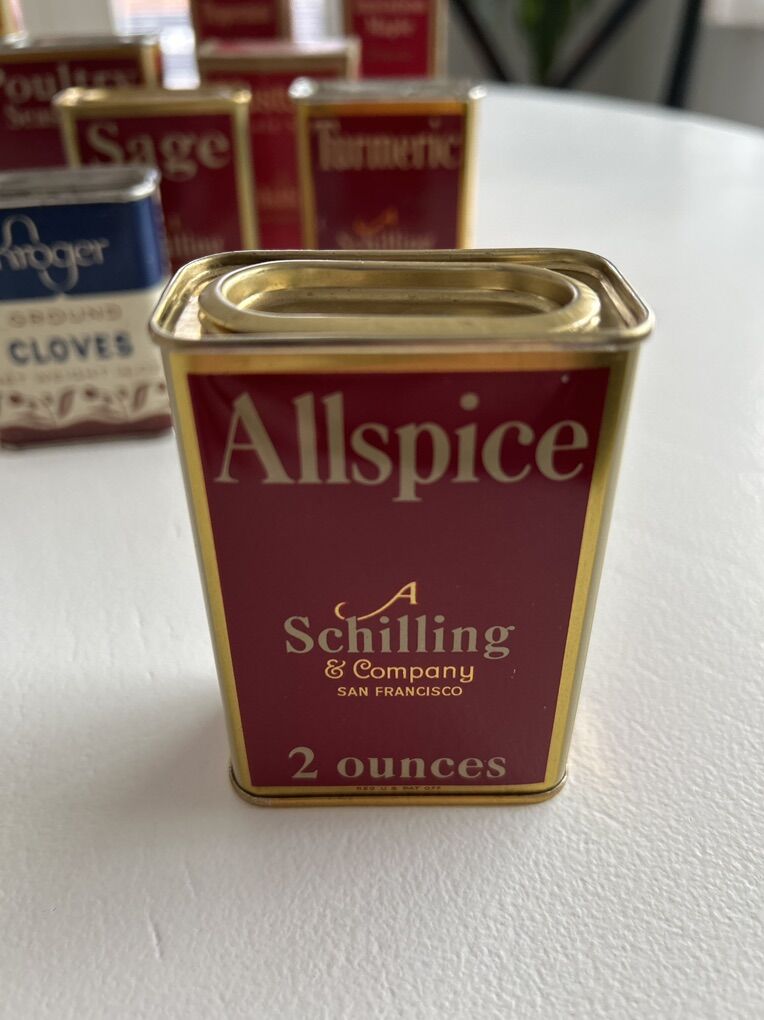 A fun bit of nostalgia to place in your kitchen! I just emptied the remaining contents of these old containers. (Except the liquids which are now mostly solid. And the box of mustard seeds) There was even the ad (pictured) with an old recipe. Sold together for you to enjoy!