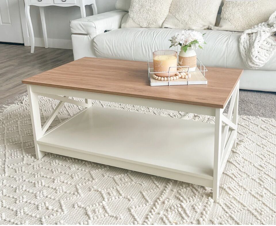 Ivory coffee table features a classic farmhouse style that seamlessly blends into both modern and rustic home decor, adding warmth and comfort to your living room [2 Tier Shelf & Farmhouse Feel] The coffee table size is 39.4D x 21.7W x 17.7H. Perfect for before the sofa or in your living room. The farmhouse color matches with any other furniture and gives a good look to the room [Sturdy & X-shape Design]Side X cross structure the side's X-shaped fixings add extra solidity and load capacity to this table. Perfect for resting a tray of drinks, a favorite magazine, or an eye-catching floral display [Waterproof & Easy to Clean] Smooth and flat surface is easy for you to clean with damp or dry cloth. The coffee table is made of high-quality materials, P2 class MDF and natural pine wood with paint coating, water-resistant, durable, solid and with high weight capacity. These selected materials make sure that the table will do no harm to your health [Easy Assembly]The coffee table come with clear instructions for easy and hassle-free assembly. You can have them set up and ready to use in no time.