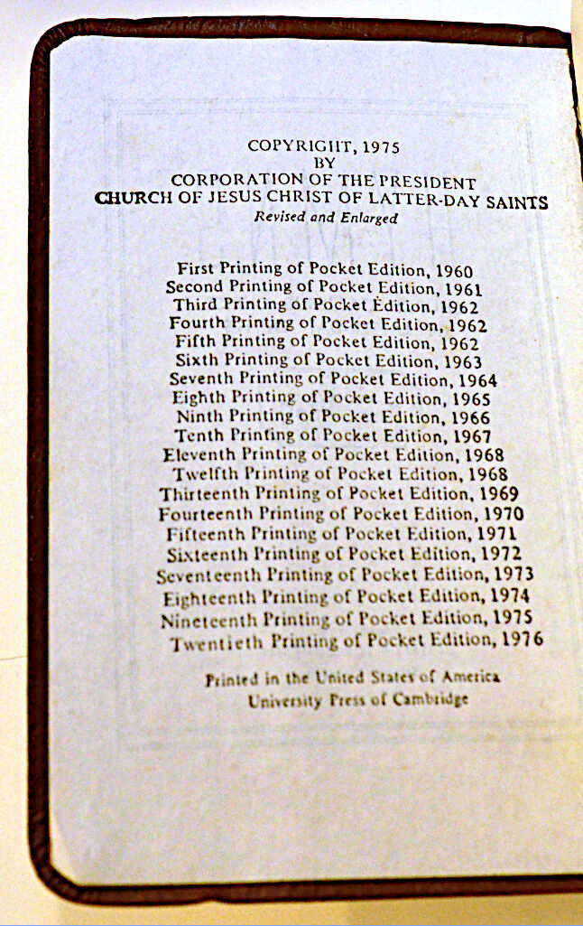 This pocket hymnbook is the 1975 edition. There are no visible markings on any pages or the flyleaves. Spine is slightly cracked at inside bottom.