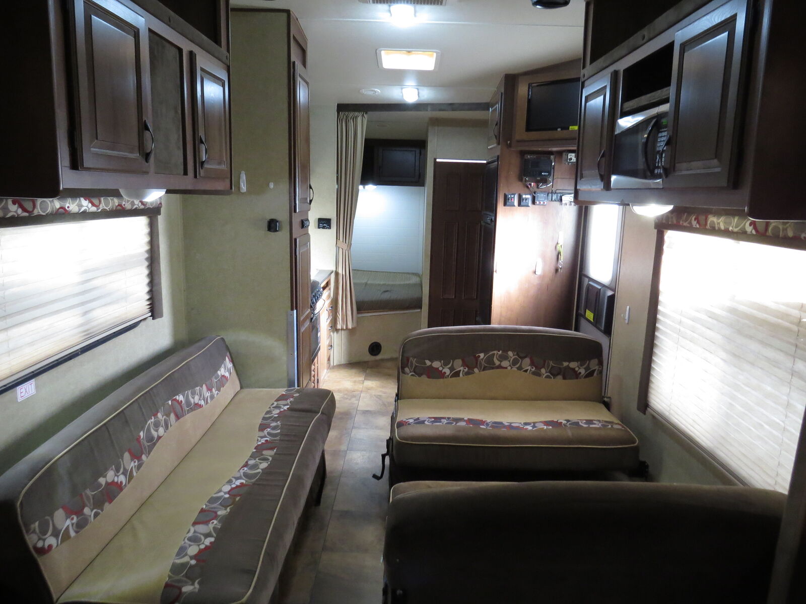 15' Garage Space!, Onan Generator 4000 Watt, Front Corner bed, Double Electric rear Beds, Couch & Dinette Make down to beds, Corner bathroom, Kitchen, Electric patio awning, Fiberglass Exterior, A/C unit and Heat. Location: 50 S Frontage Rd, Springville Dealer#832B Quality RV -Financing Available-