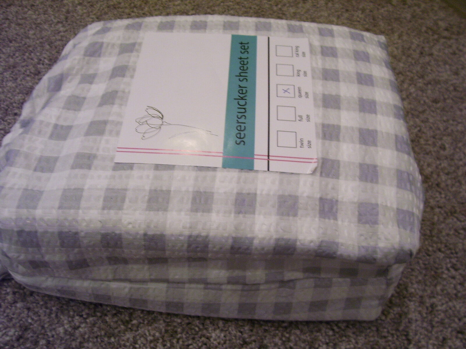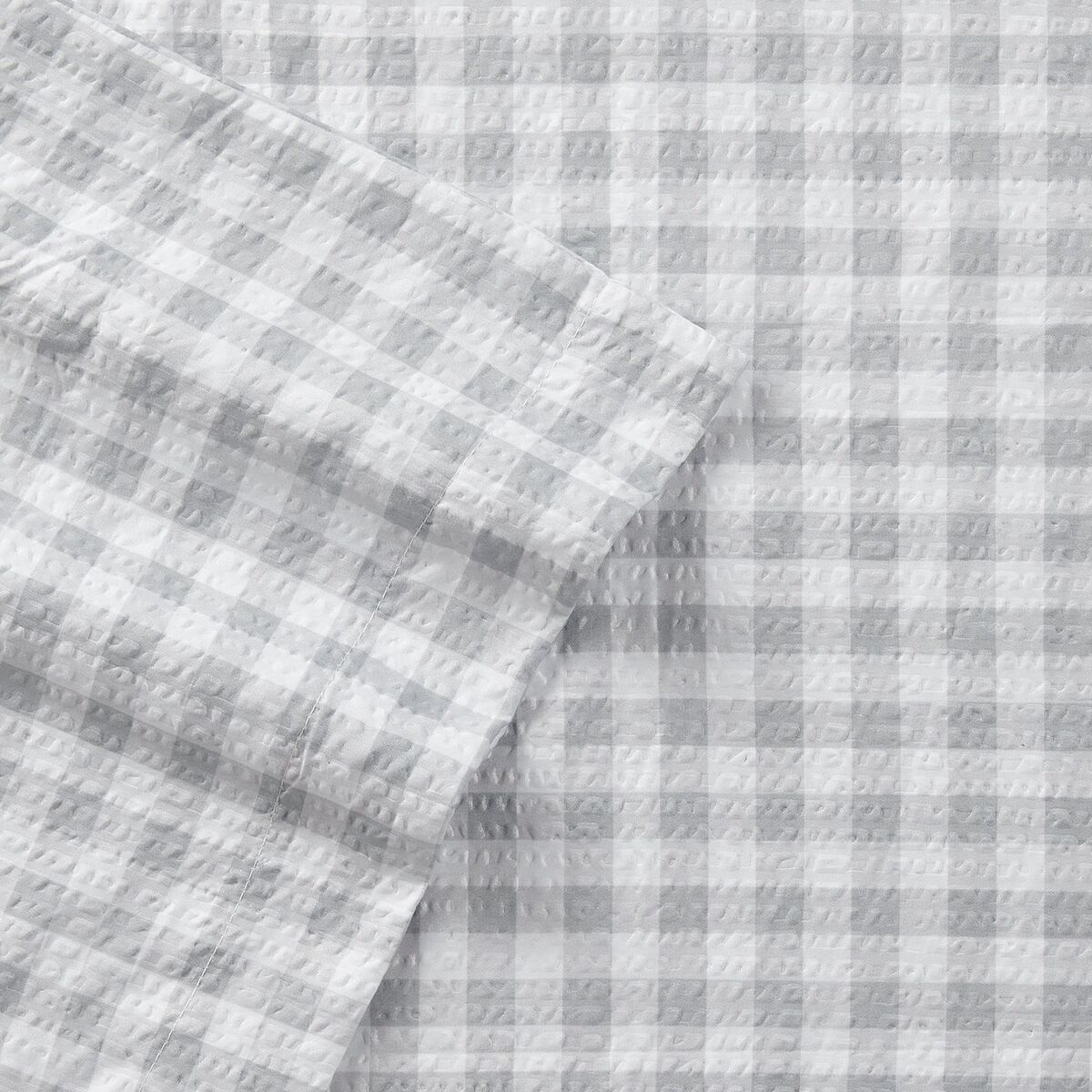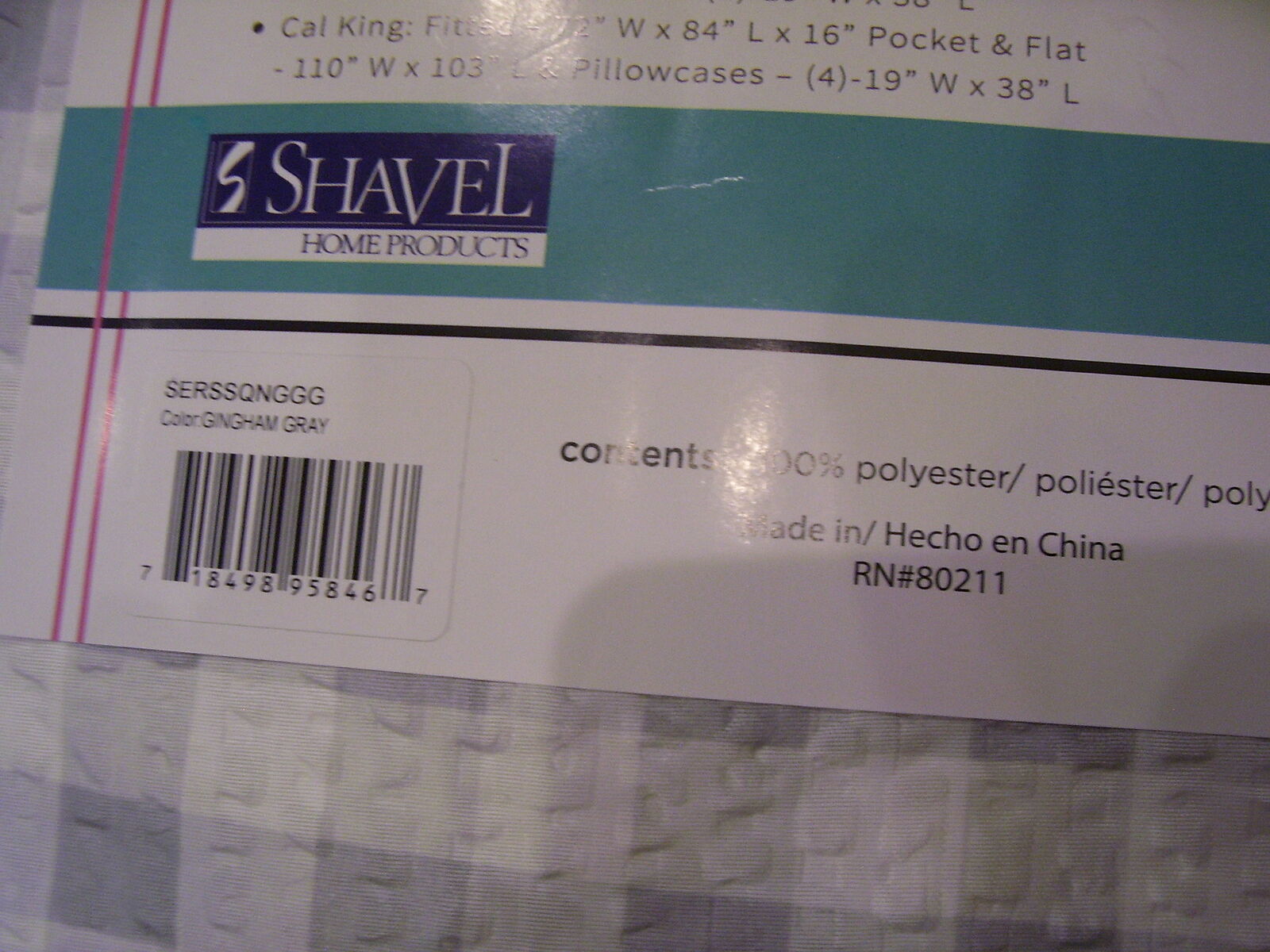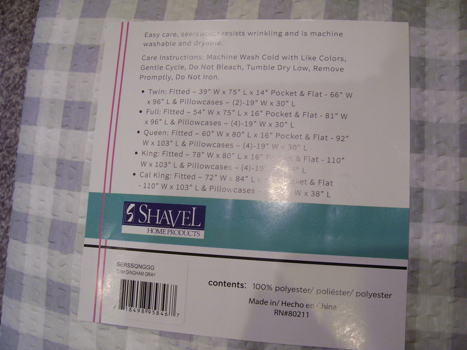 Gray and White Gingham checkered plaid polyester fabric. Shavel Home Brand. Includes 1- Fitted sheet, 1- Flat sheet, and 4-pillowcases. These are lightweight and soft. Perfect for any bedroom, guest room, RV, or camper.