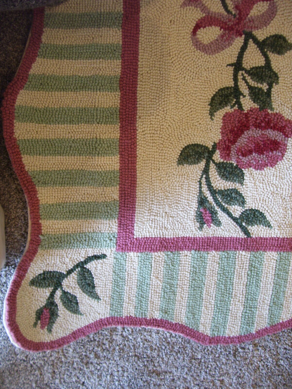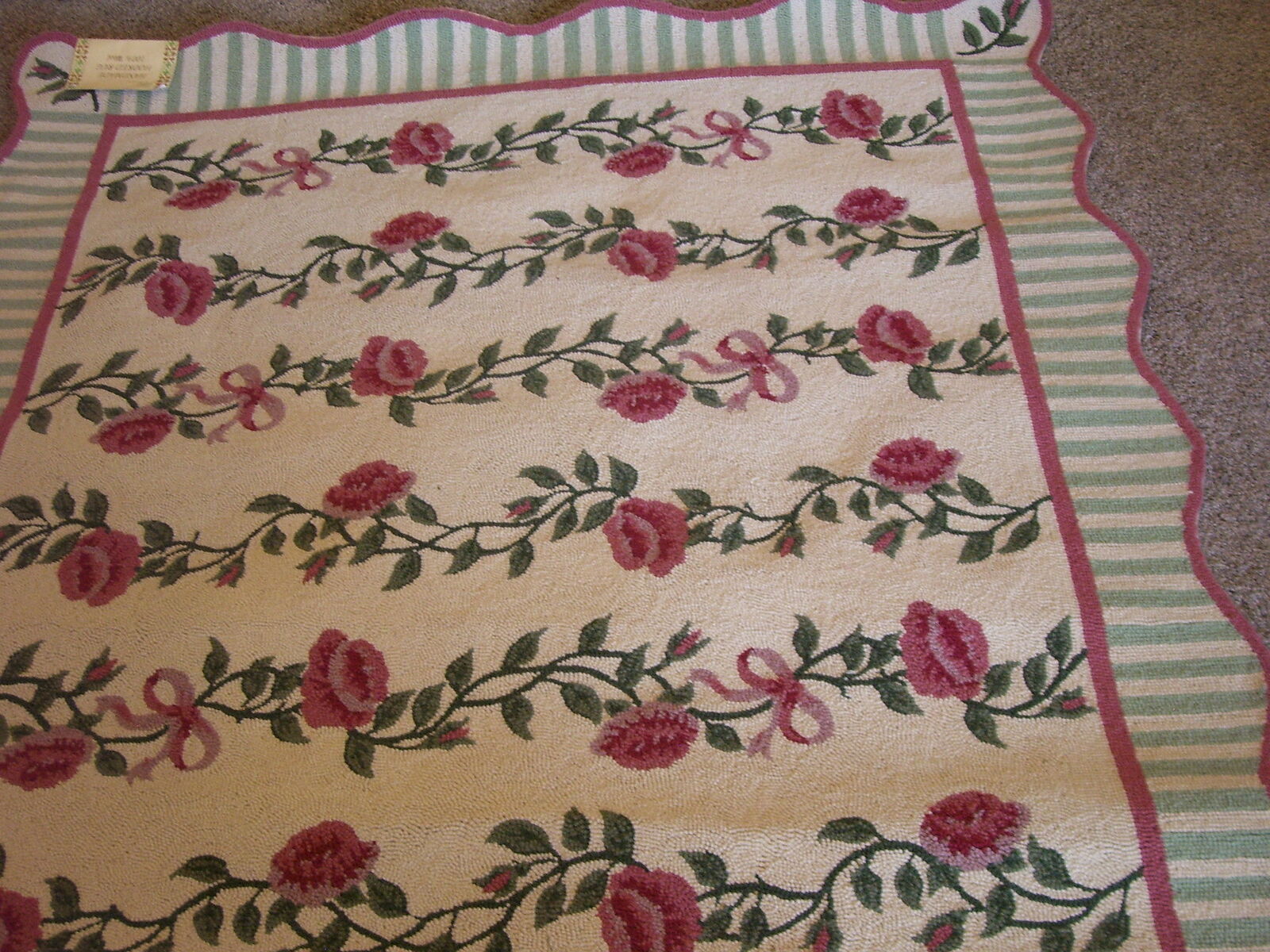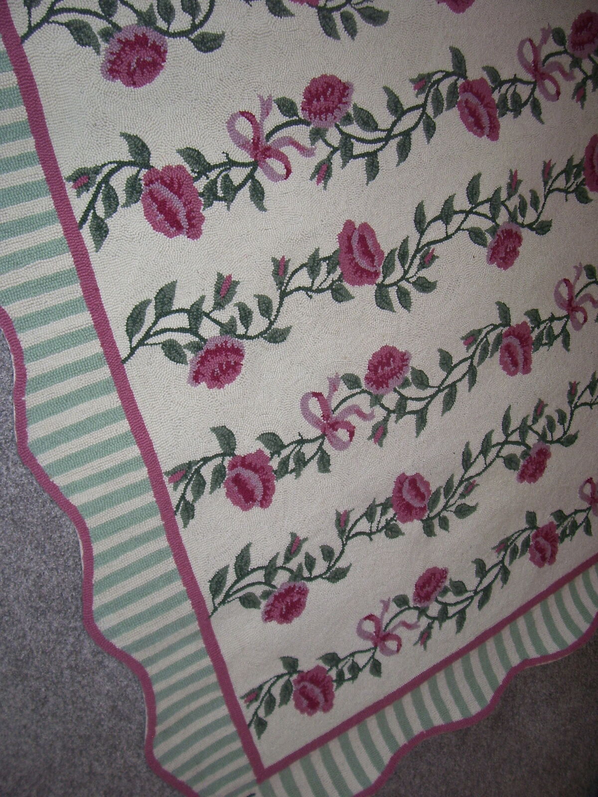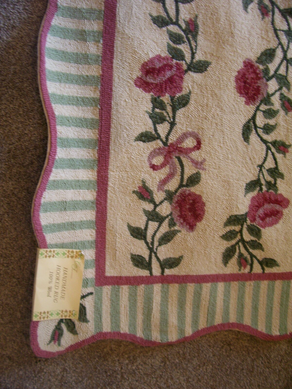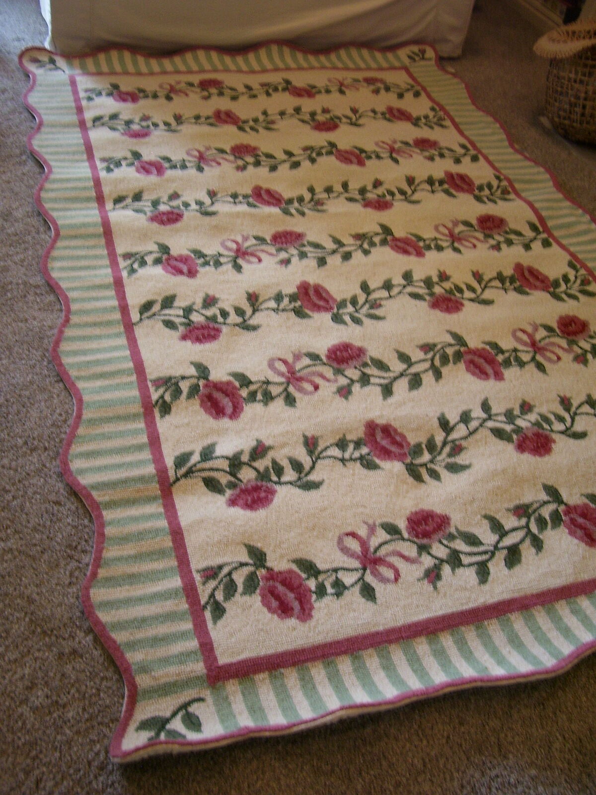Perfect for a little or big girl's room, Mom's room, Living, Bedroom, under Kitchen table, or anywhere. I love the Scalloped edge with green stripes. Perfect finishing touch for the pink flowers and ribbon bows. The background is cream, ivory, off white neutral color. It can go with many styles: Shabby Chic, Feminine, Victorian, Girlie, Princess, Diva, or a fun touch to brighten up a simple room.